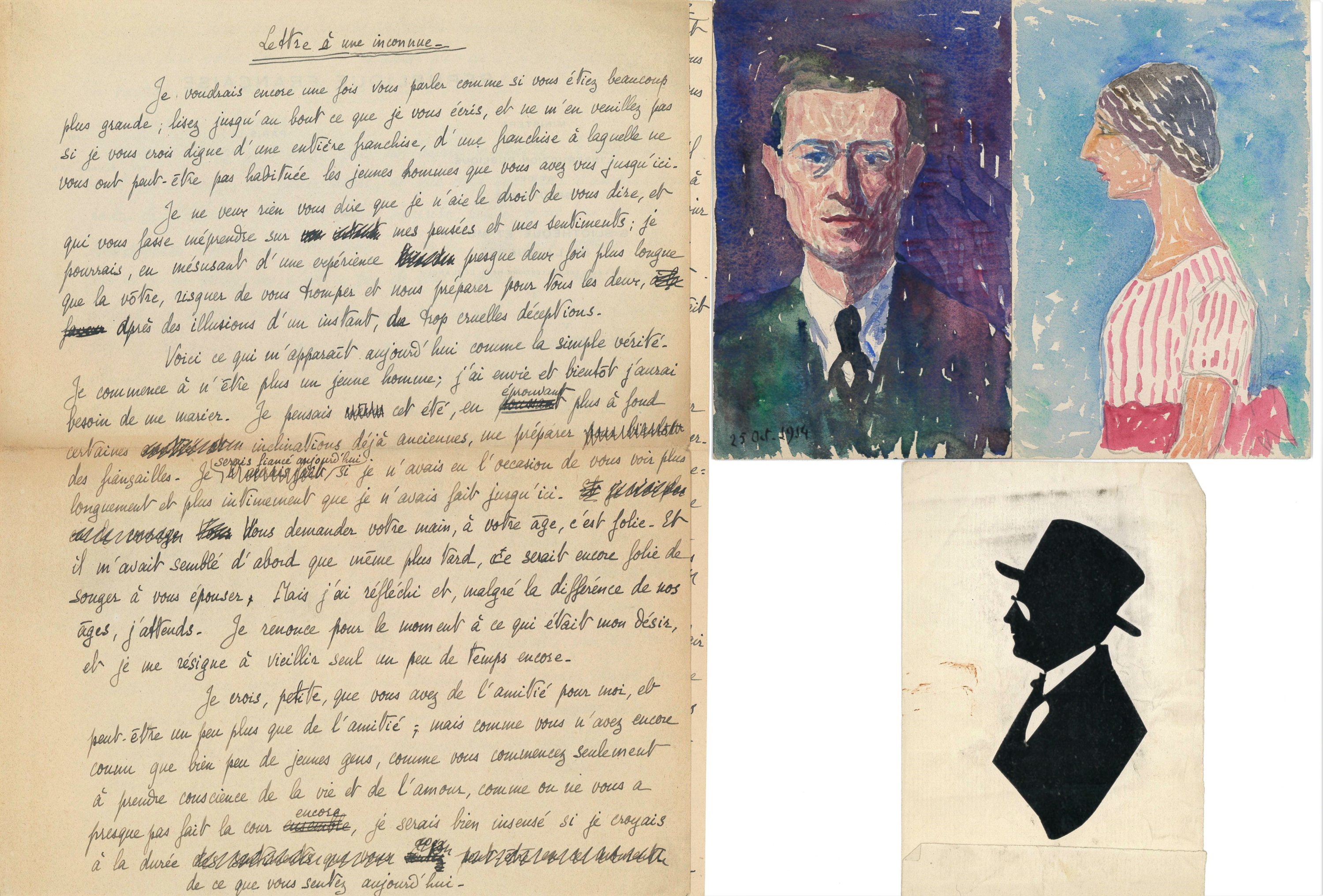 - 2 brouillons manuscrits: « Lettre à une inconnue », 2 pages in-4, 16 septembre 1920, et « Sur les couples bien assortis », 1 page in-4 ;