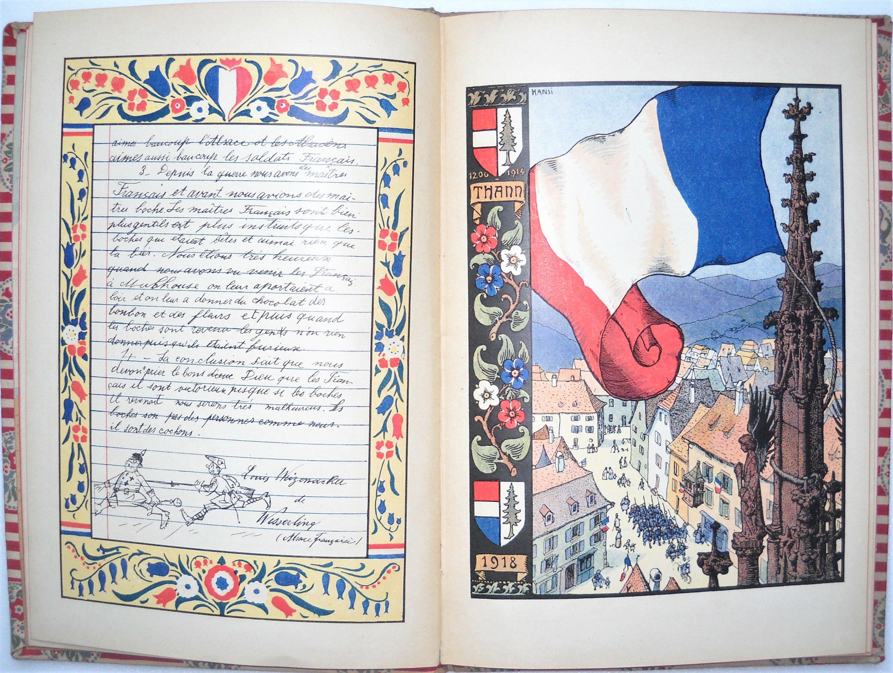 HANSI [Jean-Jacques WALTZ dit], Le Paradis tricolore. Petites villes de l'Alsace déjà délivrées, un peu de texte et beaucoup d'images pour les petits enfants alliés, Paris, Floury, [1918], rel. in-4, couv. entoilée avec étiquette de titre en couleurs avec bandeau de fleurs bleu-blanc rouge sur le premier plat. Édition originale ornée de 36 planches colorées.