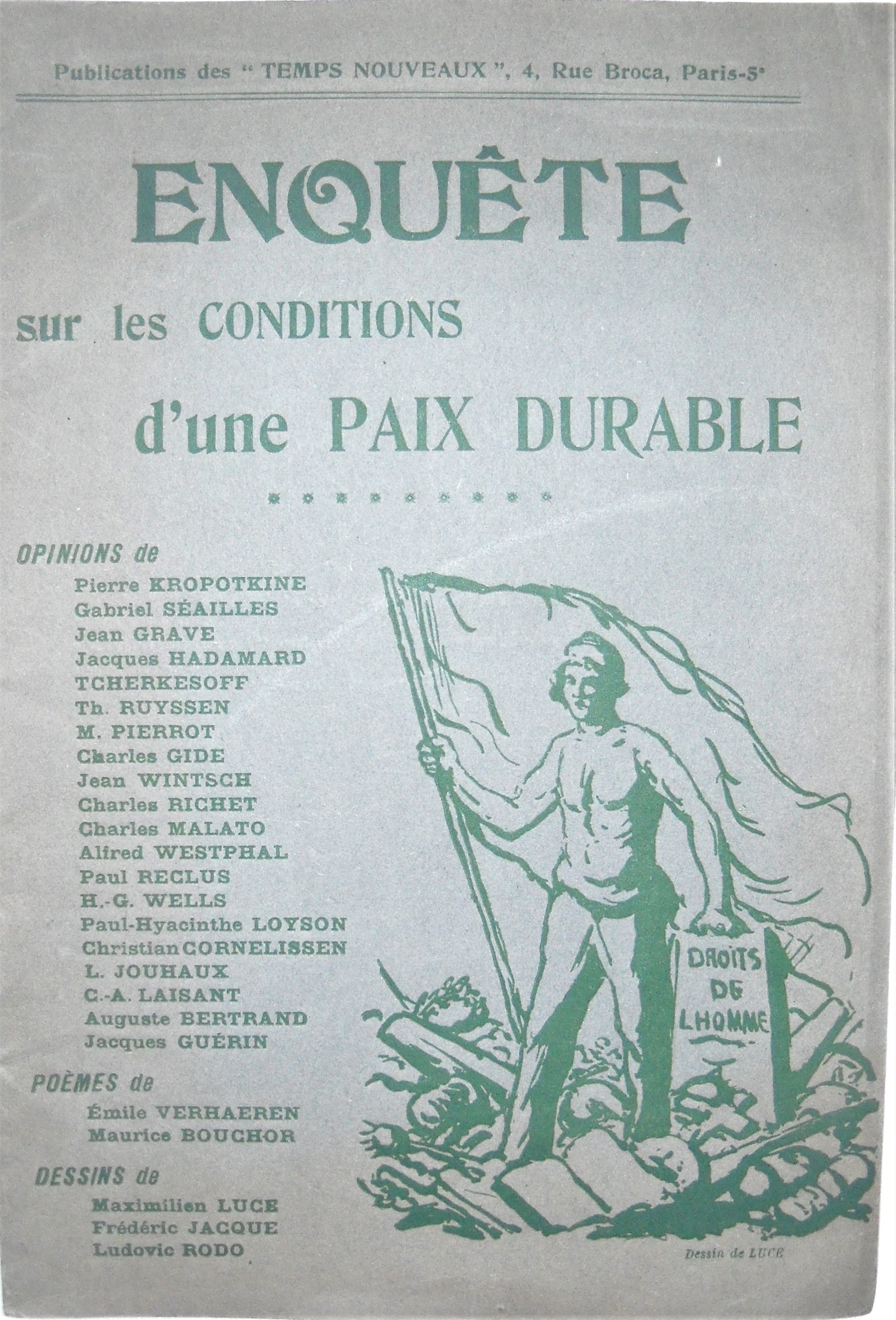 Enquête sur les conditions dune paix durable, publications des Temps Nouveaux, 1917, plaquette in-8, 50 pages.
