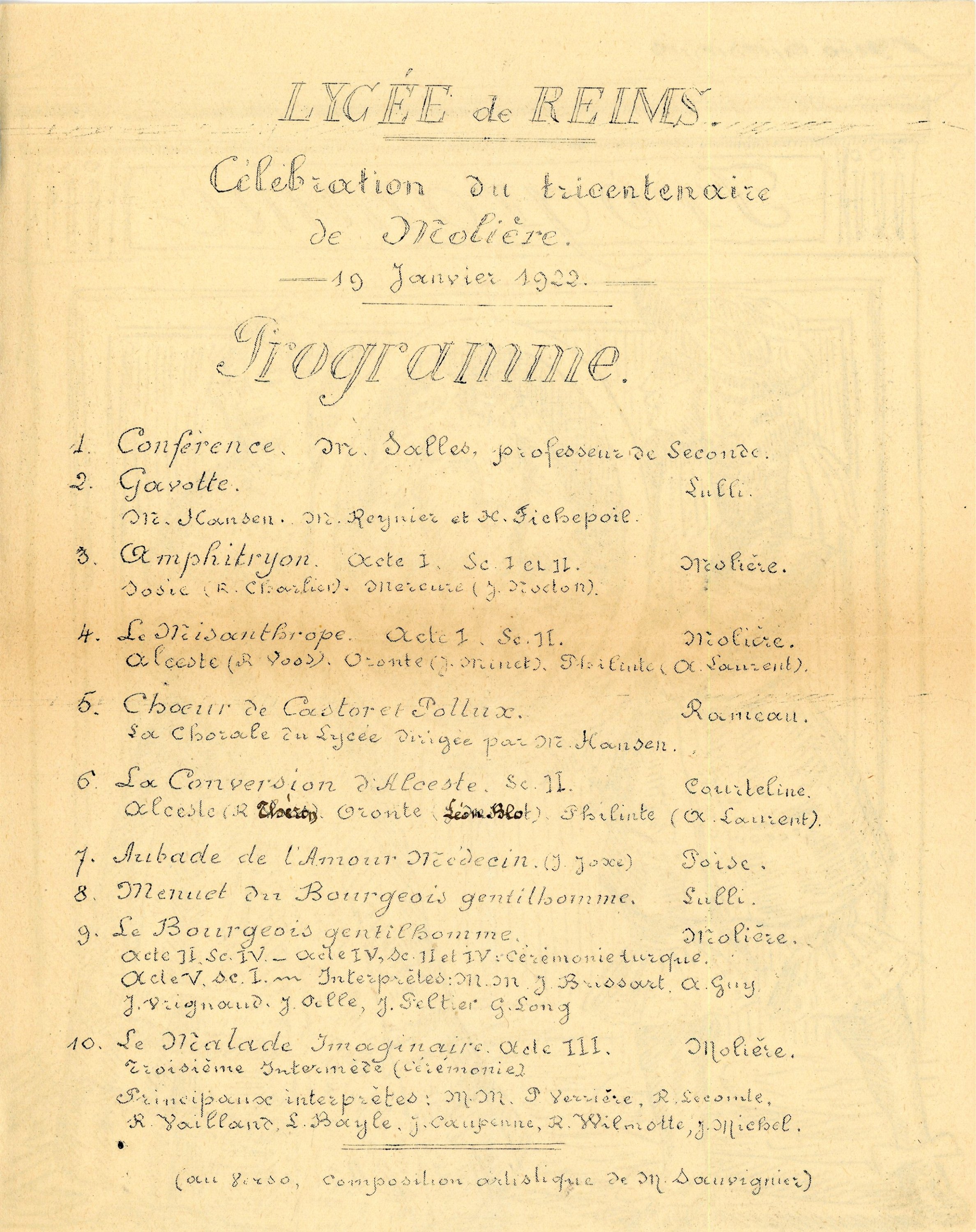 - Célébration du tricentenaire de Molière, 19 janvier 1922: programme illustré en couverture par une caricature de R.M. en médecin apothicaire, croquis des costumes, listes des costumes empruntés par les élèves avec leurs signatures dont celles de Roger Lecomte et Roger Vailland ;