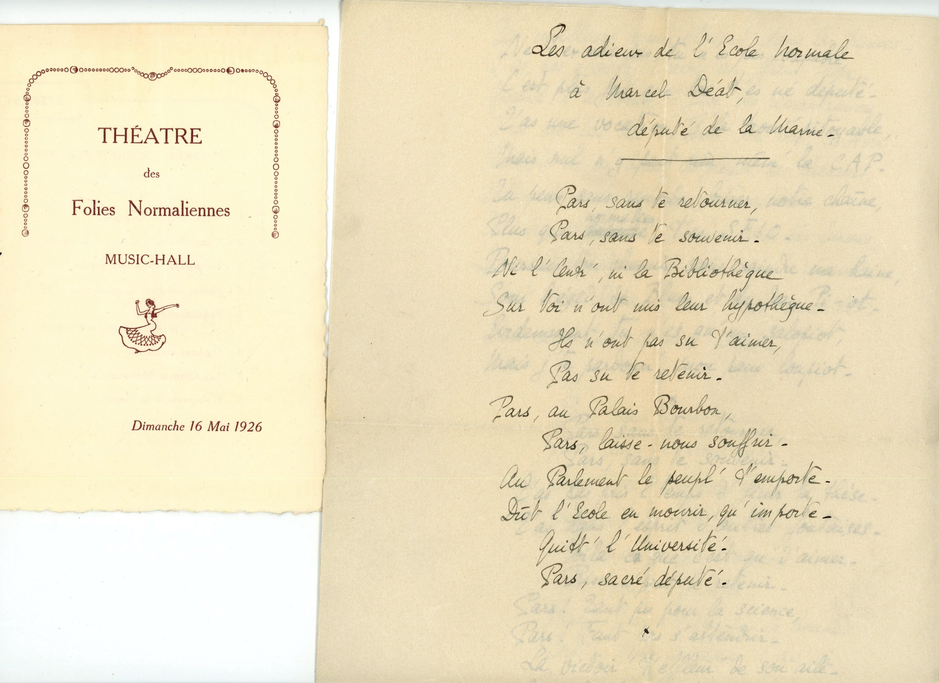 - Spectacles et représentations théâtrales annuels des normaliens, 1924-1928: programmes, tirades, chants, coupures de presse, photographies ;