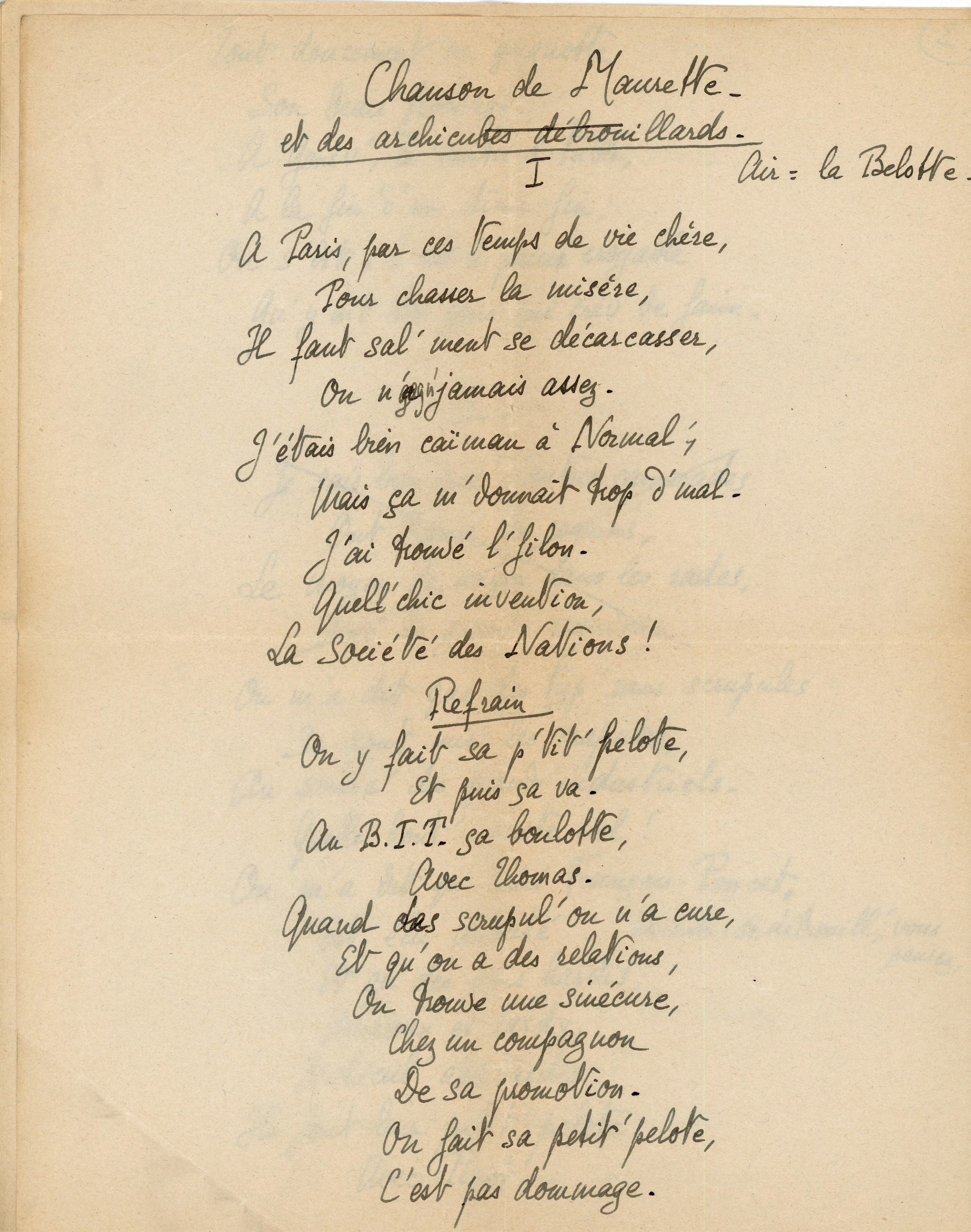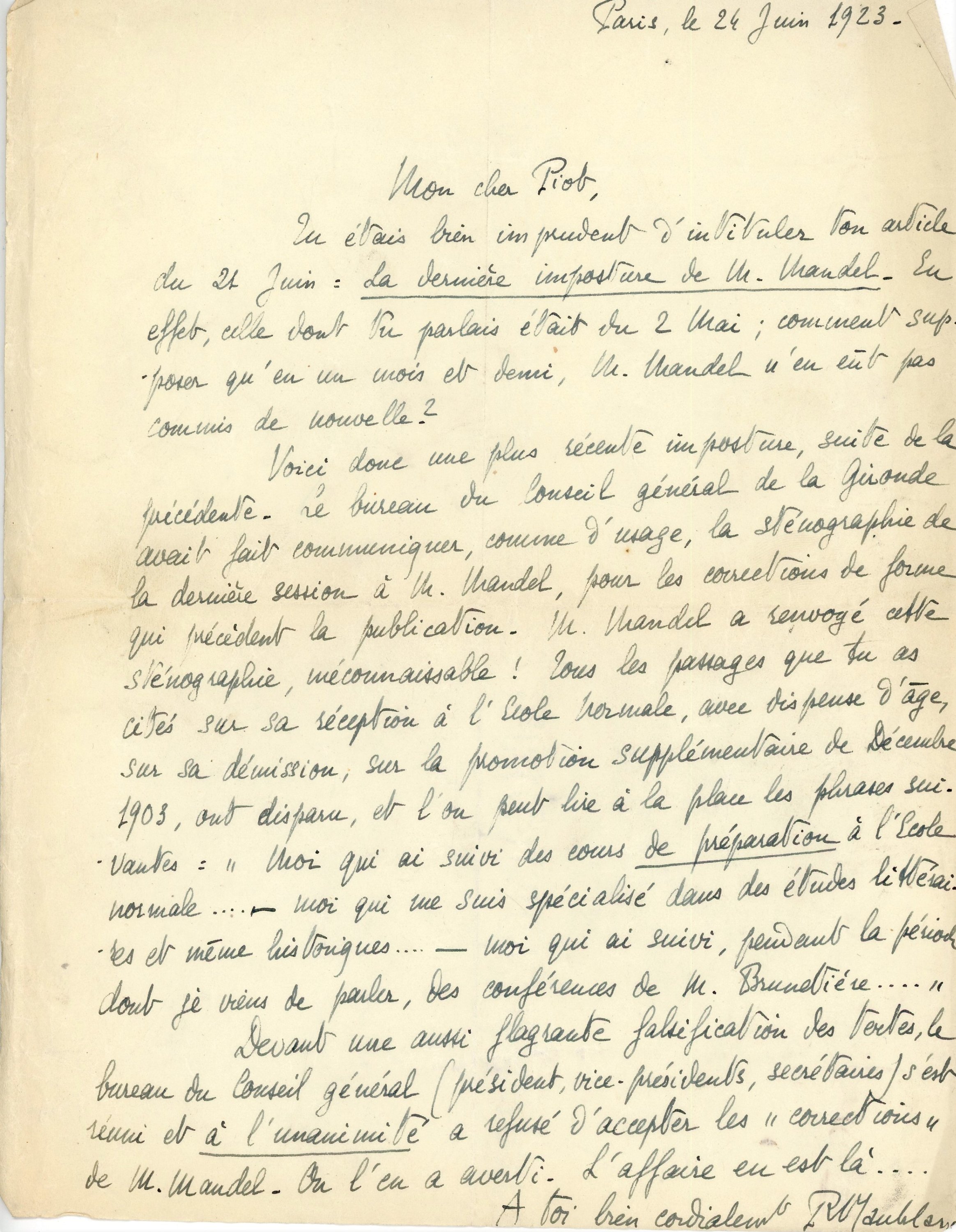 - « Le pot Mandel », manuscrit de larticle paru dans le bulletin de la Société des Amis de lE.N.S. en janvier 1924 ;