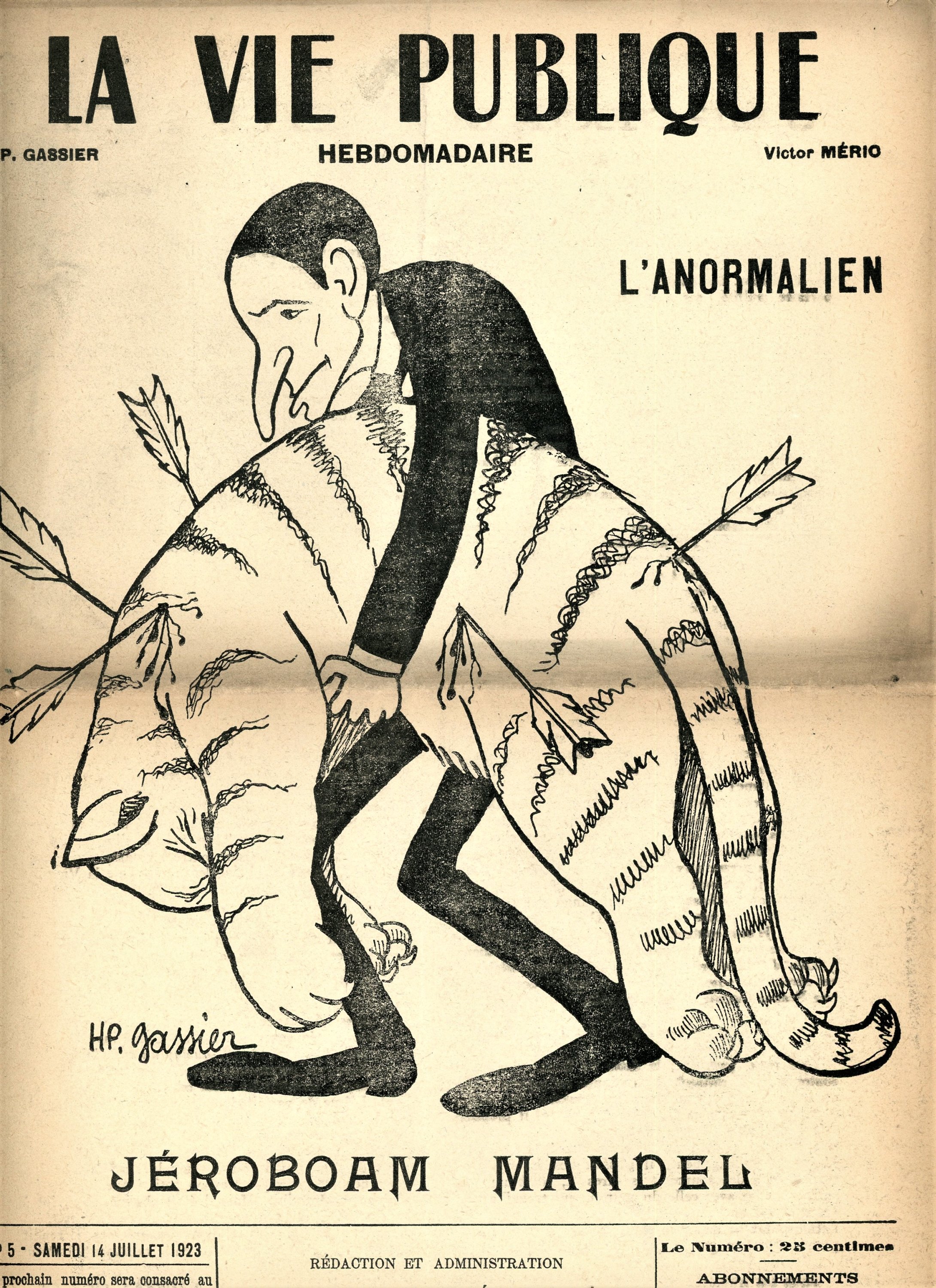 - Coupures de presse dont article « Un fameux mensonge » signé par R.M. et paru dans le journal LEclaireur de lEst le 18 juillet 1923. ; n°5 de lhebdomadaire « La Vie Publique » du 14 juillet 1923, publiant à la Une une caricature de Mandel « Jéroboam Mandel lanormalien » ;