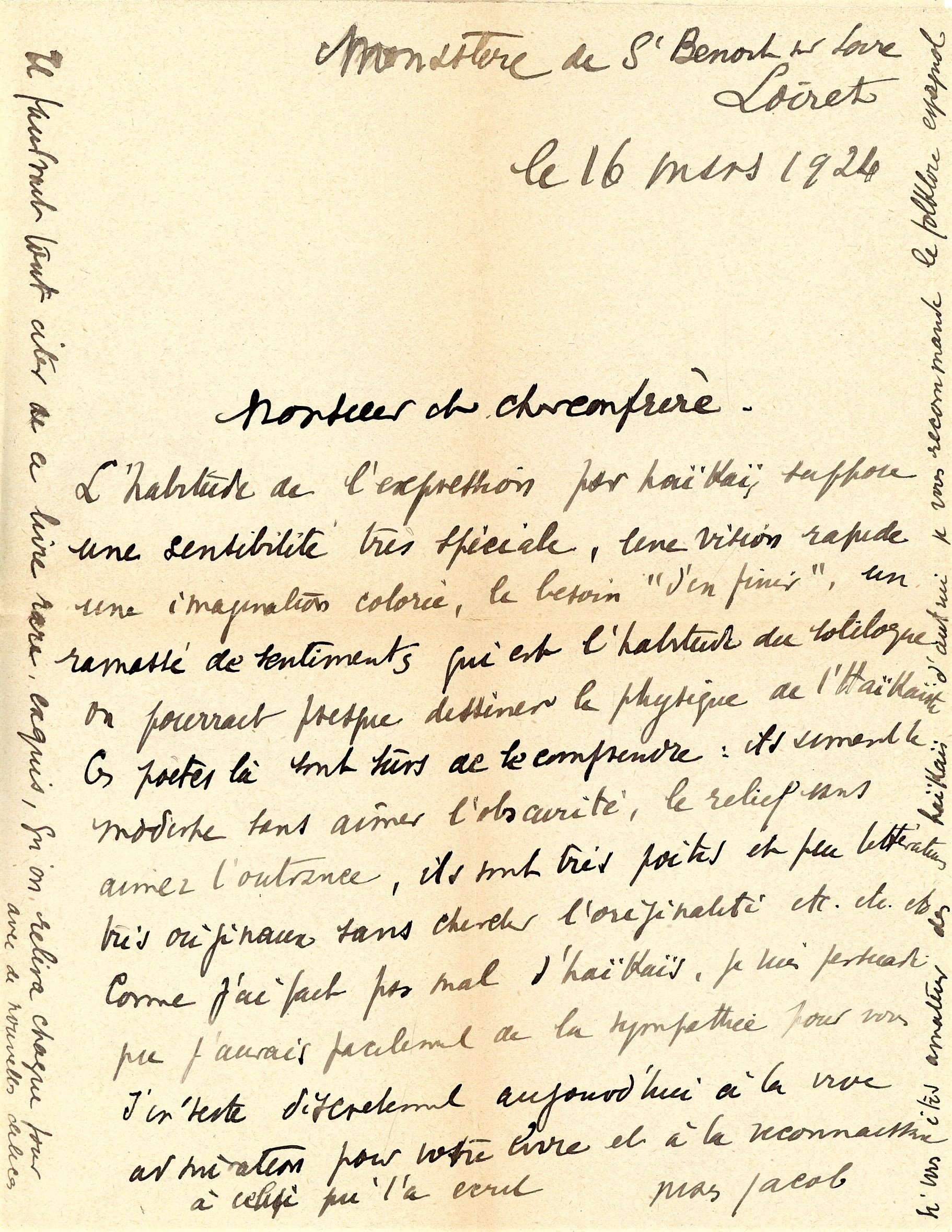 « Monastère de St Benoît sur Loire Loiret, le 16 mars 1924 Monsieur et cher confrère, lhabitude lexpression par haïkaï, suppose une sensibilité très spéciale, une vision rapide, une imagination colorée, le besoin «en finir», un ramassé de sentiments (