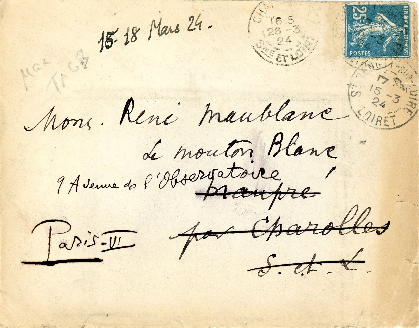 Belle L.A.S., 16 mars 1924, avec enveloppe annotée au dos, Max Jacob faisant part de son admiration à René Maublanc pour sa publication «haï-kaï» en 1924: