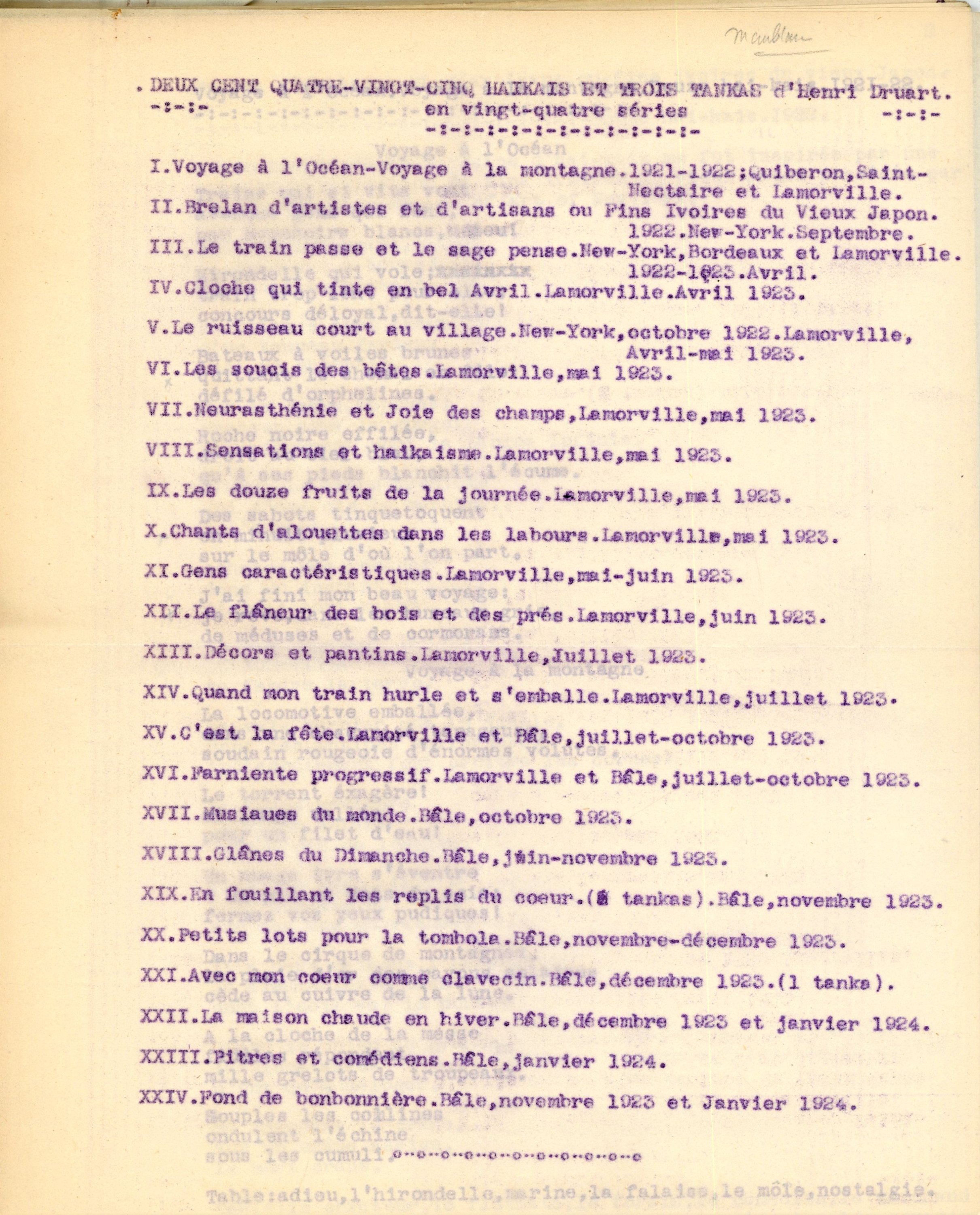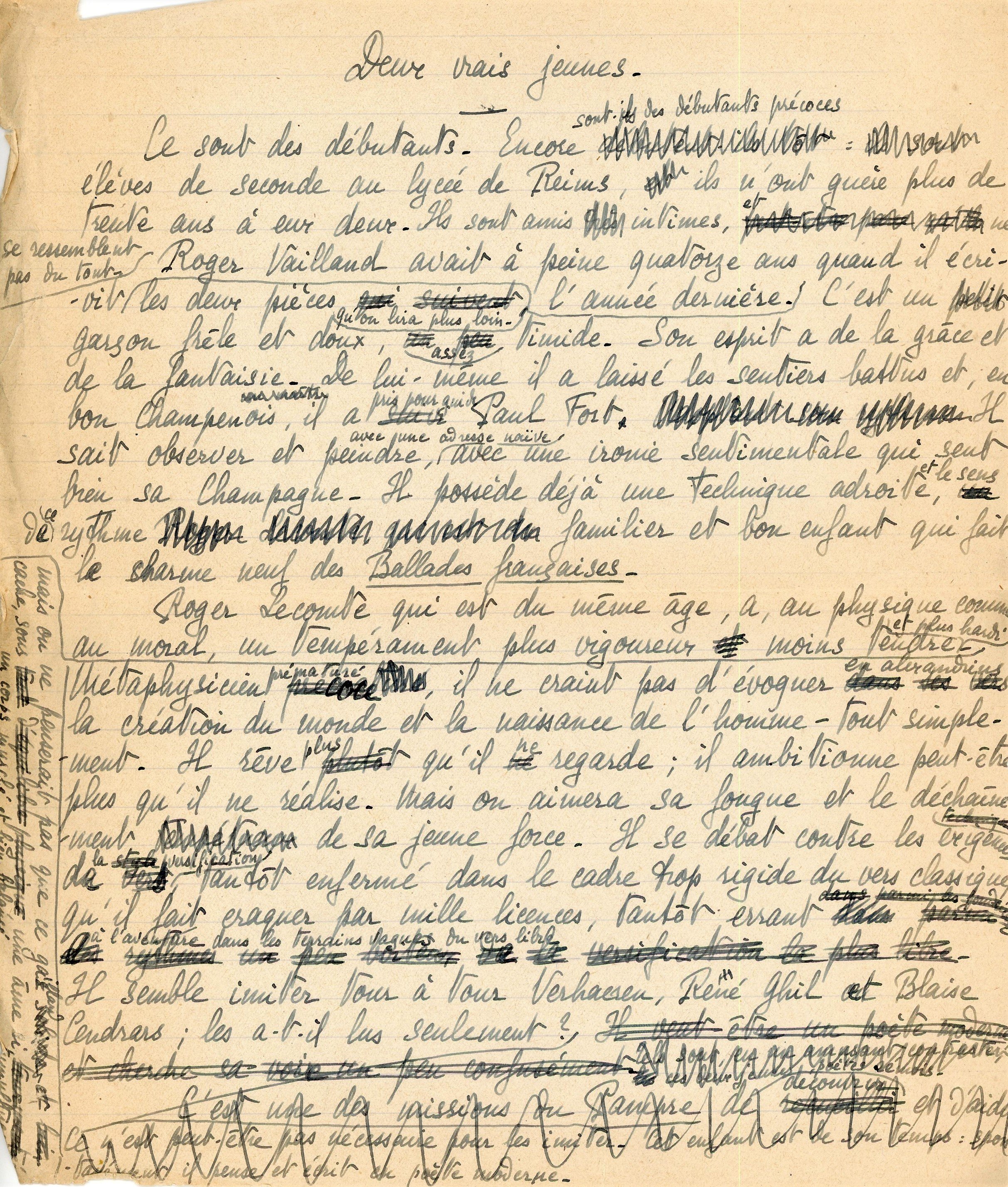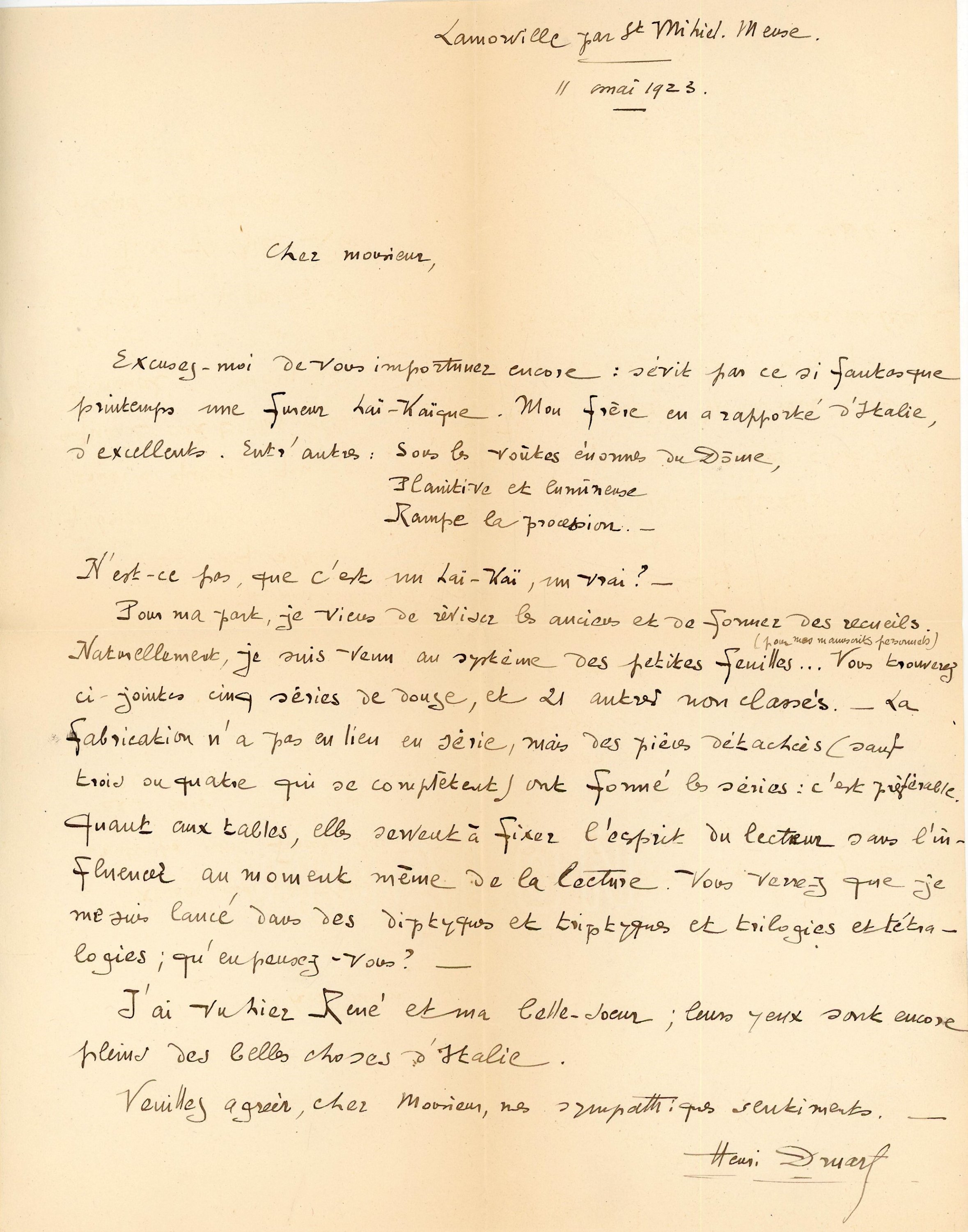 Lot de 40 pièces, dont:- 26 L.A.S., 4 L.S., 3 P.A.S., et 2 faireparts, avec enveloppes, 1922-1932, y relatant premières parutions des poésies de Roger Gilbert-Lecomte et de Roger Vailland ;- Tapuscrit de 15 pages in-4 de haïkaï composés par René Druart ; - « Grattements sur Trois cordes », 24 séries de 285 haï-kaï et 3 tankas, composés par Henri Druart, 1922-1924, 40 pages in-4 dactylographiées ;- 7 pages manuscrites de haïkaï composés par Henri Druart en 1921-1922 ;- Brouillon manuscrit « Deux vrais jeunes » par René Maublanc, 1 page ½ in-4, et publié dans la revue du Pampre en introduction des deux poèmes de Roger Lecomte et Roger Vailland ;- Coupure de presse de la Dépêche du Nord-Est du 4 mai 1922 sur le mouvement littéraire « Le Pampre ».PLUS DE DESCRIPTIONS DANS LE CATALOGUE DE LA VENTE SUR ROUILLAC.COM SOUS LONGLET /CONSULTER LES DETAILS DE LA VENTE/
