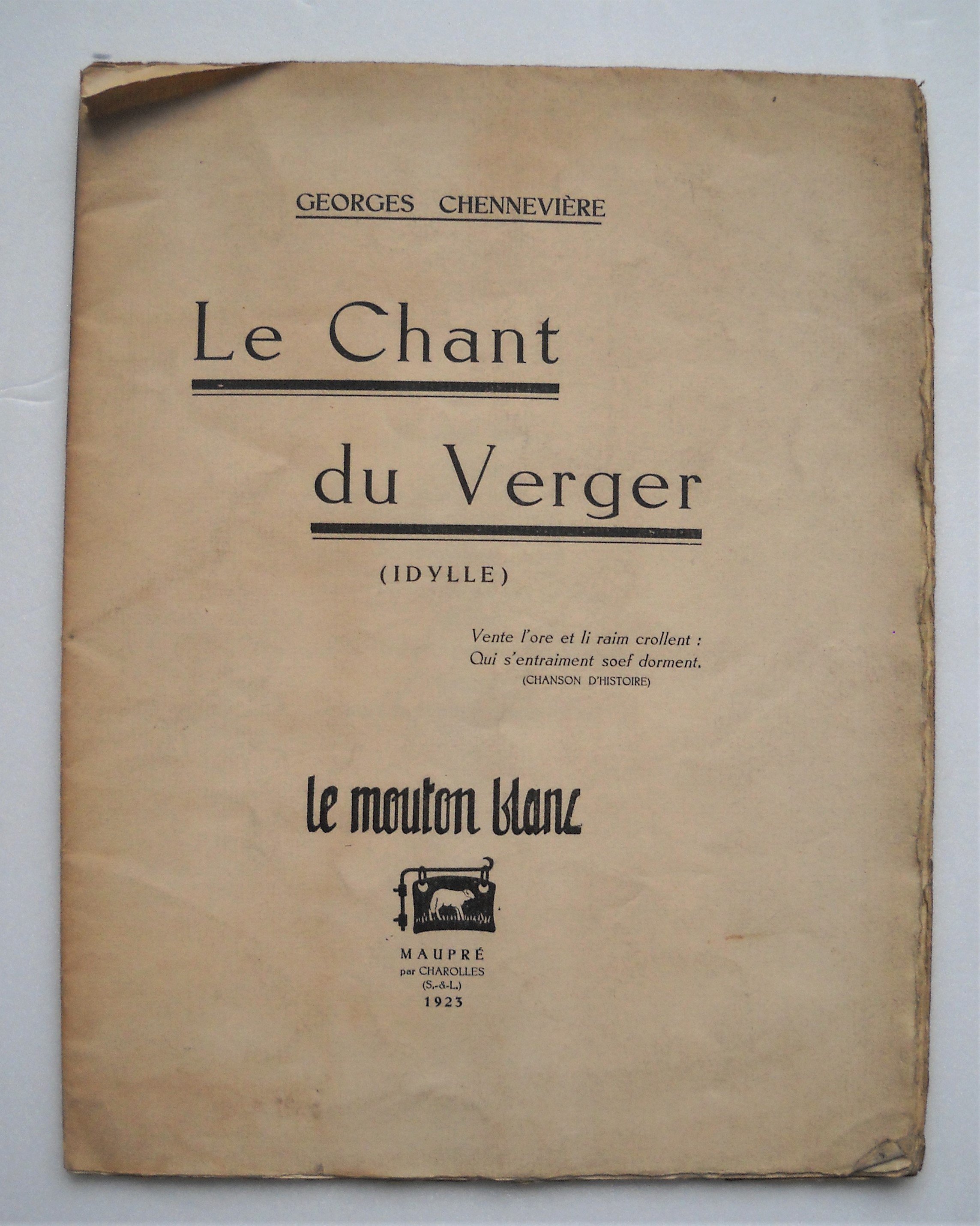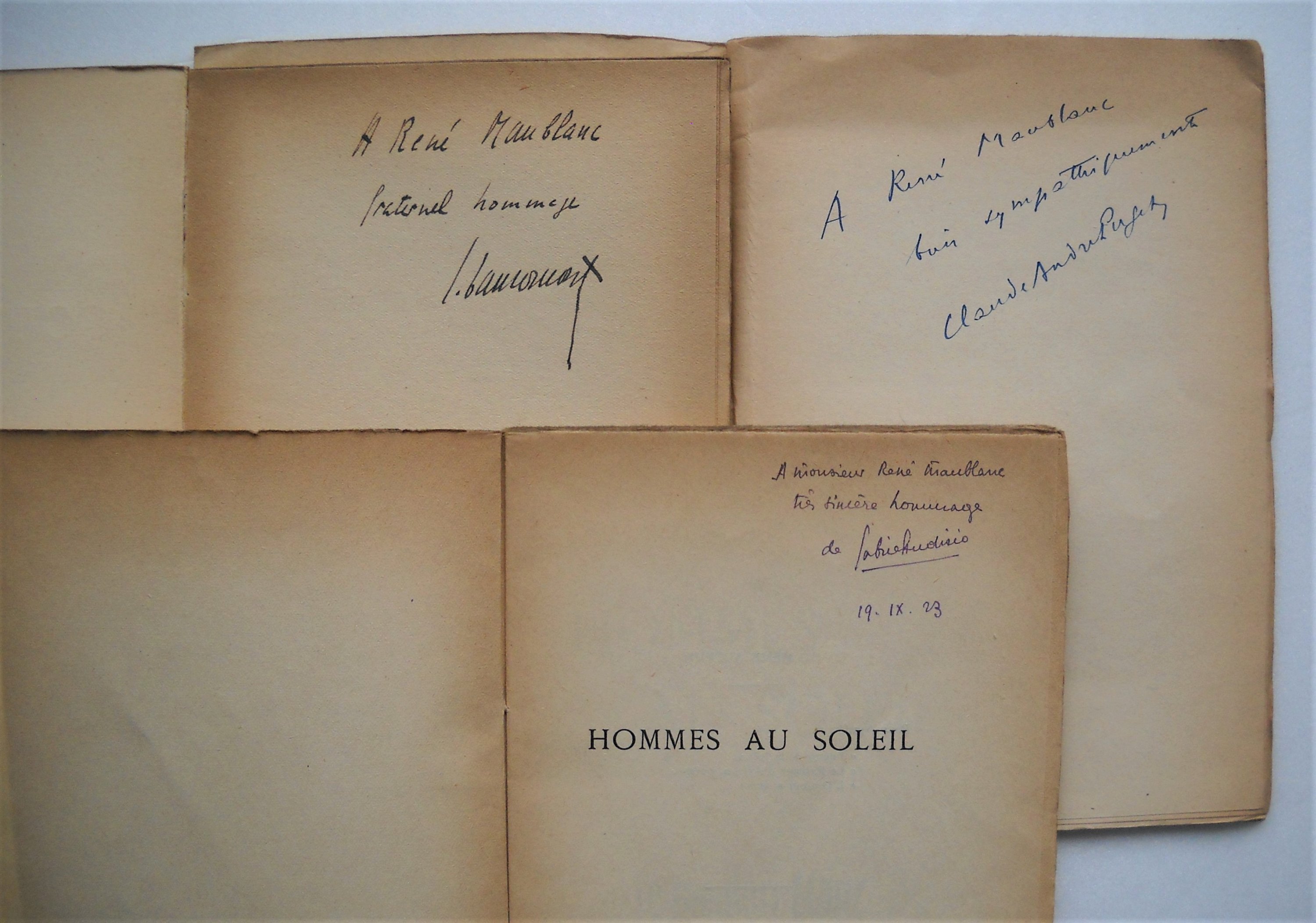 Sy ajoute 7 publications éditées par Le Mouton Blanc: Gabriel AUDISIO, Hommes au soleil, 1923, br. in-12, 109 pages, Ex. n°90, envoi autographe signé et daté Georges CHENNEVIERE, Le Chant du Verger (Idylle), 1923, in-4, 22 pages. Ex. sur Hollande van Gelder, envoi autographe signé et daté «A René Maublanc, défendeur des poètes, en témoignage de gratitude et damitié, cette idylle nue sous des branches». Claude-André PUGET, Pente sur la mer, préface de Jules Romains, 1923, br. in-8, non paginé, Ex. n°363/550 sur papier bouffant, envoi autographe signé Marthe ESQUERRE, Cromedeyre-Le-Vieil et le théâtre poétique français depuis 1843, Collection unanimiste n°1, 1923, br. in-12, 66 pages, envoi autographe signé Jean HYTIER, La Belle Sorcière, 1924, format journal, envoi autographe signé René MAUBLANC, Cent Haïkaï, 1924, br. in-12 Jean BAUCOMONT, Gouttelettes, Haï-Kaï et Outa, 1924, br. in-12, 33 pages, 2 exemplaires n°75 et n°299/500, dont un avec envoi autographe signé.