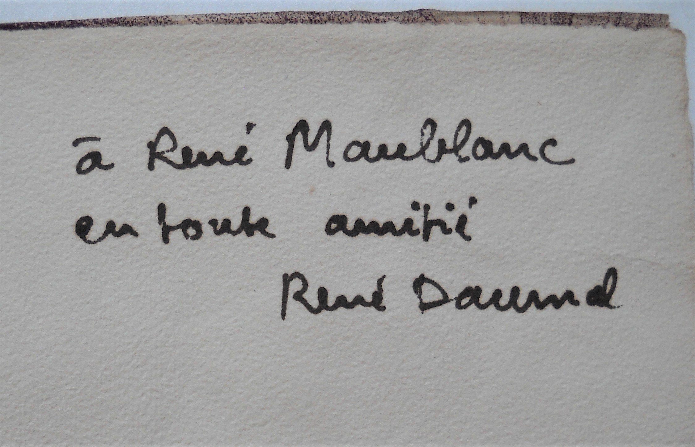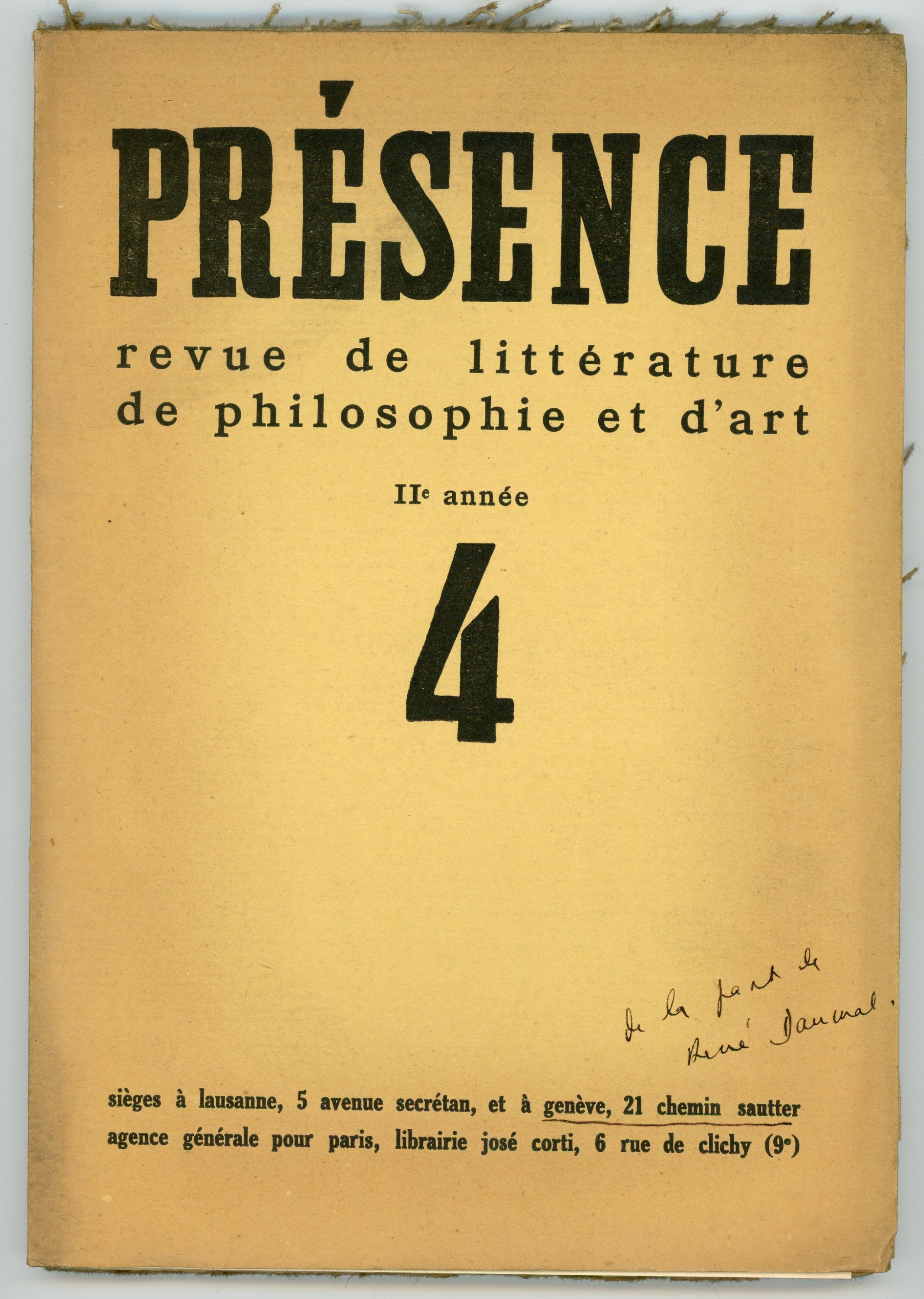 Joint: n°4 de « Présence » revue de littérature de philosophie dart contenant une prose de René Daumal intitulée « Têtes fatiguées », 7 pages ; en couverture un envoi manuscrit de R. Daumal.