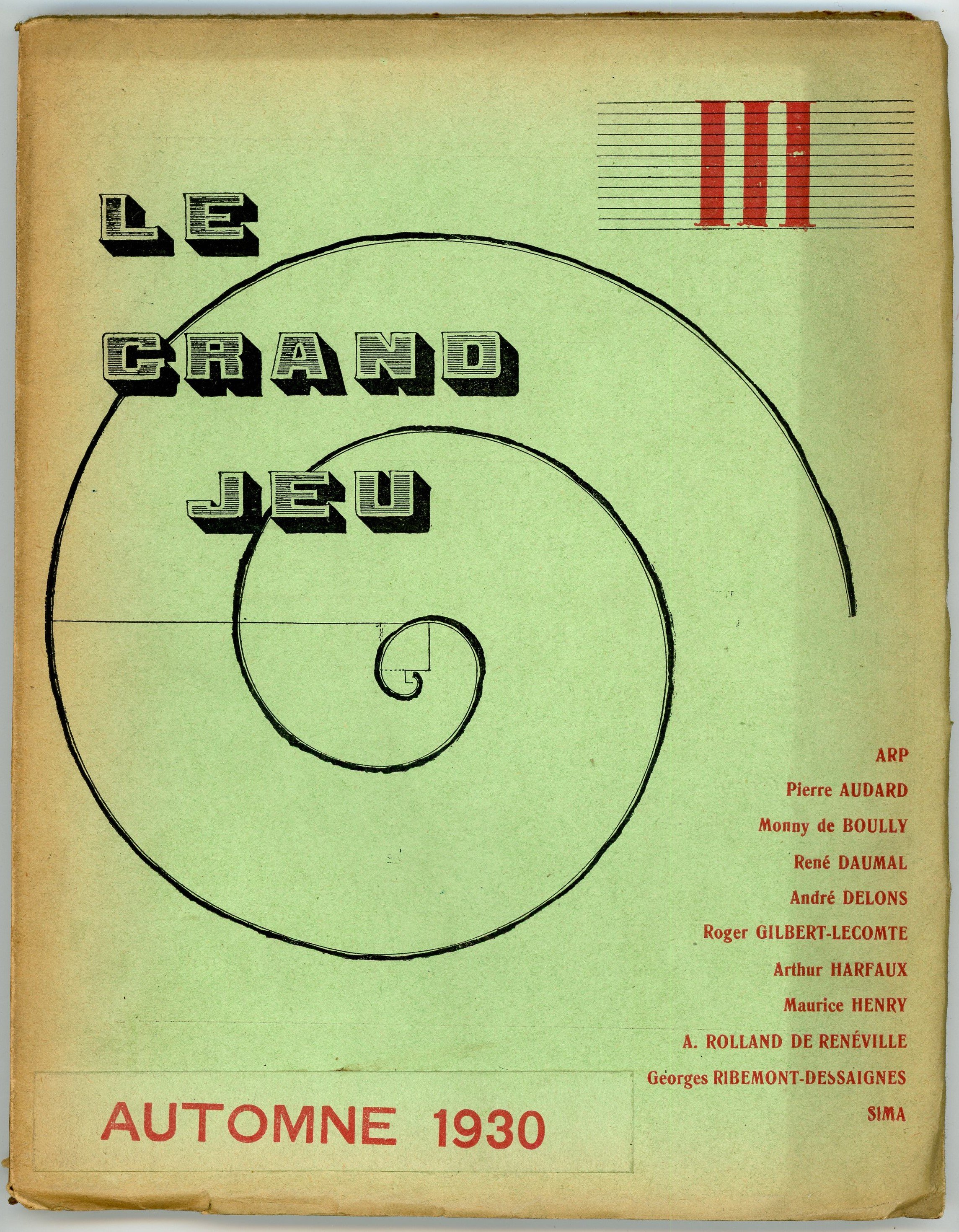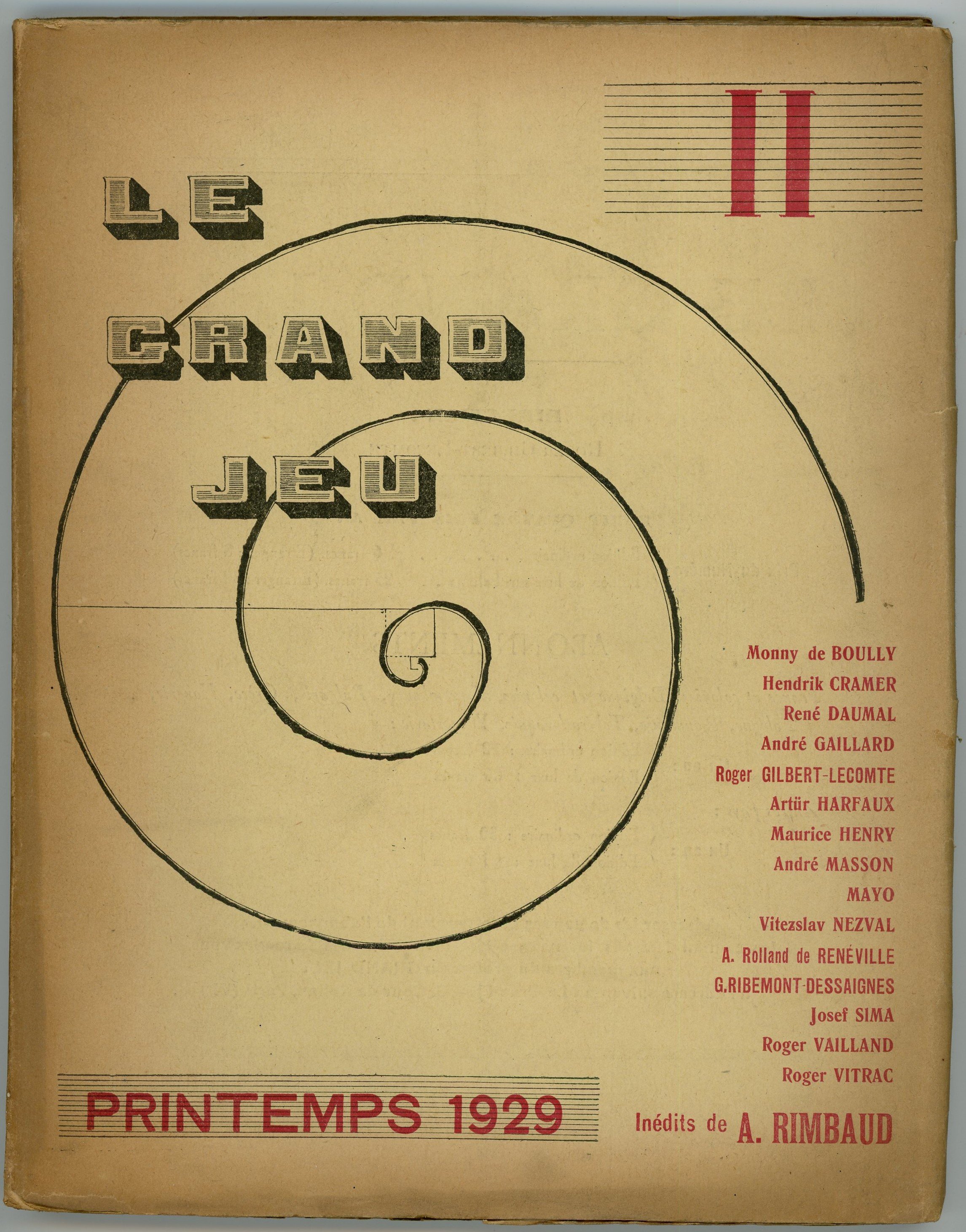 Rare réunion des 3 numéros, br. grand in-8, couv. rempliées. Collection complète de cette revue littéraire et expérimentale parue entre l'été 1928 et l'automne 1930, fondée par René Daumal, Roger Gilbert-Lecomte et Roger Vailland. Elle regroupe des textes littéraires, philosophiques, des chroniques, etc. de Robert Desnos, Ribemont-Dessaignes, Saint-Pol-Roux, Sima, Arp, Monny de Boully, Roger Vitrac, Rolland de Renéville, etc., et quelques dessins et reproductions notamment de Sima, Masson, Maurice Henry et Man Ray. Le numéro 2 est presque exclusivement consacré à Arthur Rimbaud. Dans le numéro 3 figure la Lettre ouverte à André Breton sur les rapports du surréalisme et du Grand jeu rédigée par René Daumal en réponse à l'attaque que Breton avait faite contre lui dans le Second Manifeste du Surréalisme. Un quatrième numéro était en préparation mais ne fut jamais publié. Légères insolations aux couvertures.