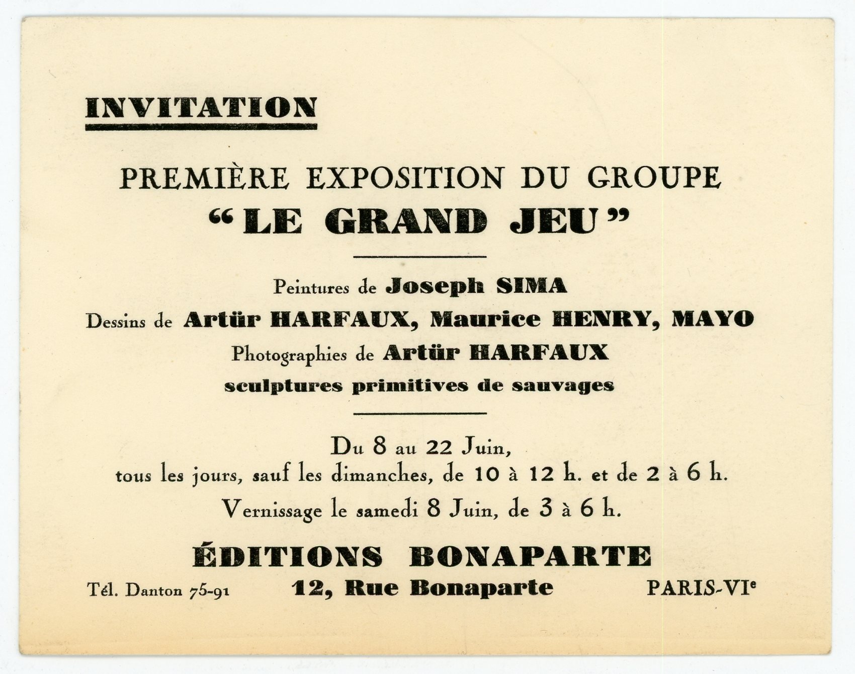 - Catalogue de la Première Exposition du groupe « Le grand Jeu », 1929, br. in-8, 15 pages, 2 reproductions de peintures de Joseph Sima [L'exposition eut lieu à Paris du 8 au 22 juin 1929 à la librairie Bonaparte, rue Bonaparte dans le sixième et présentait des peintures de Joseph Sima, des photographies et dessins de Artür Harfaux, des dessins de Maurice Henry et de Mayo, ainsi que des « sculptures de sauvages » provenant des célèbres collections du docteur Stephen-Chauvet et de Paul Chadourne.] ;