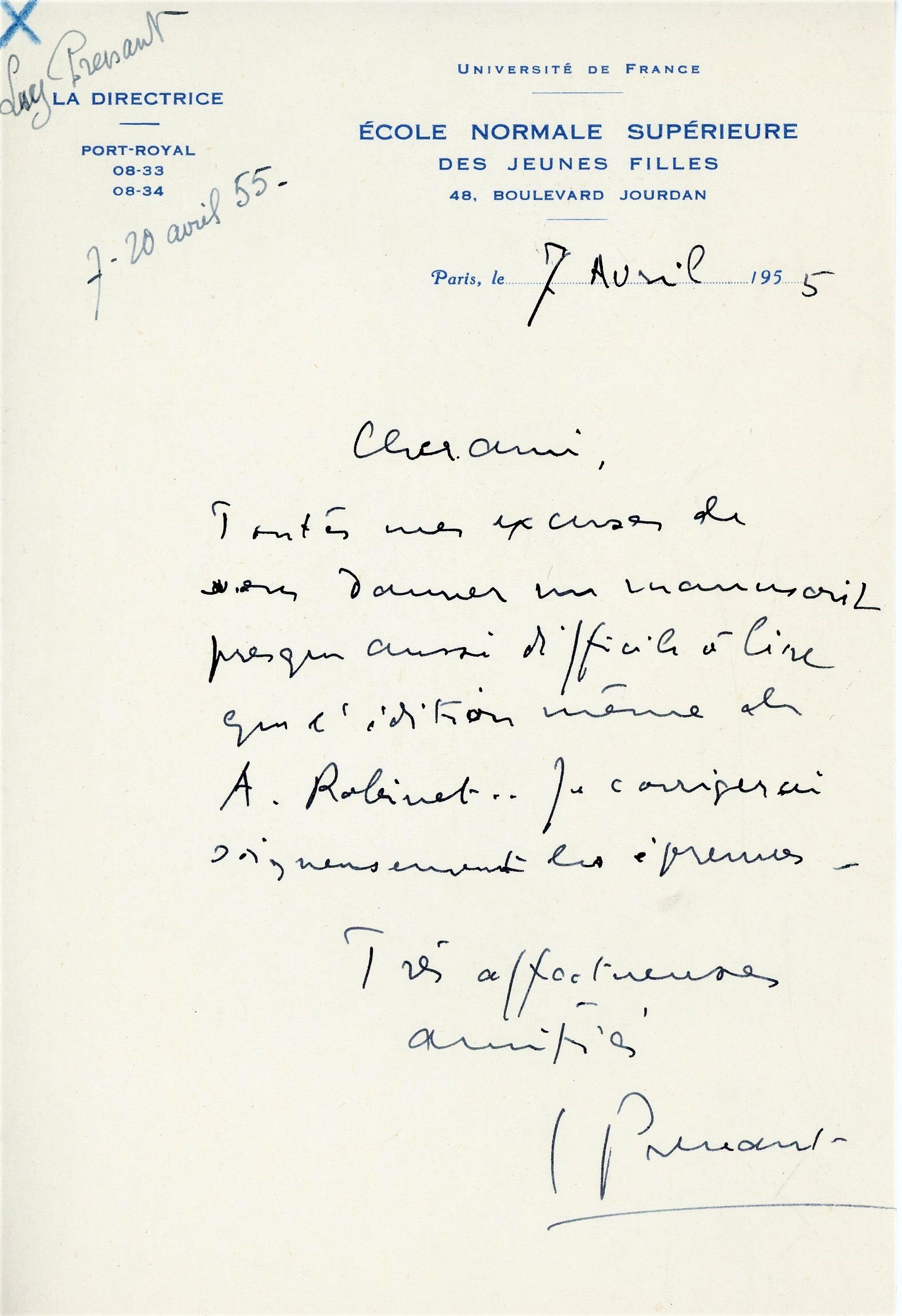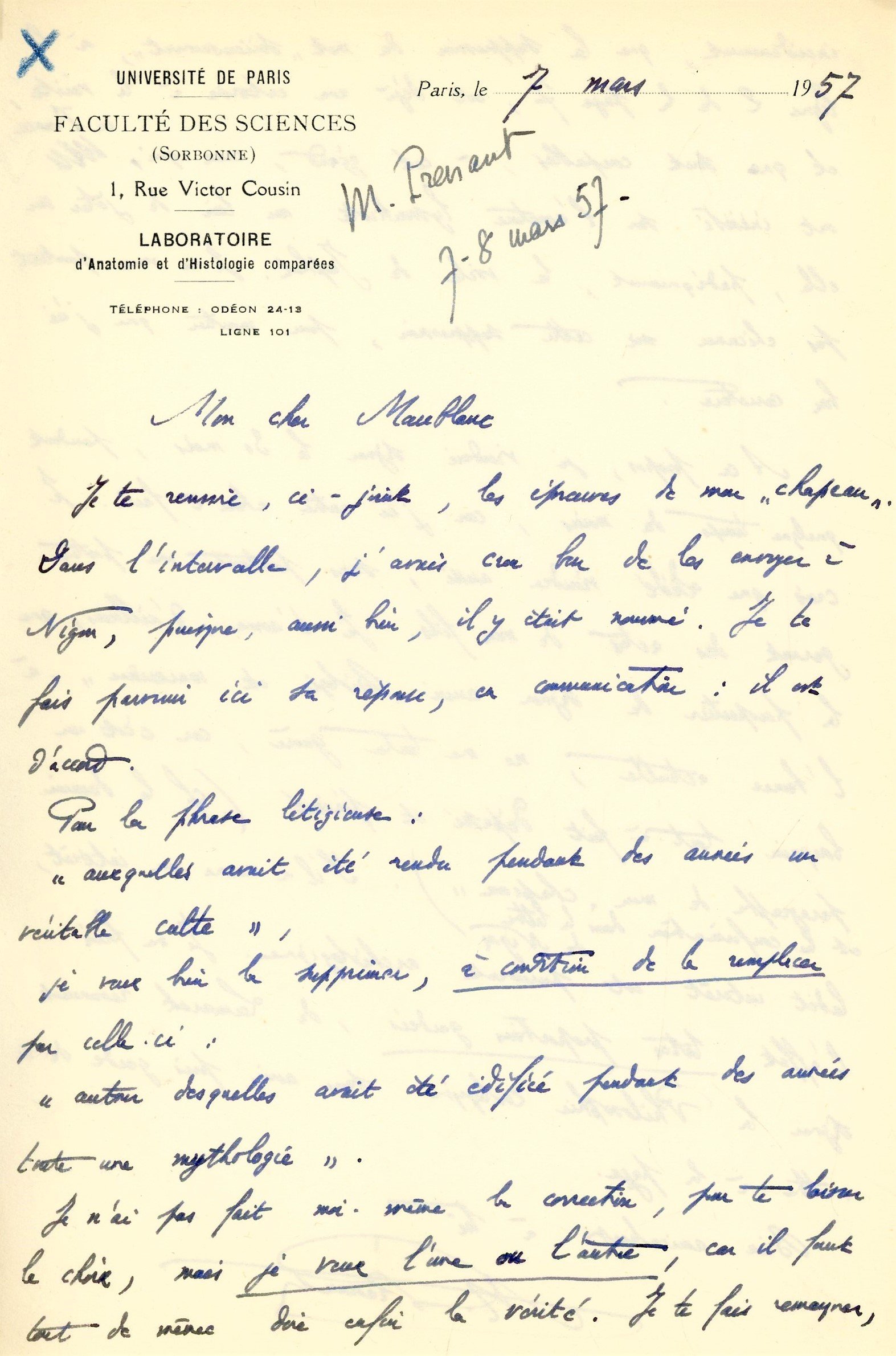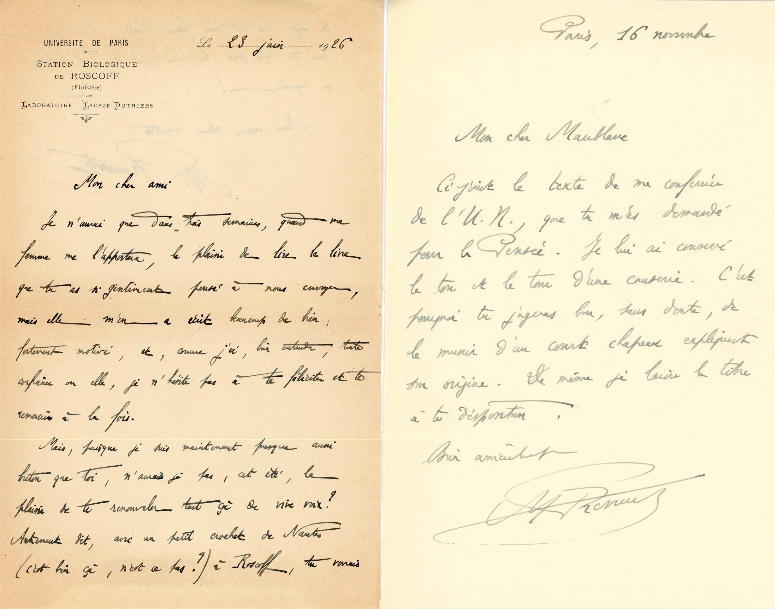 - + de 70 L.A.S. et P.A.S., 1920-1959, Marcel Prenant, correspondance adressée à R.M. concernant essentiellement lactivité de la revue La Pensée, dont Prenant est membre du comité directeur.