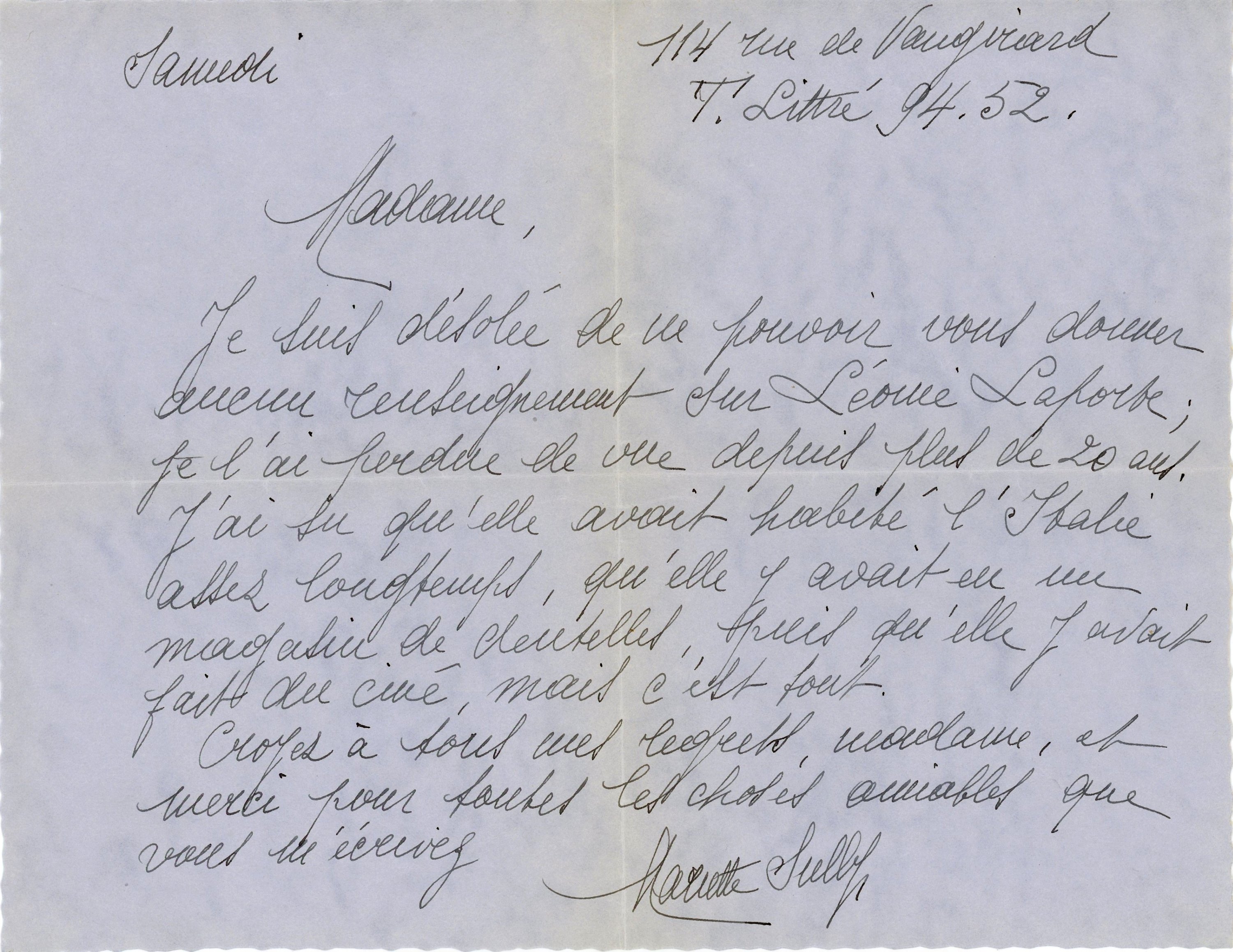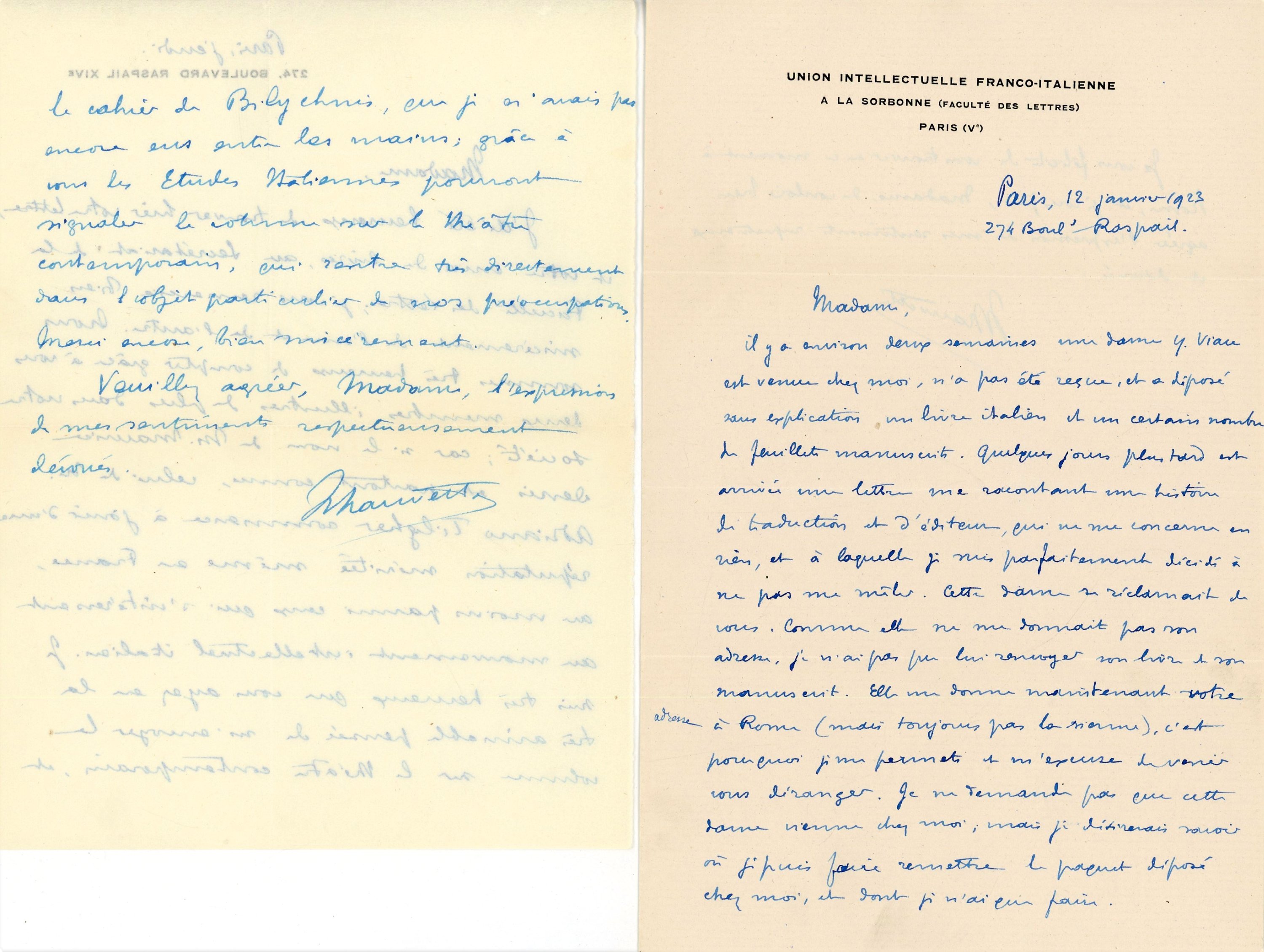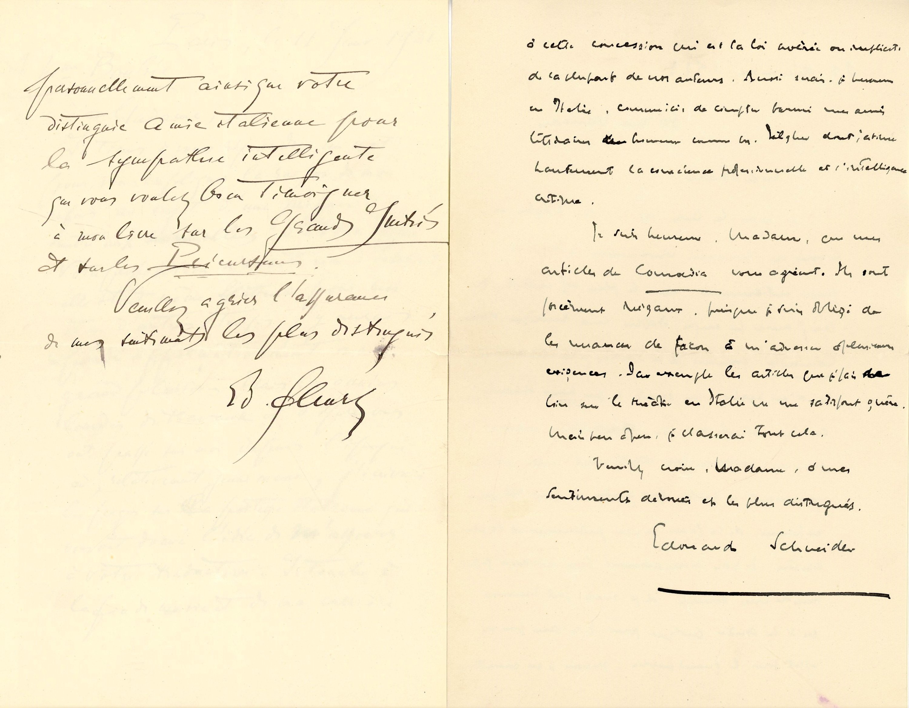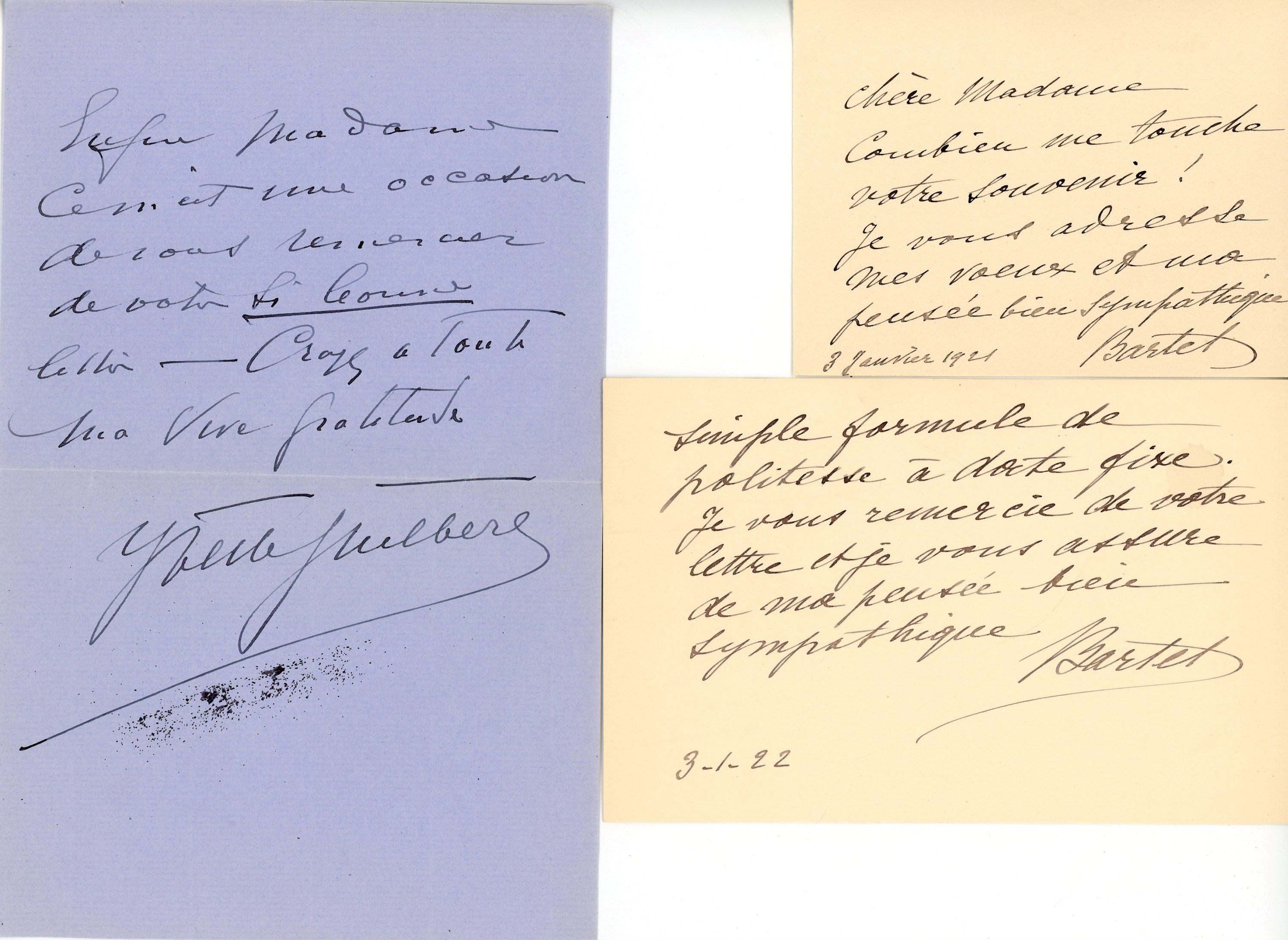 - Correspondance adressée à Elena Boubée en provenance d’intellectuels et d’artistes, en majorité avec enveloppes: 9 L.A.S. Léon BALZAGETTE (1873-1928), écrivain ; 3 P.A.S. et carte de visite Julia BARTET (1854-1941), comédienne ; L.A.S. Julien BENDA (1867-1956), philosophe ; L.A.S. Yvette GUILBERT (1867-1944), chanteuse ; L.A.S. André HALLAYS (1859-1930), écrivain ; 3 L.A.S. Henri HAUVETTE (1865-1935), homme de lettres ; L.A.S. Frantz Philippe JOURDAIN (1906-1989), architecte ; L.A.S. Lucien LÉVY-BRUHL (1857-1939), philosophe ; 4 L.A.S. Gabriel MARCEL (1889-1973), philosophe ; 2 L.A.S. Édouard SCHNEIDER (1880-1960), homme de lettres ; 2 L.A.S. Édouard SCHURÉ (1841-1929), philosophe ; 2 L.A.S. Luigi SALVATORELLI (1886-1974), historien ; L.A.S. Mariette SULLY (1878-1950), vedette d’opérette – etc.
