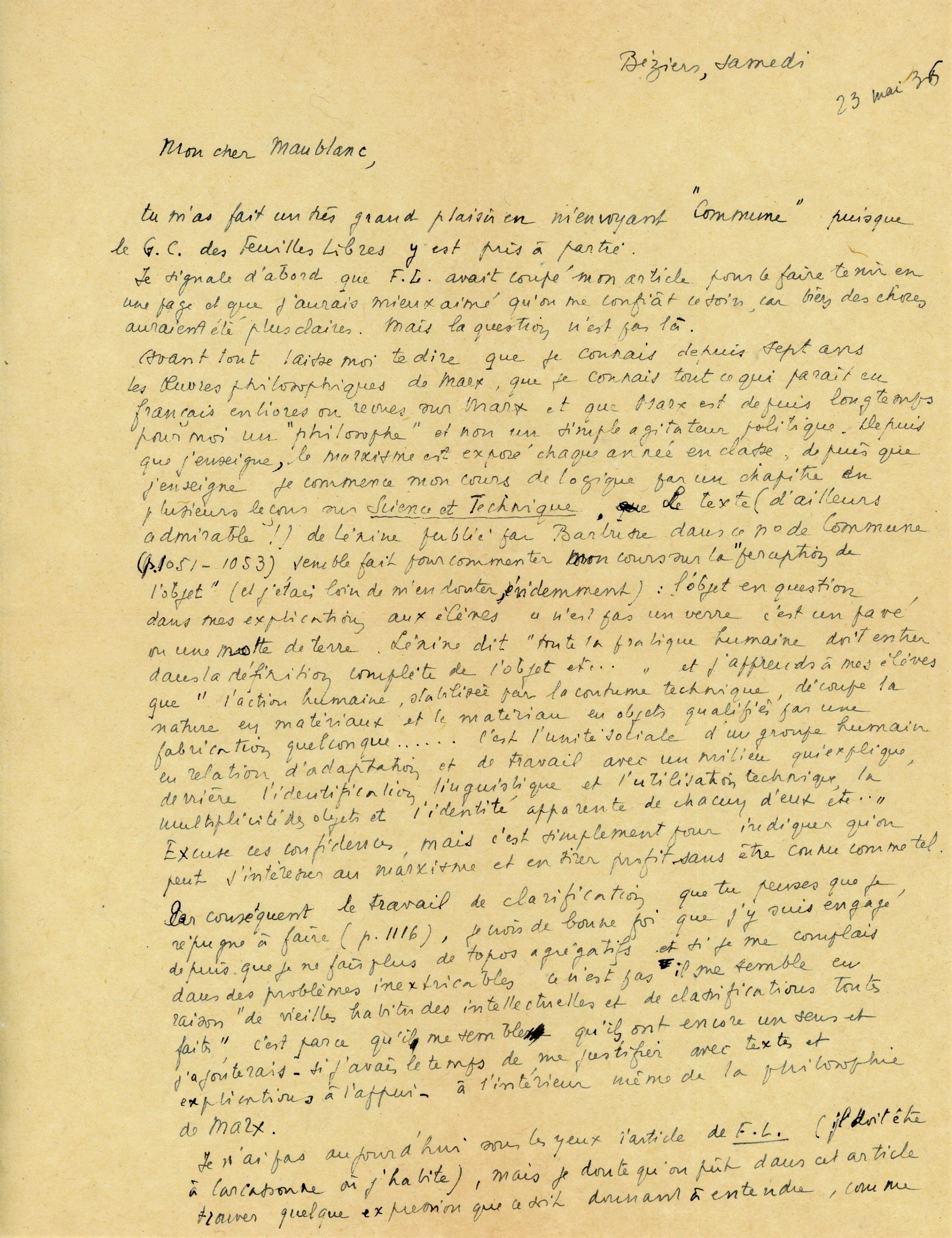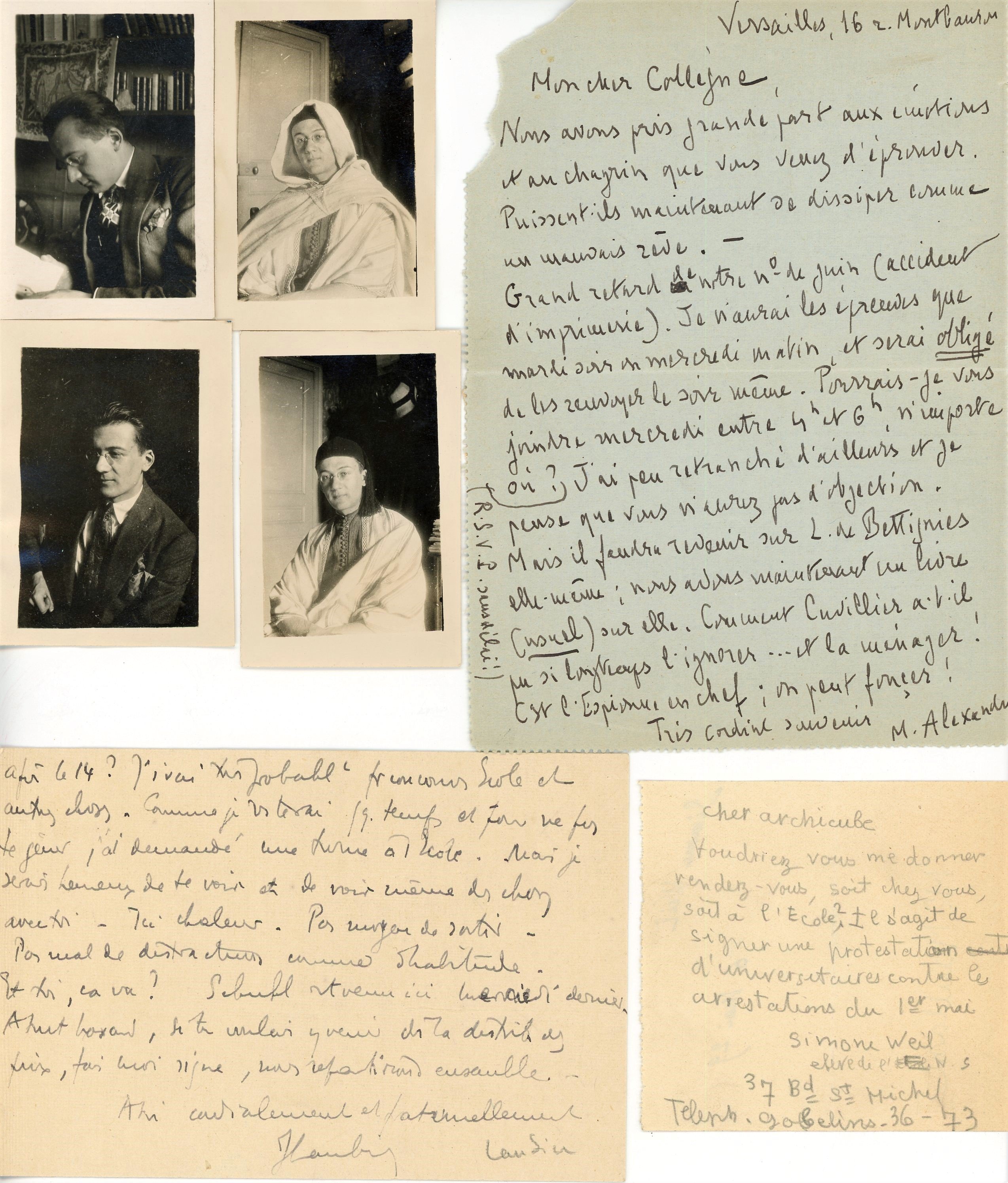 7 P.A.S. Michel ALEXANDRE (1888-1952), directeur des Libres Propos ; 5 L.A.S. Georges BÉNEZÉ (1888-1978) ; L.A.S. Pierre BOST (1901-1975) ; Longue L.A.S. Georges CANGUILHEM (1904-1995), au sujet d’un article paru dans « Commune » relatif au matérialisme/idéalisme ; P.A.S. Simone Adolphine WEIL (1909-1943) datée du 6 mai 1929 au sujet d’une pétition à signer contre les arrestations du 1er mai ; 53 L.A.S. et P.A.S. Jean LAUBIER (1891-1959) ;