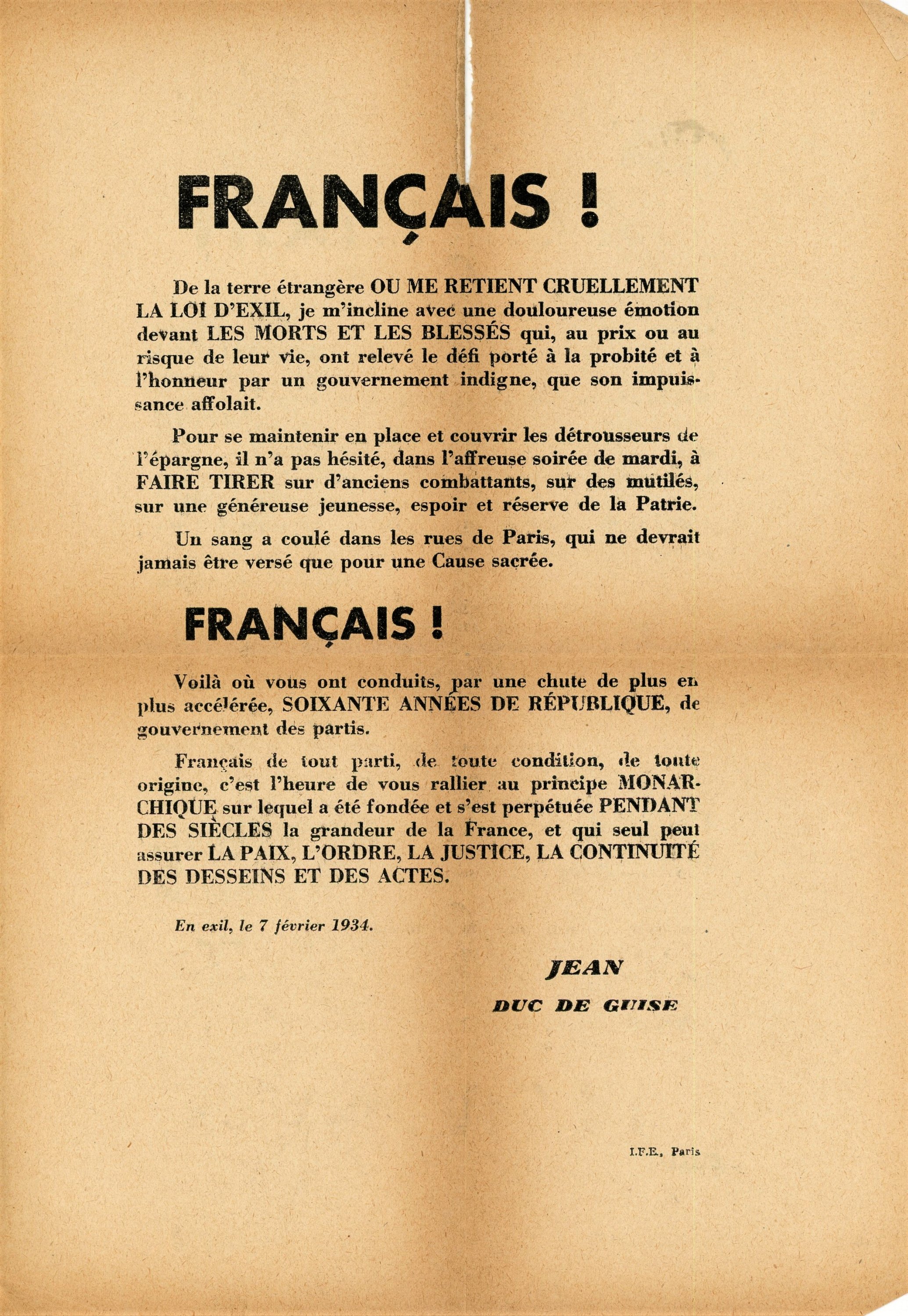 - 10 brochures et tracts: « Français » appel de Jean de Guise, 7 février 1934 ; La jeunesse devant le fascisme, juin 1934 ; Les prétentions sociales du fascisme, juillet 1934 ; Quest-ce que le fascisme?, 1935 ; Le fascisme et les paysans, 1935 ; Les croix de feu, leur chef, leur programme, 1935 ; Non! La guerre nest pas fatale, 1936 ; La jeunesse devant le fascisme, 1936 ; La France en face du problème colonial, 1936 ; La banque de France aux mains des 200 familles, 1936.