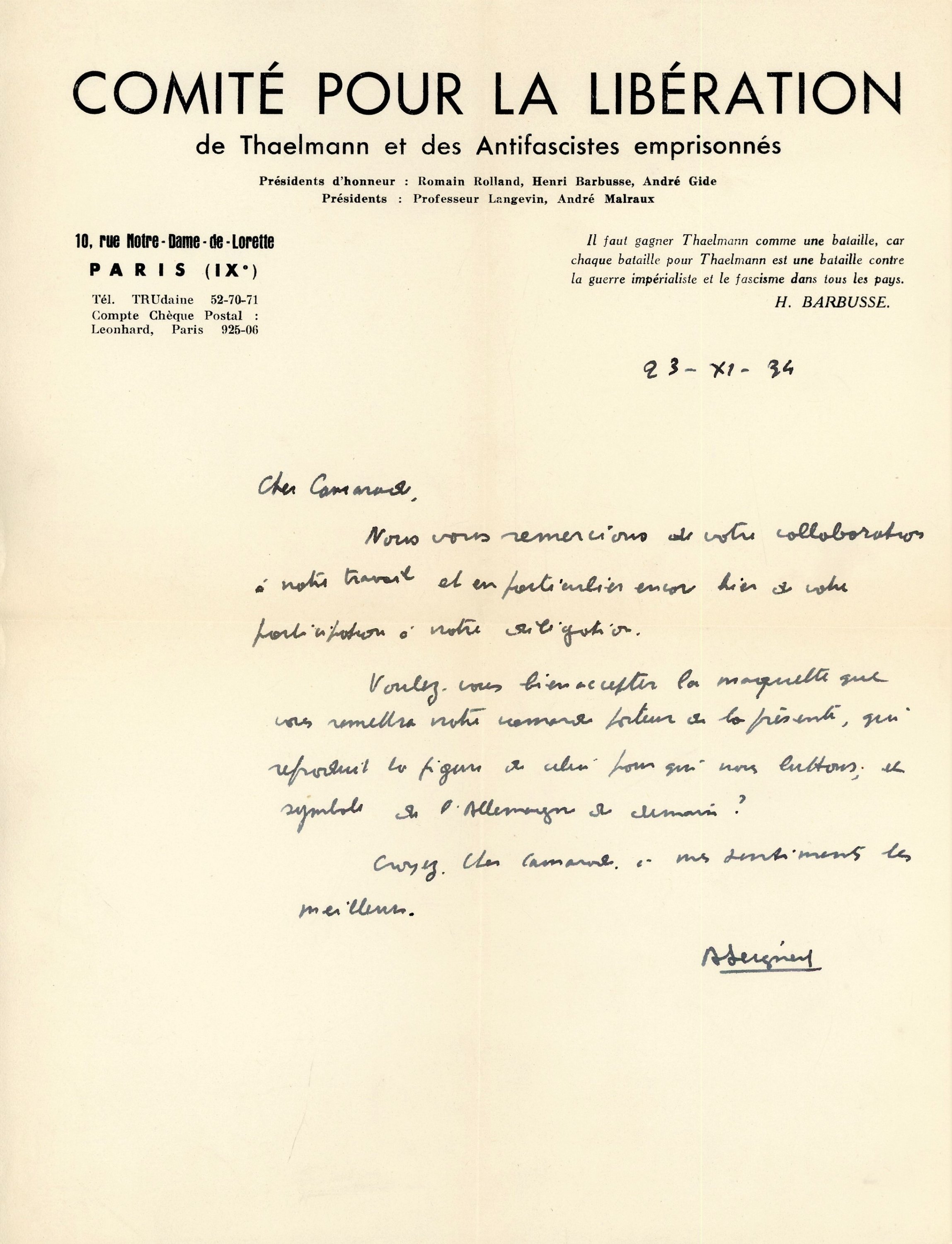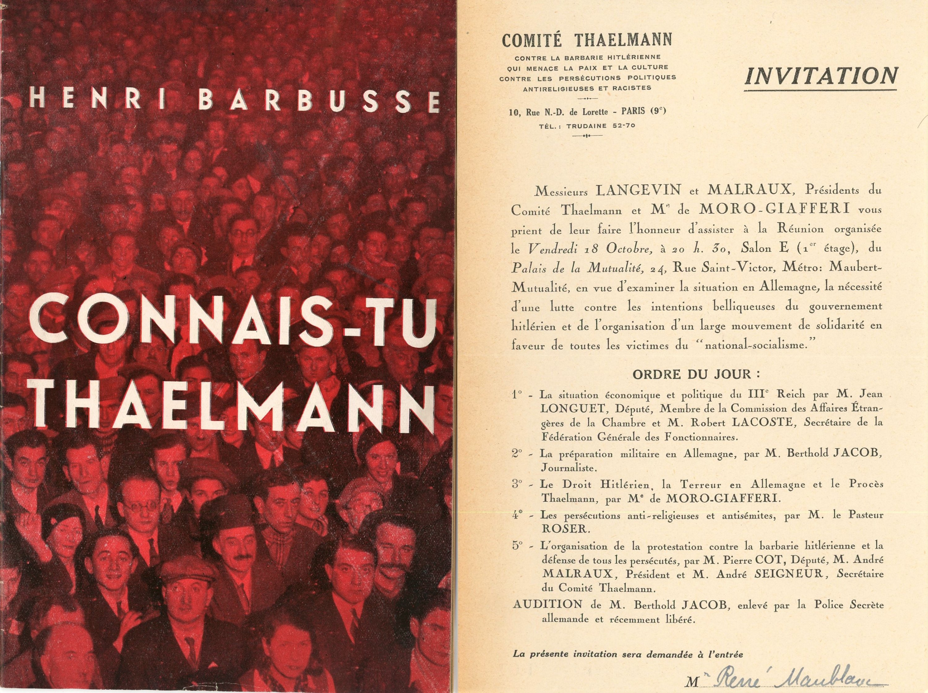 - « Connais-tu Thaelmann » par Henri BARBUSSE, 18 pages in-8 + documentation sur le procès Thaelmann distribuée lors de la conférence internationale sur le droit national-socialiste + lettres et bulletins dinformations du comité ;
