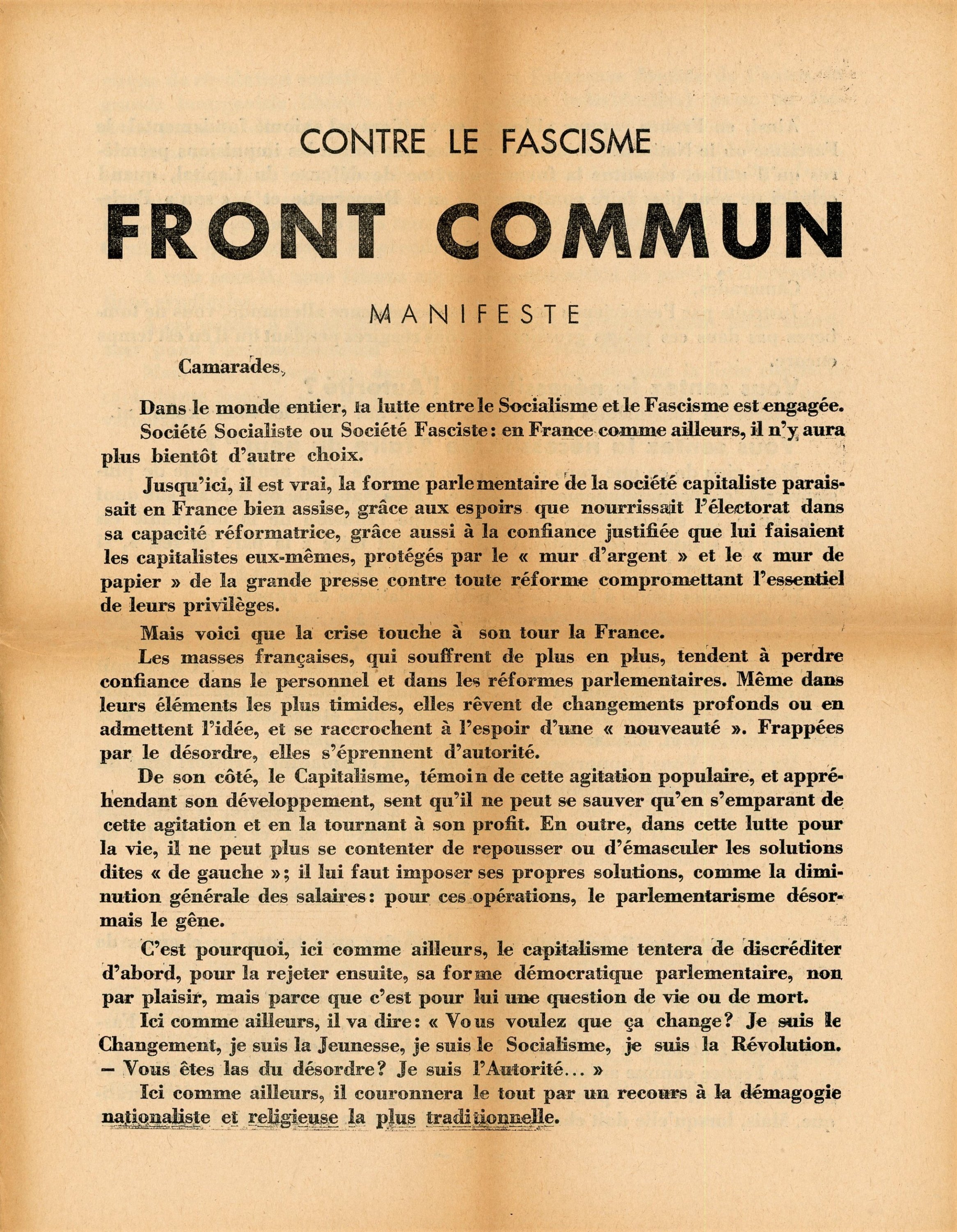 - « Front commun contre le fascisme », statut et tracts, 1933