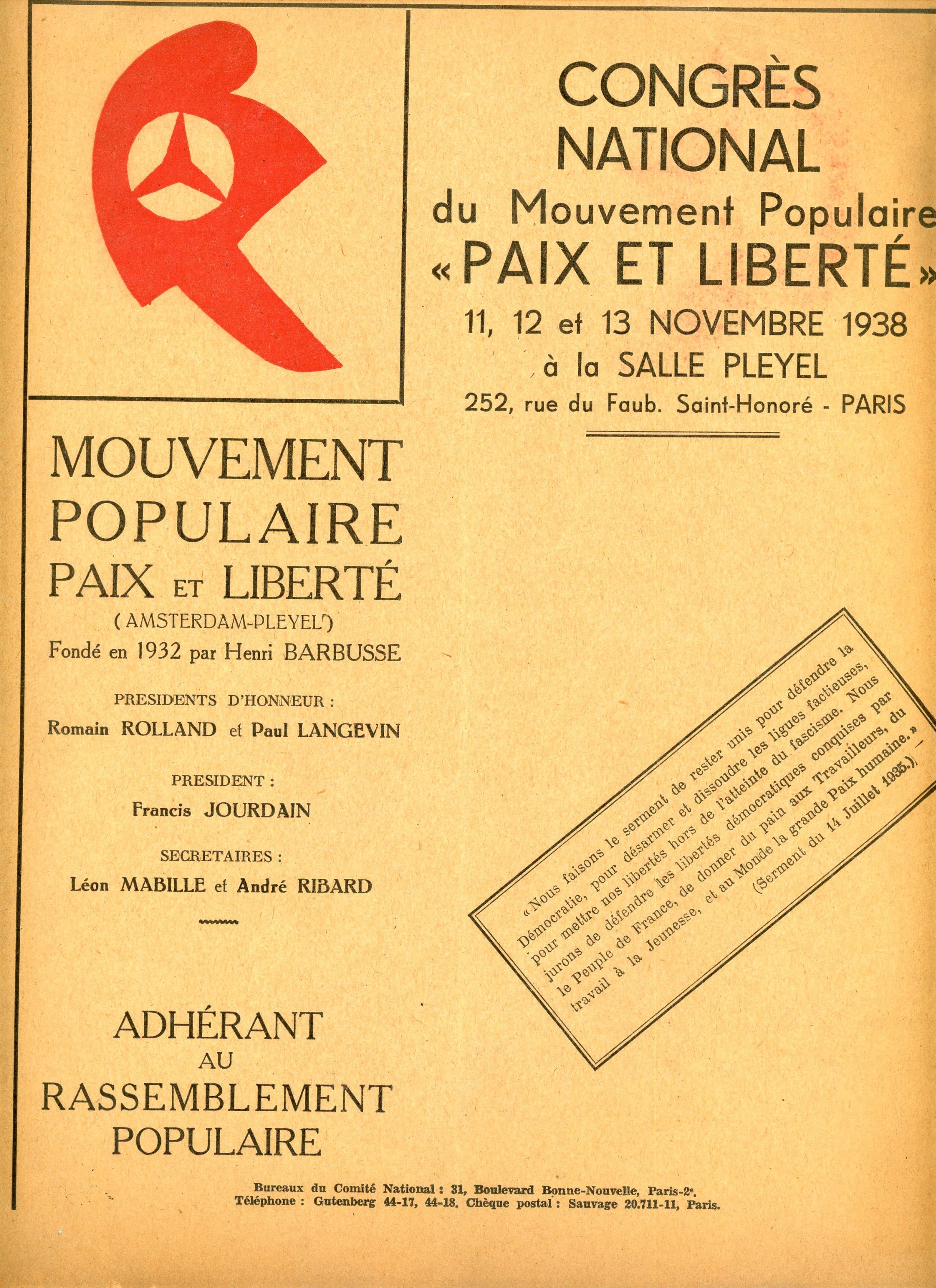 - « Mouvement populaire Paix et Liberté Amsterdam-Pleyel », 15 L.S., 1936-1939 + 2 plaquettes collection Paix et Liberté parues en 1938 et rédigées par R.M.: « Bilan du Front Populaire », « La France en péril » ;
