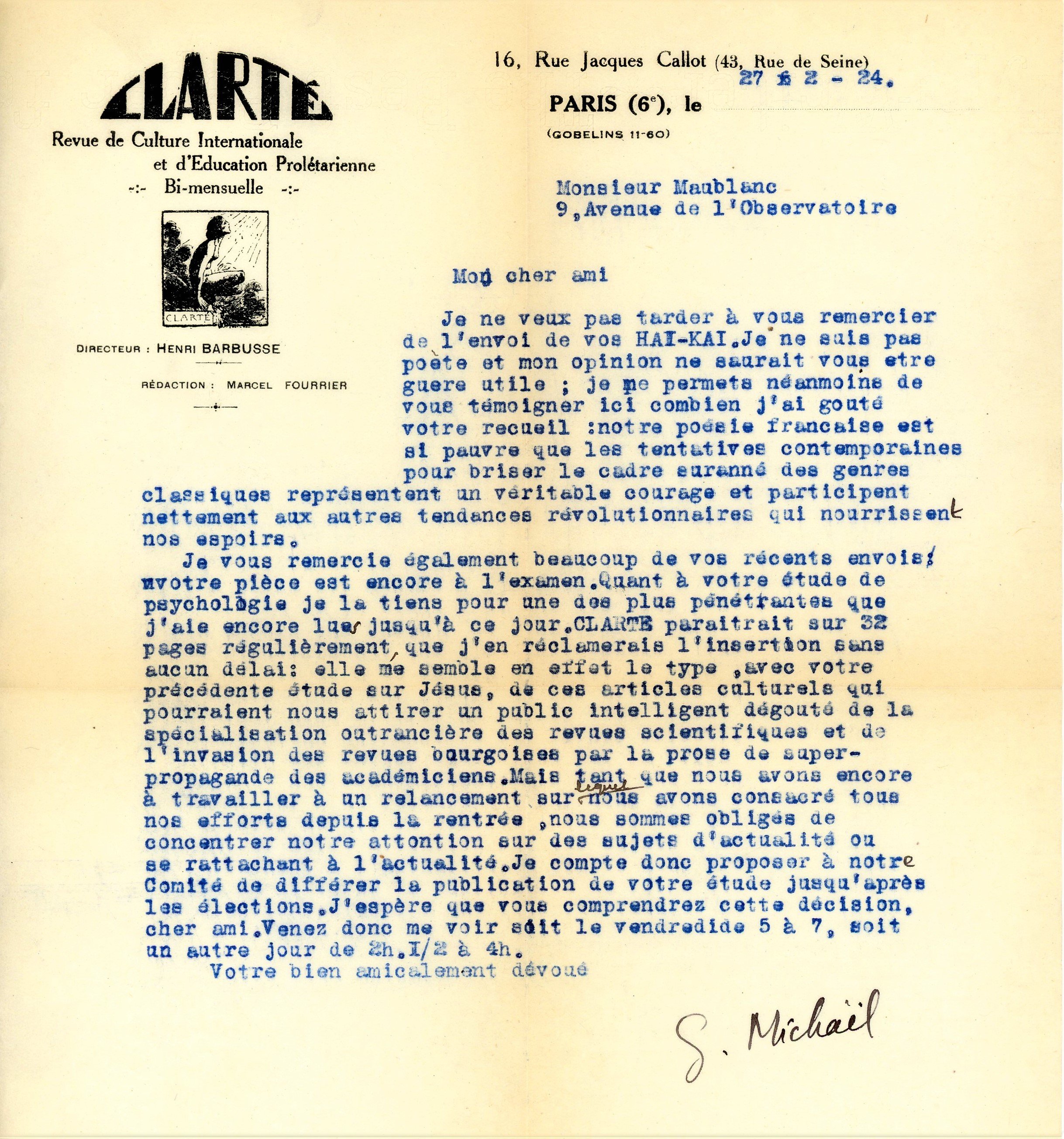 - Collection complète de « Clarté », revue mensuelle du comité mondial contre la guerre et le fascisme, n°1 daoût 1936 au n°35 de juillet-août 1939 + « Sur deux formes de pacifisme, réponse à René Maublanc », par Michel ALEXANDRE, septembre 1936, tapuscrit de 5 pages in-4 + « Sur deux formes de pacifisme, réponse à René Maublanc », par Léon EMERY, septembre 1936, tapuscrit de 4 pages in-4 et L.A.S., Lyon, 9 septembre 1936: « Dans son n°1, Clarté a publié un article de R.M. dans lequel il critique le pacifisme de certains intellectuels et désigne nommément Alain, Alexandre et moi-même. Cet article, dune forme dailleurs très courtoise, contient des erreurs et des imputations gratuites qui me forcent à vous demander linsertion de cette brève réponse