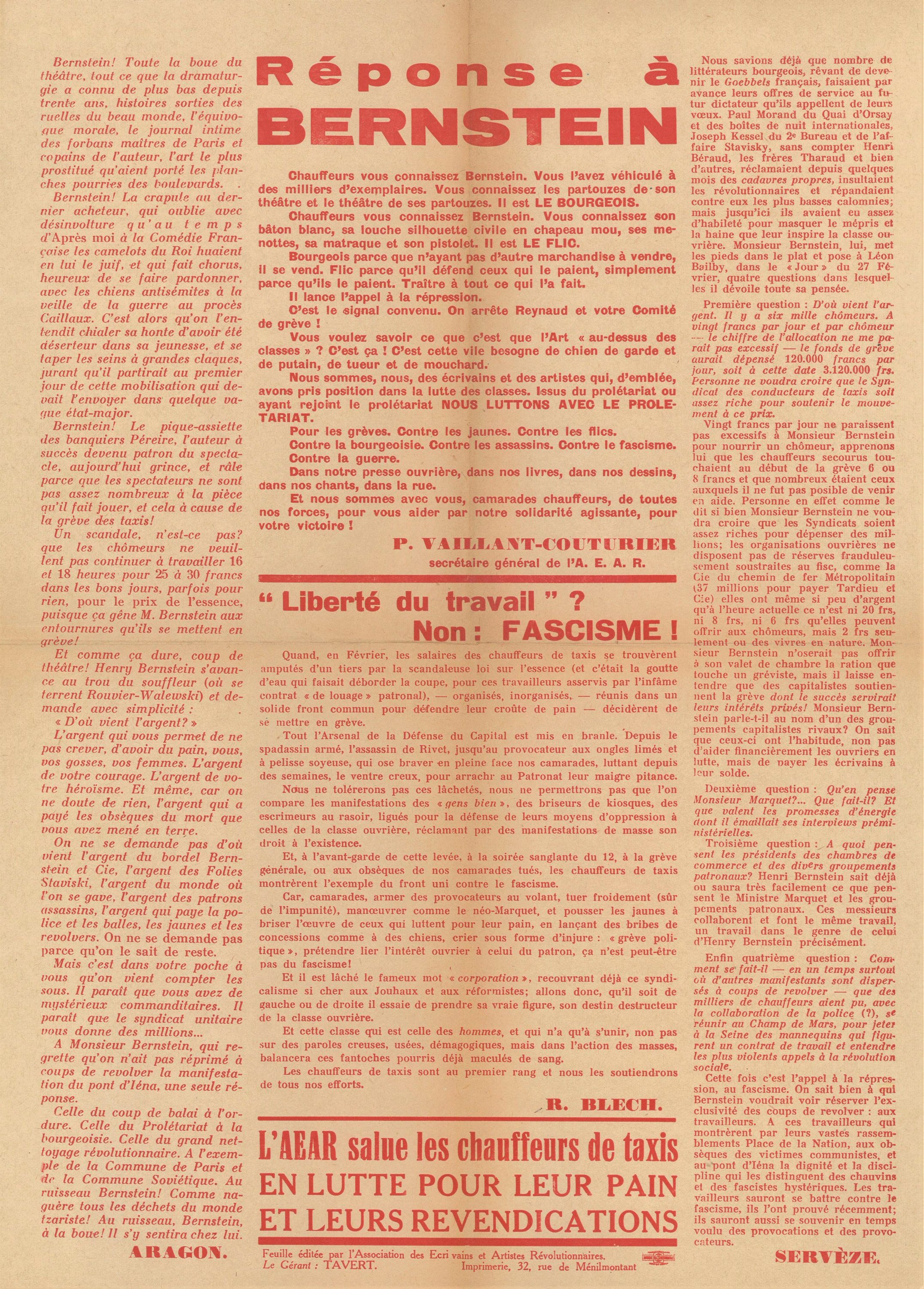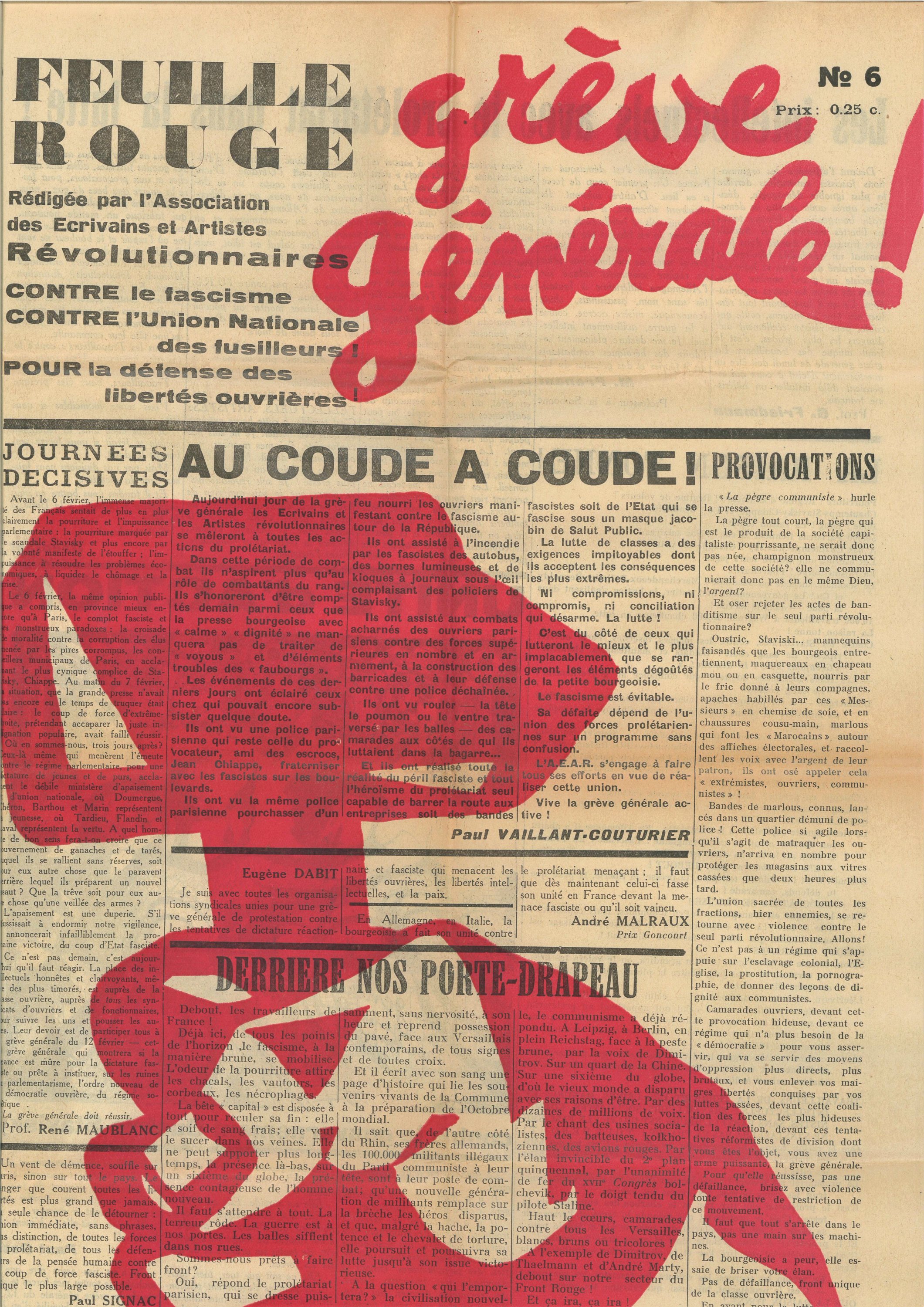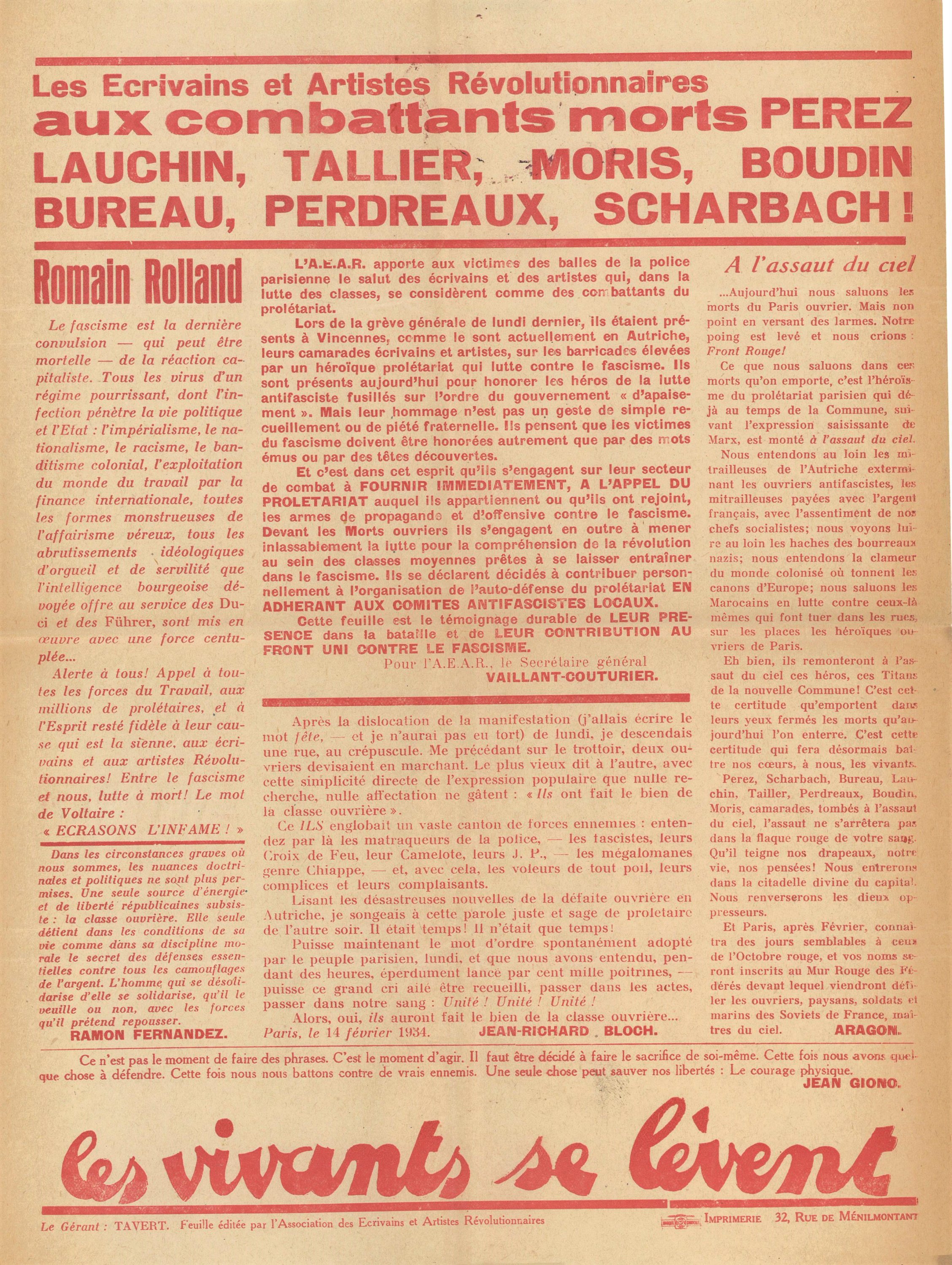 - 2 rares tracts: « Les Ecrivains et Artistes Révolutionnaires Aux combattants morts Pérez, Lauchin, Tallier, Moris, Boudin, Bureau, Perdreaux, Scharbach! Les vivants se lèvent », 14 février 1934, 33 x 25 cm ; « Réponse à Bernstein », [1934], 38 x 27 cm ;