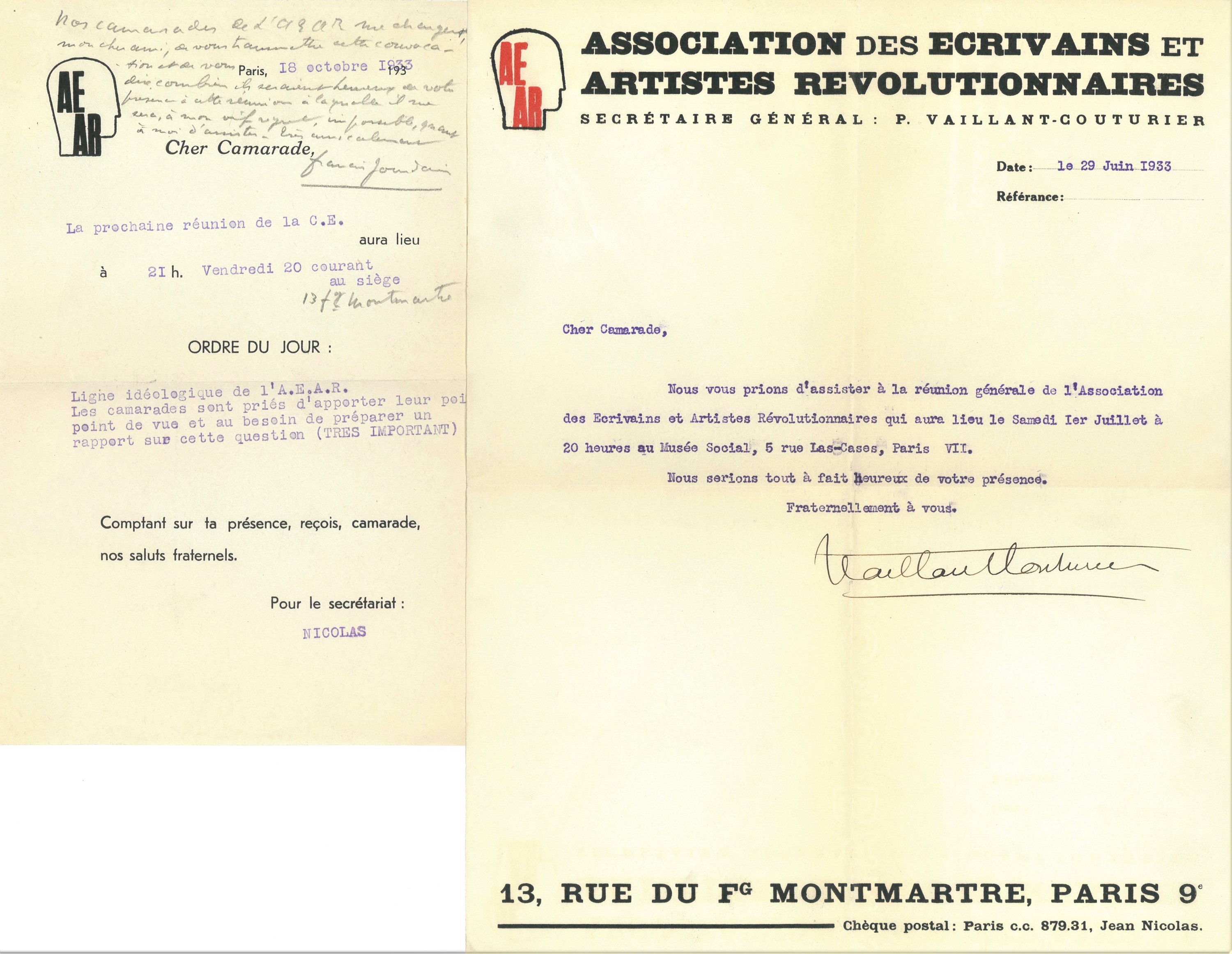 - 25 L.A.S. et L.S., 1933-1939, dont convocation du 29 juin 1933 signée par Paul VAILLANT-COUTURIER, René Maublanc désigné comme membre de la commission exécutive ; convocation du 18 octobre 1933 avec apostille manuscrite de Francis JOURDAIN ; L.A.S., 21 mars 1935, de Paul VAILLANT-COUTURIER ; signatures de Louis ARAGON, Jacques DECOUR, Gérard SERVÈZE, René BLECH ; 4 L.S., Moscou, 1937-1939, Michel APLÉTINE, président adjoint de la commission étrangère de lUnion des écrivains soviétiques de lU.R.S.S. ; lettre du secrétariat de lUnion Internationale des Écrivains Révolutionnaires, Moscou, 31 décembre 1933, etc ;