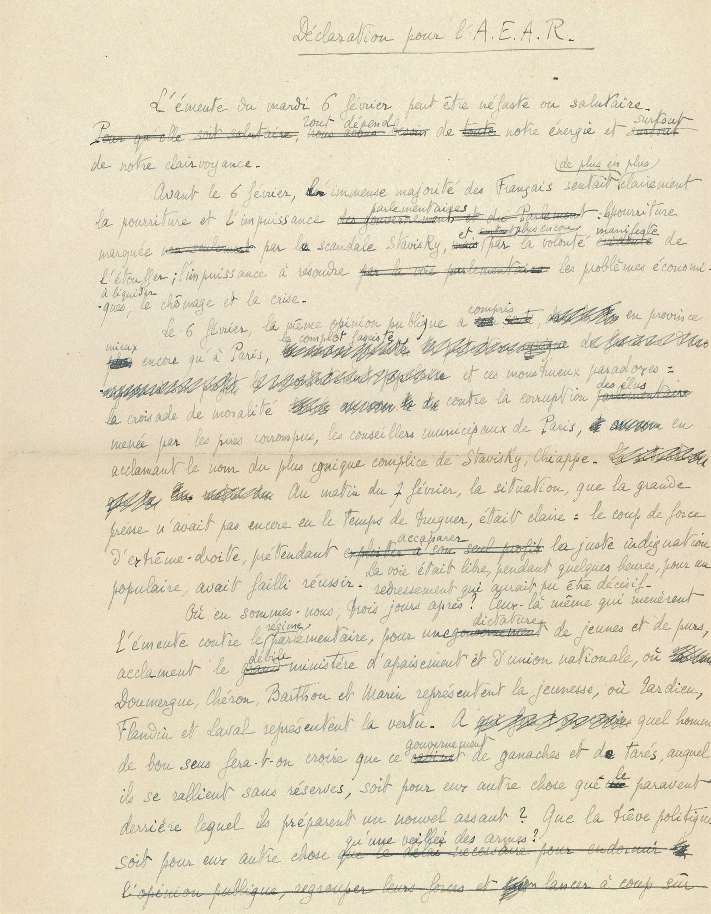 - « Déclaration pour lA.E.A.R. », brouillon manuscrit de R.M., appel à la grève générale en février 1934, 2 pages in-4