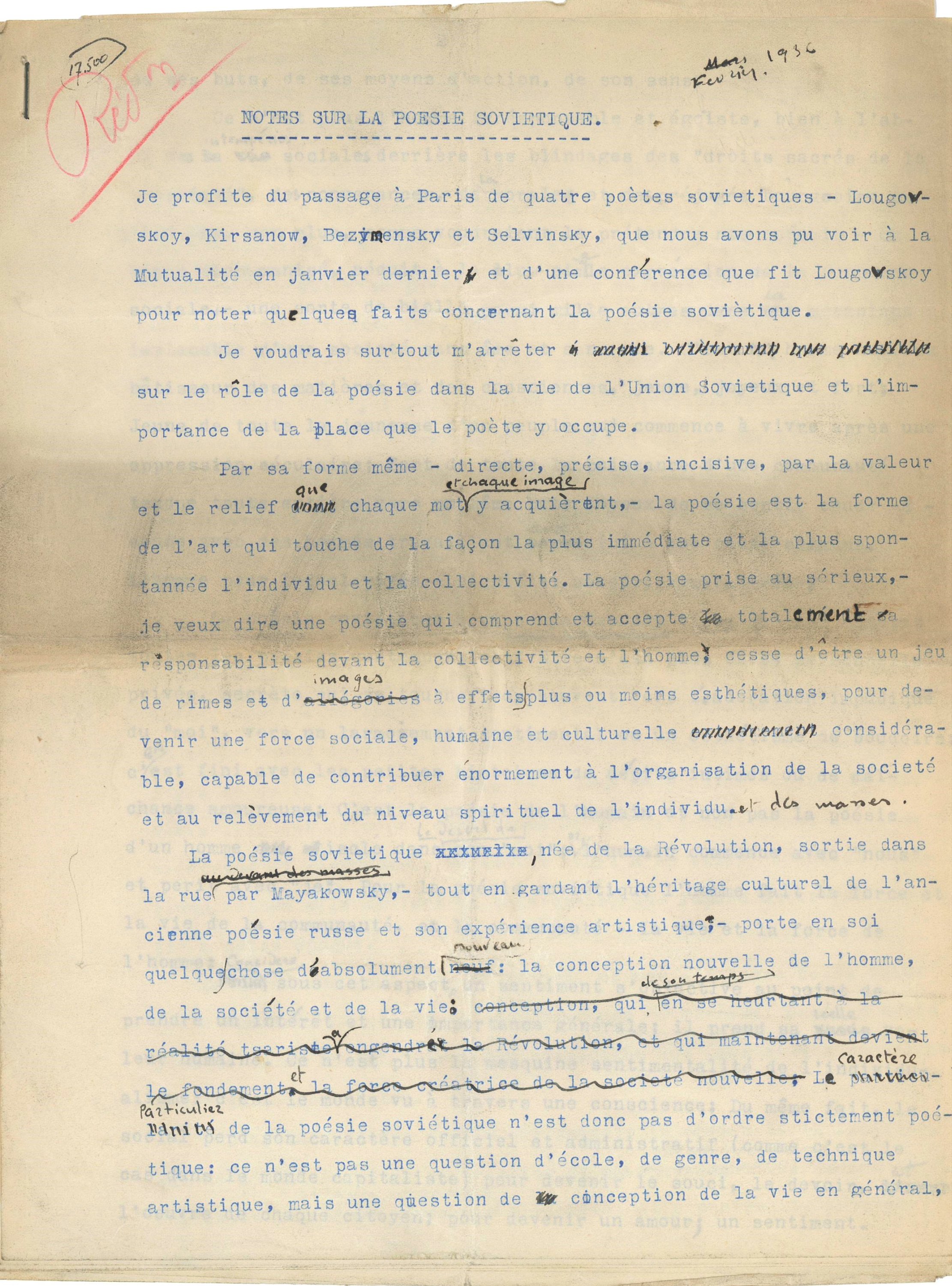 Joint: « Notes sur la poésie soviétique », tapuscrit avec corrections manuscrites de Savinkov, février 1936, 9 pages in-4 ; 15 L.A.S. et P.A.S. de sa mère Eugénia SCHIRINSKY, recevant du front espagnol les nouvelles de son fils et les renvoyant à R.M. ; L.A.S. de GABRIEL-EMME auteur dramatique et metteur en scène.