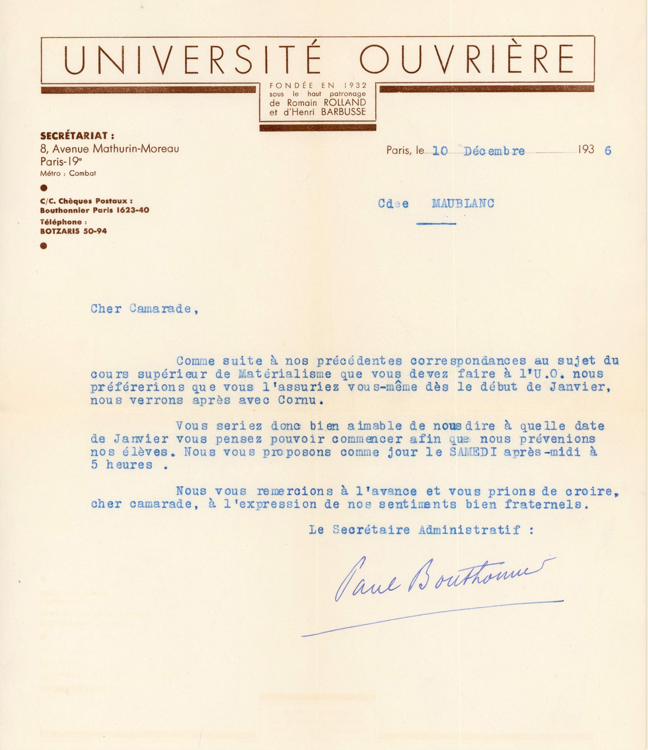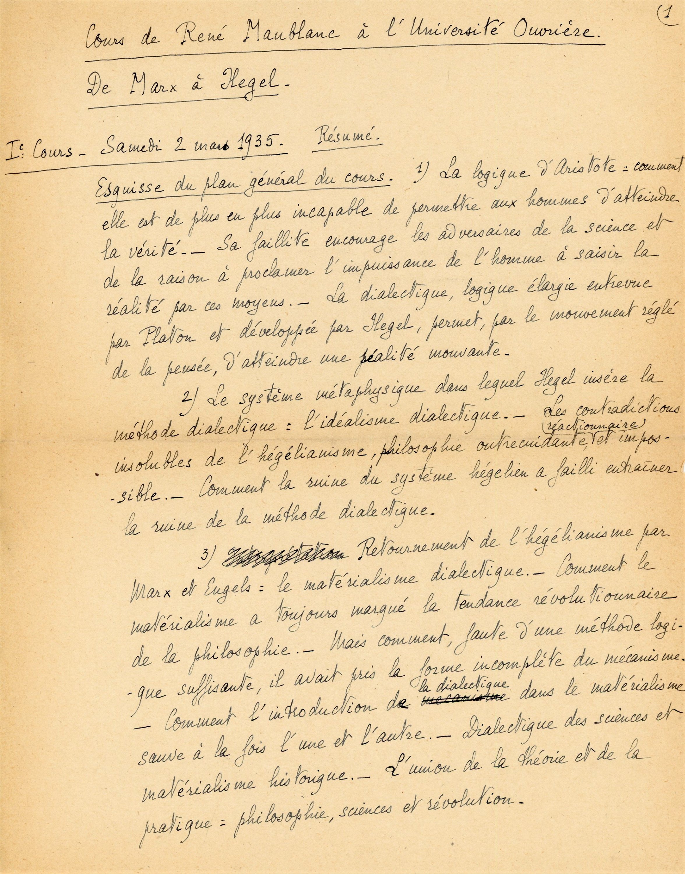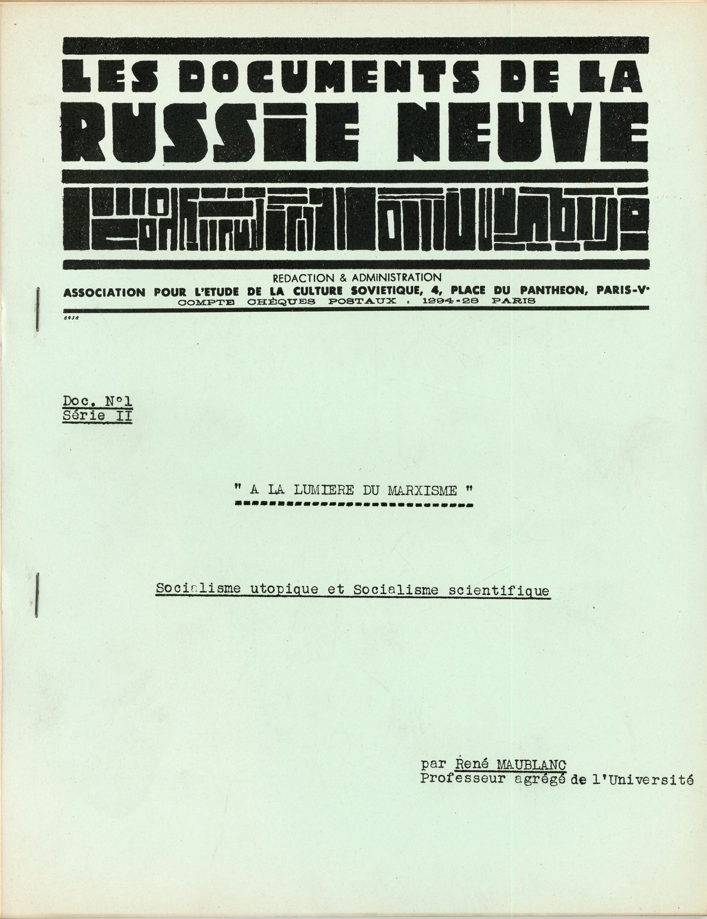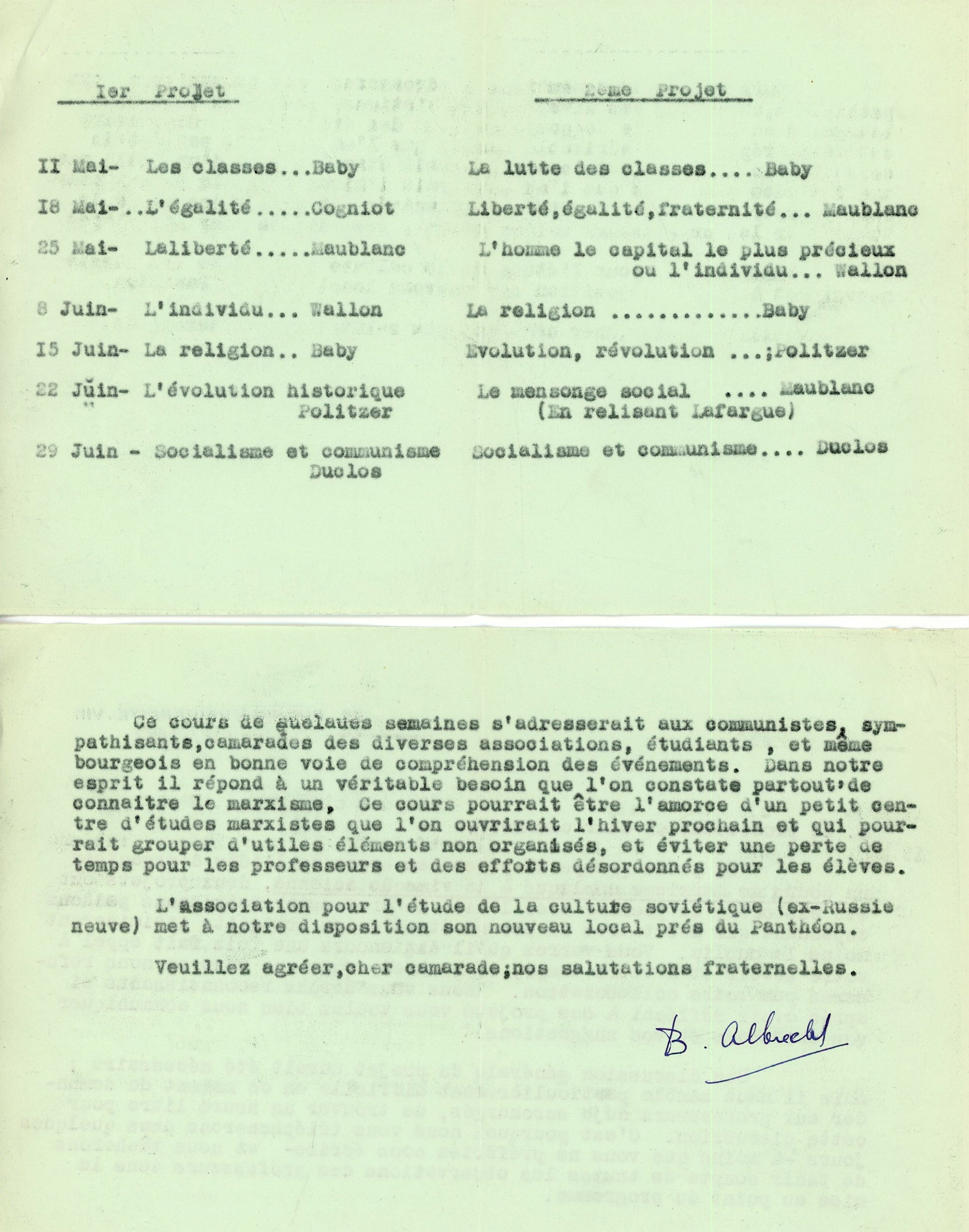 - Le Cercle de la Russie Neuve (1928-1936), puis l’Association pour l’étude de la culture soviétique (1936-1939): 16 L.A.S., L.S. et P.A.S., 1930-1939, Gabrielle DUCHÊNE (1870-1954) ; 2 coupures de presse relatives au décès en août 1954 de Gabrielle Duchêne + « Gabrielle Duchêne 1870-1954 », Ligue internationale de femmes pour la paix et la liberté, 1954, plaquette in-8, 34 pages ; L.A.S. et L.S. Berthe Wild dite Berthy ALBRECHT (1893-1943), féministe, compagne de Victor BASCH, président de la Ligue des droits de l’homme, résistante dès 1940 dans le Mouvement de la Libération Nationale rebaptisé Combat en décembre 1941, arrêtée en avril 1942, évadée en décembre 1942, de nouveau arrêtée le 28 mai 1943 à la suite d’un piège tendu par Klaus Barbie, torturée puis transférée à la prison de Fresnes le 31 mai où elle y est retrouvée pendue. L’une des six femmes Compagnons de la Libération ; « Les documents de la Russie Neuve »: 7 plaquettes ou brochures dont n°2 « Les plans d’intervention contre l’U.R.S.S. – Le procès de Moscou » par René Maugal (Maublanc), mars 1931 ; n°6 « Le problème colonial et les Soviets » par R.M., août 1932 + 21 numéros du bulletin mensuel, 1935-1939 ; Lot de questionnaires ronéotypés produits par les commissions du Cercle de la Russie Neuve et envoyés en U.R.S.S. ; Les cours de marxisme: 3 brochures sténotypées n°1 Les classes sociales par Jean Baby (8 mai 1936), n°2 L’Egalité par Jean Baby, et n°4 La liberté par René Maublanc (12 juin 1936) + « Hegel et Marx », exposé tenu par R.M. à la commission scientifique du CRN, 17 mai 1934, notes manuscrites + tapuscrit de 33 pages in-4 + « Marx et Bergson » par Marcel Prenant, tapuscrit de la conférence à la Russie Neuve, 13 pages in-4 + « Le Matérialisme dialectique », brouillon manuscrit de R.M. des passages non utilisés, 23 pages in-4 + 8 L.A.S. et P.A.S., janv. à mai 1936, Franck DUBOIS, ancien élève de R.M., échange sur les cours du marxisme ; « A la lumière du marxisme »: « Socialisme utopique et socialisme scientifique » par R.M., 4 brochures sténotypées in-4 19-22-24 et 28 pages + brouillon tapuscrit du cahier n°1 ; env. 30 L.A.S., P.A.S. et L.S., 1931-1942, dont Henri WALLON, André VARAGNAC, Jean BABY ; Georges FRIEDMANN ; Henri MINEUR astrophysicien au sujet des droits d’auteurs lors de la publication du livre « A la lumière du Marxisme » ; Charles PARAIN ;