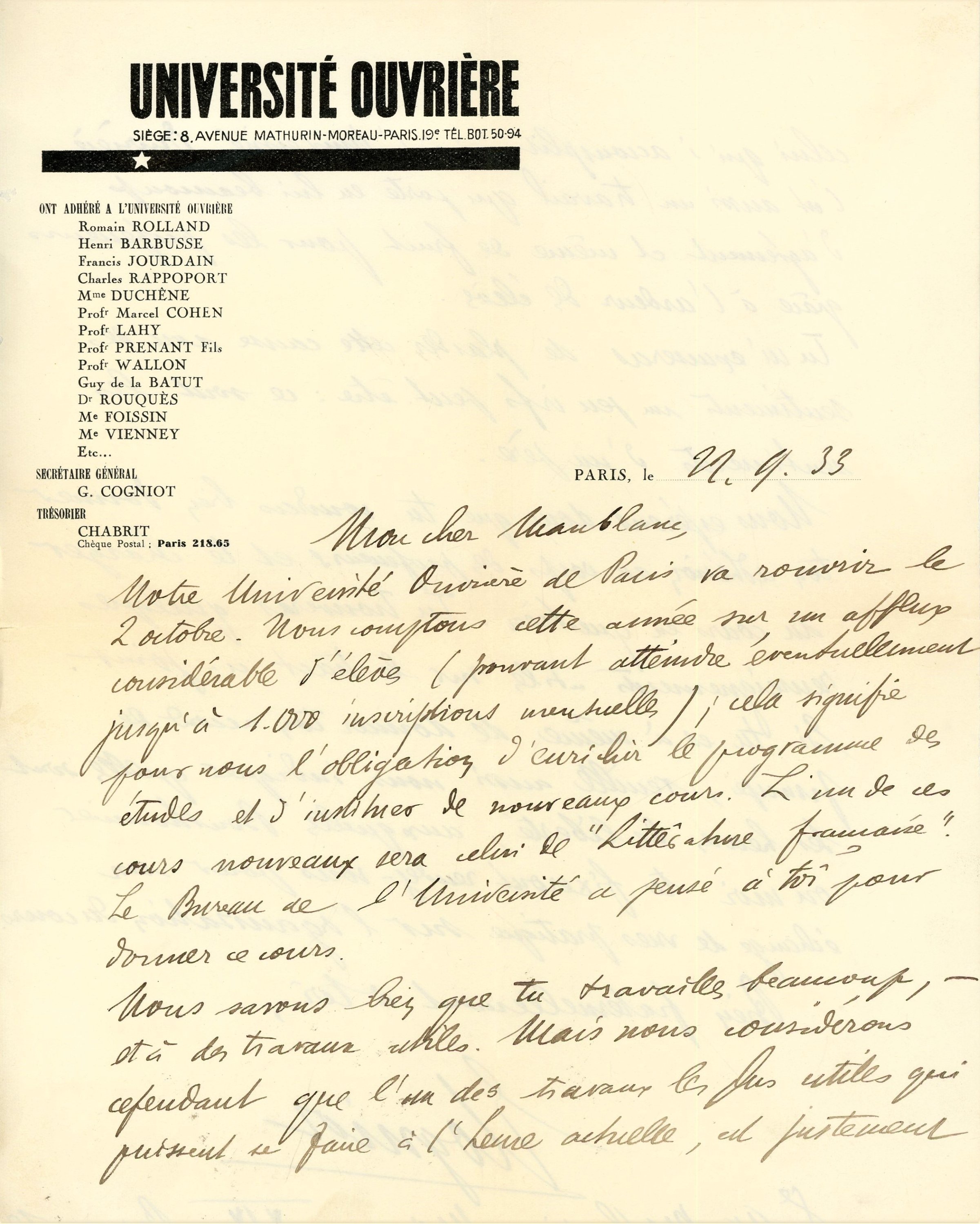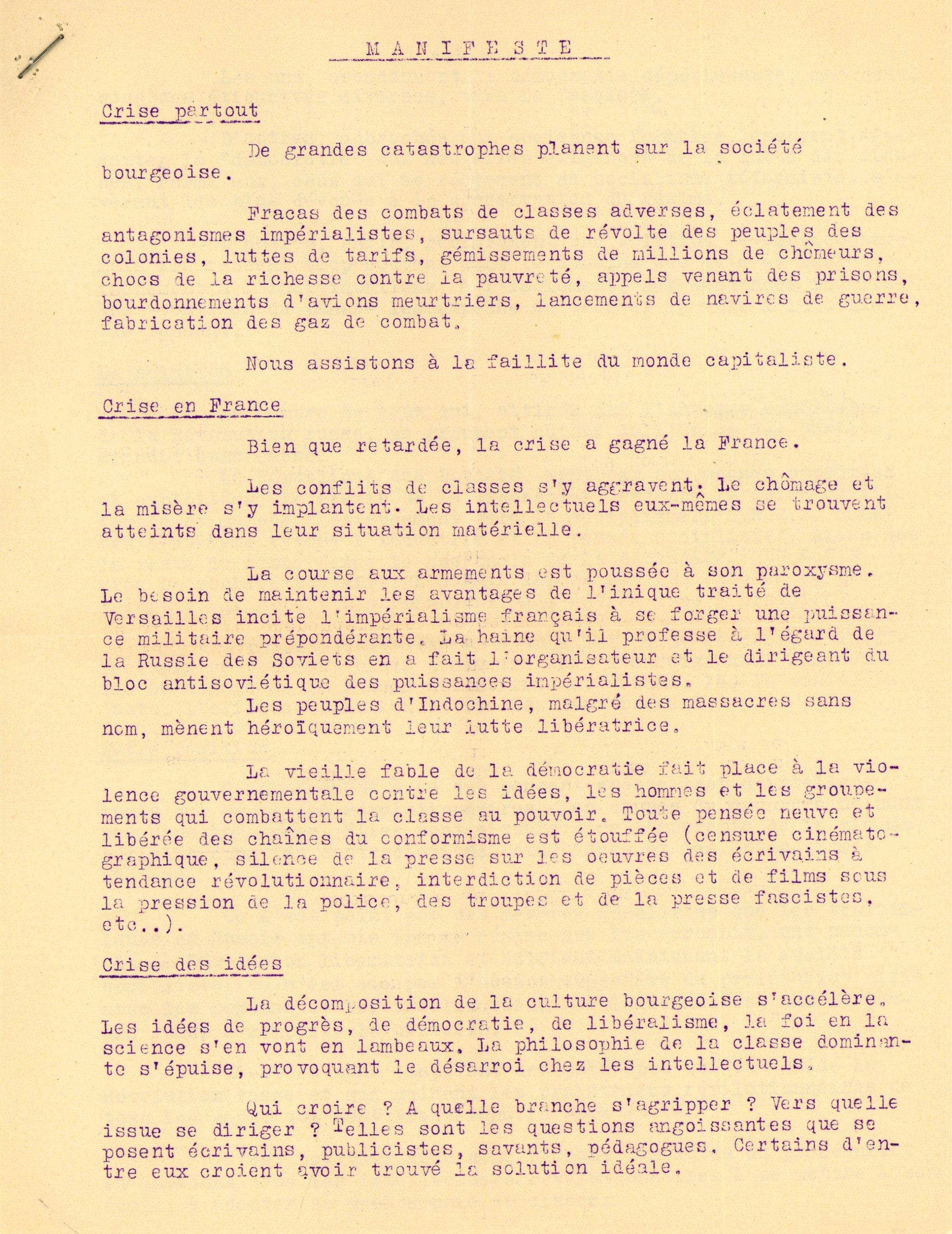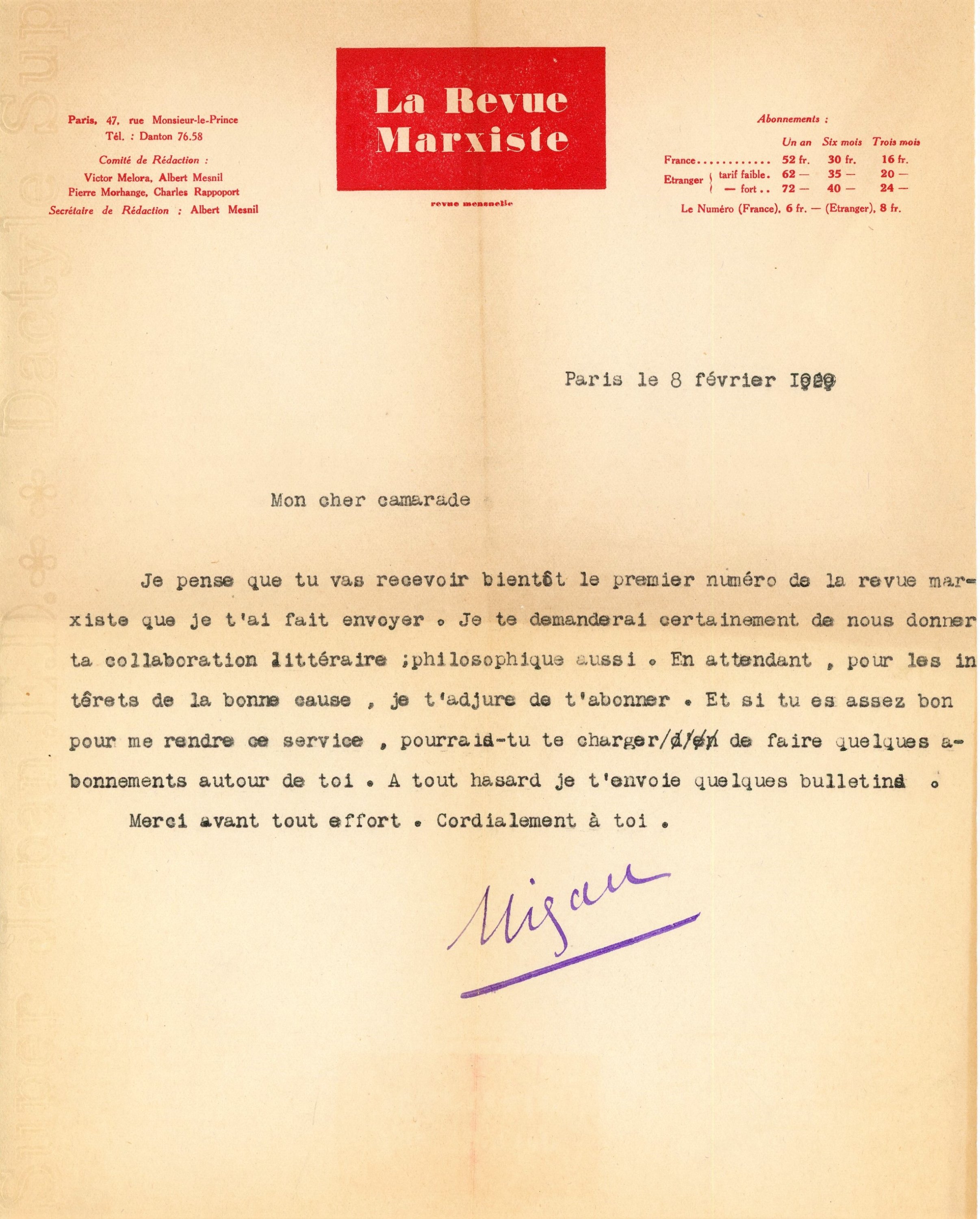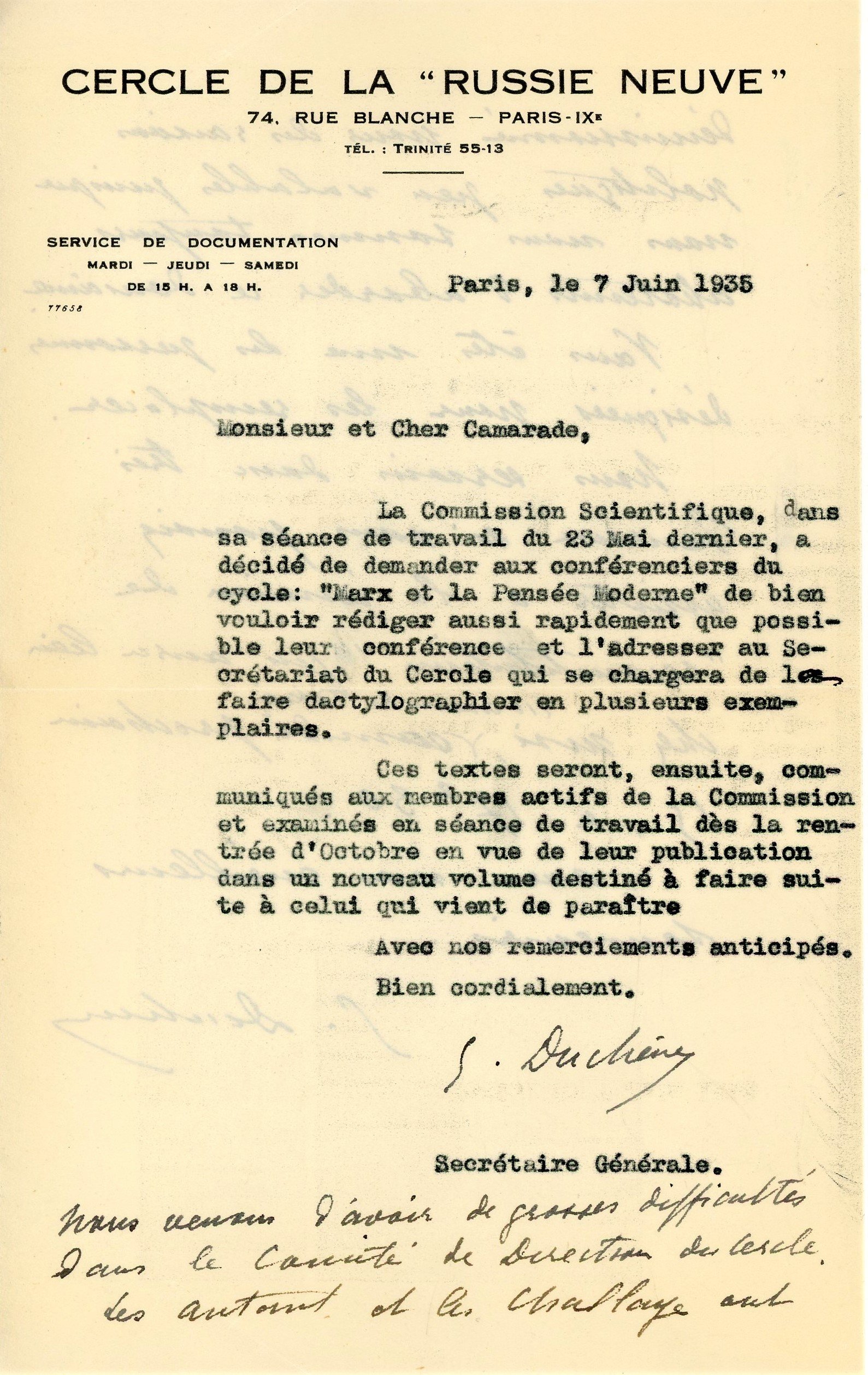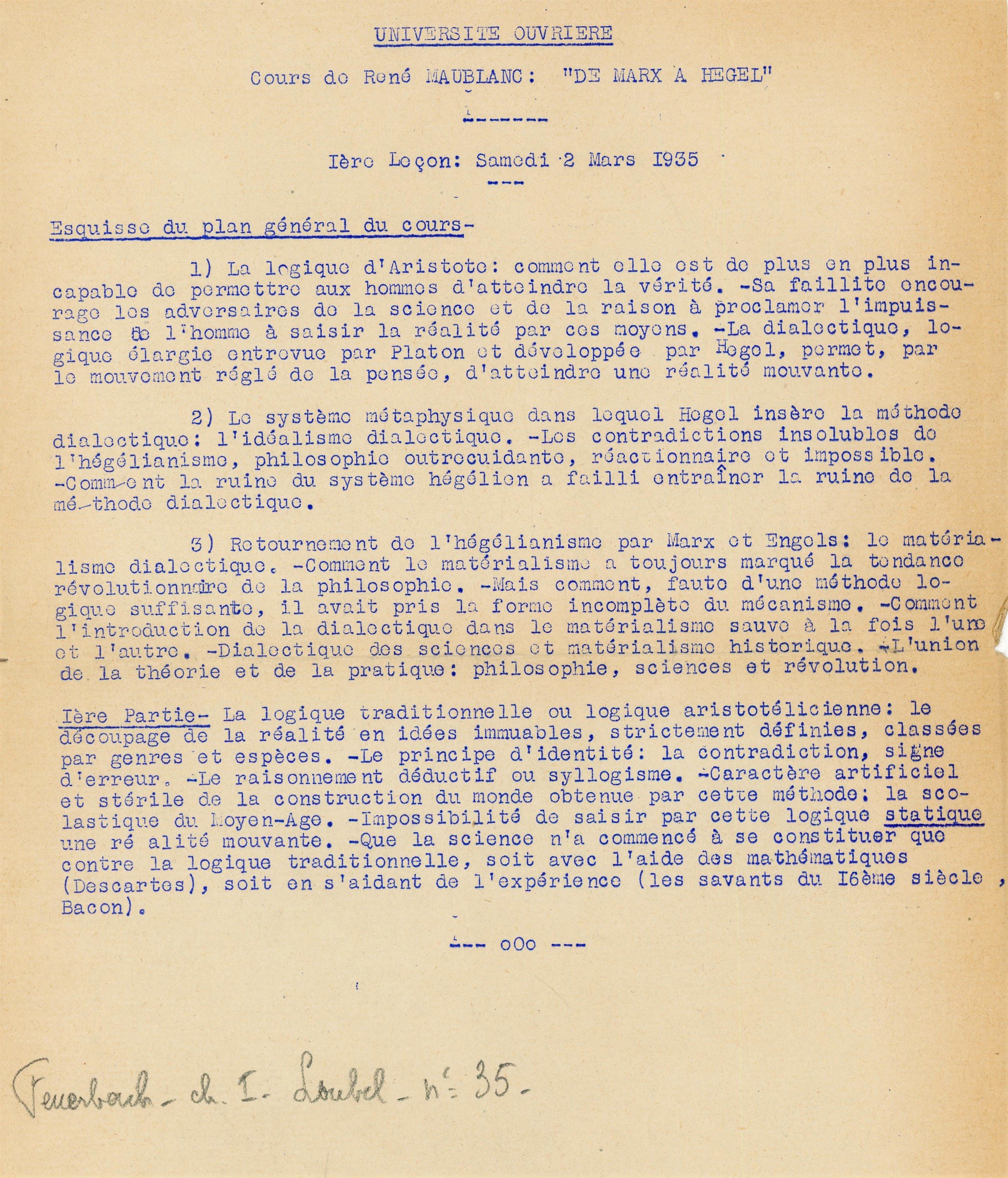 - Le Cercle de la Russie Neuve (1928-1936), puis l’Association pour l’étude de la culture soviétique (1936-1939): 16 L.A.S., L.S. et P.A.S., 1930-1939, Gabrielle DUCHÊNE (1870-1954) ; 2 coupures de presse relatives au décès en août 1954 de Gabrielle Duchêne + « Gabrielle Duchêne 1870-1954 », Ligue internationale de femmes pour la paix et la liberté, 1954, plaquette in-8, 34 pages ; L.A.S. et L.S. Berthe Wild dite Berthy ALBRECHT (1893-1943), féministe, compagne de Victor BASCH, président de la Ligue des droits de l’homme, résistante dès 1940 dans le Mouvement de la Libération Nationale rebaptisé Combat en décembre 1941, arrêtée en avril 1942, évadée en décembre 1942, de nouveau arrêtée le 28 mai 1943 à la suite d’un piège tendu par Klaus Barbie, torturée puis transférée à la prison de Fresnes le 31 mai où elle y est retrouvée pendue. L’une des six femmes Compagnons de la Libération ; « Les documents de la Russie Neuve »: 7 plaquettes ou brochures dont n°2 « Les plans d’intervention contre l’U.R.S.S. – Le procès de Moscou » par René Maugal (Maublanc), mars 1931 ; n°6 « Le problème colonial et les Soviets » par R.M., août 1932 + 21 numéros du bulletin mensuel, 1935-1939 ; Lot de questionnaires ronéotypés produits par les commissions du Cercle de la Russie Neuve et envoyés en U.R.S.S. ; Les cours de marxisme: 3 brochures sténotypées n°1 Les classes sociales par Jean Baby (8 mai 1936), n°2 L’Egalité par Jean Baby, et n°4 La liberté par René Maublanc (12 juin 1936) + « Hegel et Marx », exposé tenu par R.M. à la commission scientifique du CRN, 17 mai 1934, notes manuscrites + tapuscrit de 33 pages in-4 + « Marx et Bergson » par Marcel Prenant, tapuscrit de la conférence à la Russie Neuve, 13 pages in-4 + « Le Matérialisme dialectique », brouillon manuscrit de R.M. des passages non utilisés, 23 pages in-4 + 8 L.A.S. et P.A.S., janv. à mai 1936, Franck DUBOIS, ancien élève de R.M., échange sur les cours du marxisme ; « A la lumière du marxisme »: « Socialisme utopique et socialisme scientifique » par R.M., 4 brochures sténotypées in-4 19-22-24 et 28 pages + brouillon tapuscrit du cahier n°1 ; env. 30 L.A.S., P.A.S. et L.S., 1931-1942, dont Henri WALLON, André VARAGNAC, Jean BABY ; Georges FRIEDMANN ; Henri MINEUR astrophysicien au sujet des droits d’auteurs lors de la publication du livre « A la lumière du Marxisme » ; Charles PARAIN ;