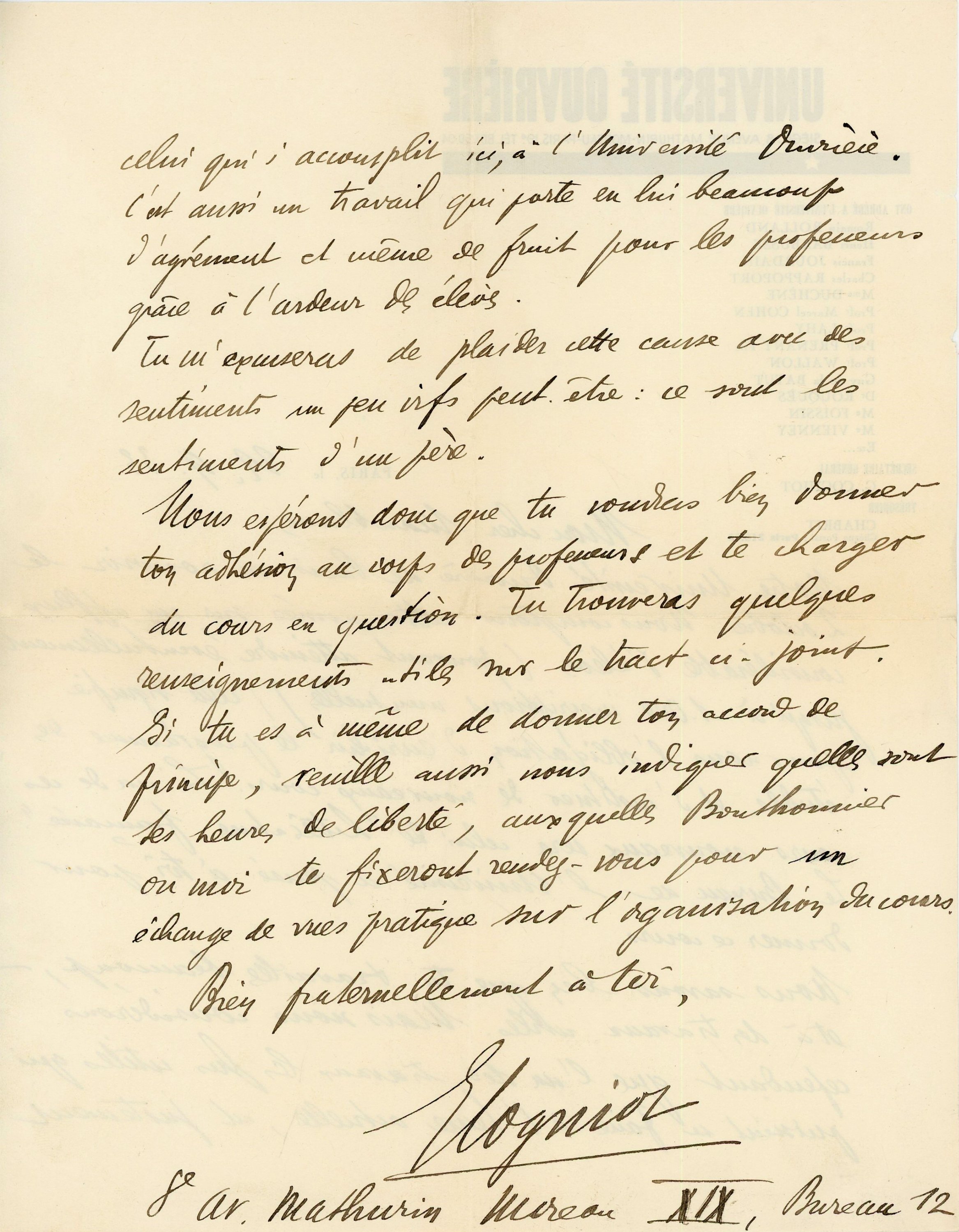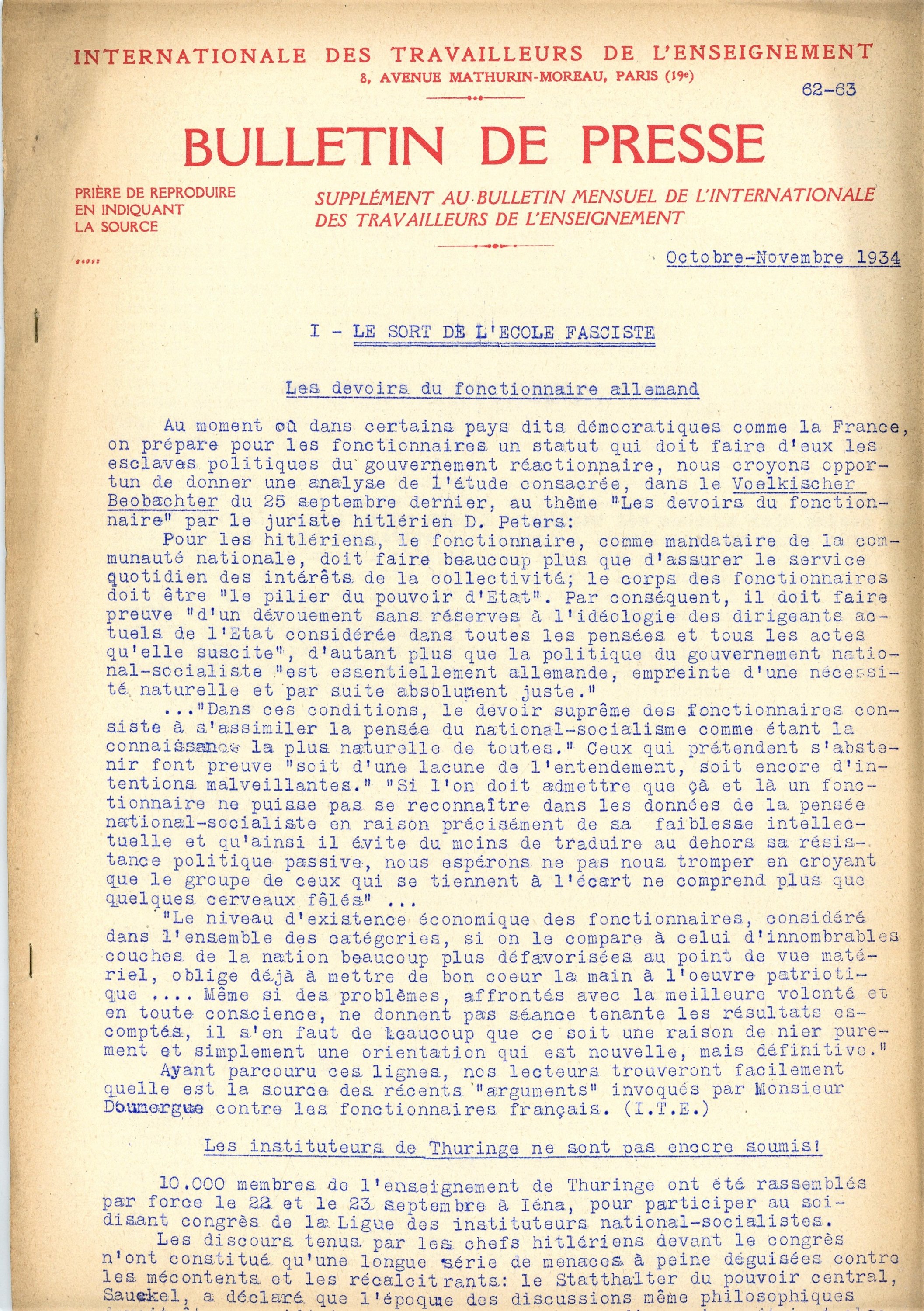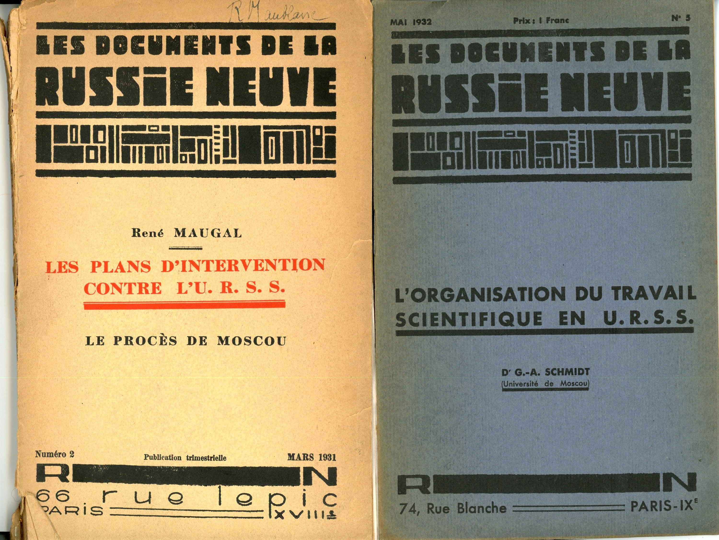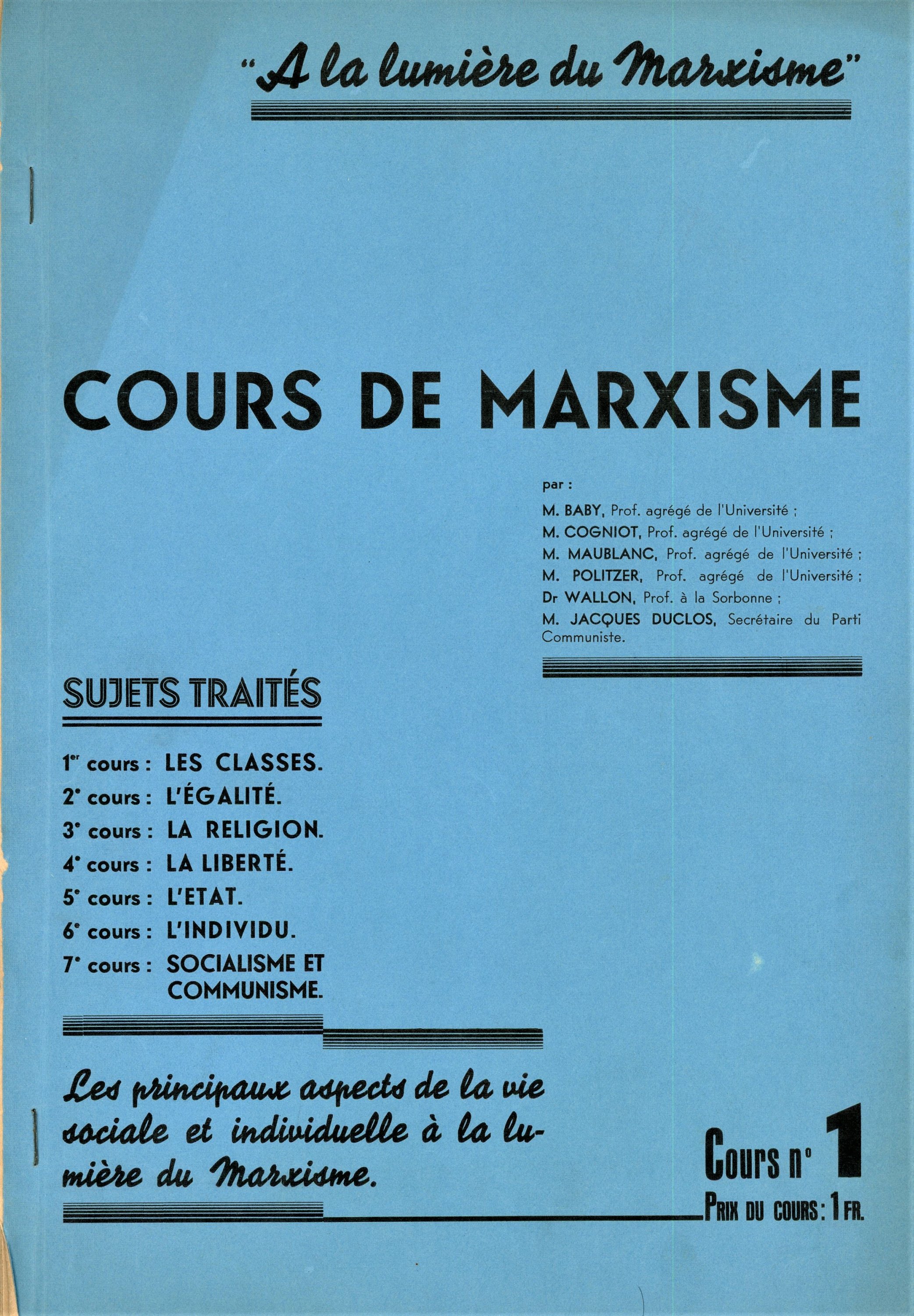 - Le Cercle de la Russie Neuve (1928-1936), puis l’Association pour l’étude de la culture soviétique (1936-1939): 16 L.A.S., L.S. et P.A.S., 1930-1939, Gabrielle DUCHÊNE (1870-1954) ; 2 coupures de presse relatives au décès en août 1954 de Gabrielle Duchêne + « Gabrielle Duchêne 1870-1954 », Ligue internationale de femmes pour la paix et la liberté, 1954, plaquette in-8, 34 pages ; L.A.S. et L.S. Berthe Wild dite Berthy ALBRECHT (1893-1943), féministe, compagne de Victor BASCH, président de la Ligue des droits de l’homme, résistante dès 1940 dans le Mouvement de la Libération Nationale rebaptisé Combat en décembre 1941, arrêtée en avril 1942, évadée en décembre 1942, de nouveau arrêtée le 28 mai 1943 à la suite d’un piège tendu par Klaus Barbie, torturée puis transférée à la prison de Fresnes le 31 mai où elle y est retrouvée pendue. L’une des six femmes Compagnons de la Libération ; « Les documents de la Russie Neuve »: 7 plaquettes ou brochures dont n°2 « Les plans d’intervention contre l’U.R.S.S. – Le procès de Moscou » par René Maugal (Maublanc), mars 1931 ; n°6 « Le problème colonial et les Soviets » par R.M., août 1932 + 21 numéros du bulletin mensuel, 1935-1939 ; Lot de questionnaires ronéotypés produits par les commissions du Cercle de la Russie Neuve et envoyés en U.R.S.S. ; Les cours de marxisme: 3 brochures sténotypées n°1 Les classes sociales par Jean Baby (8 mai 1936), n°2 L’Egalité par Jean Baby, et n°4 La liberté par René Maublanc (12 juin 1936) + « Hegel et Marx », exposé tenu par R.M. à la commission scientifique du CRN, 17 mai 1934, notes manuscrites + tapuscrit de 33 pages in-4 + « Marx et Bergson » par Marcel Prenant, tapuscrit de la conférence à la Russie Neuve, 13 pages in-4 + « Le Matérialisme dialectique », brouillon manuscrit de R.M. des passages non utilisés, 23 pages in-4 + 8 L.A.S. et P.A.S., janv. à mai 1936, Franck DUBOIS, ancien élève de R.M., échange sur les cours du marxisme ; « A la lumière du marxisme »: « Socialisme utopique et socialisme scientifique » par R.M., 4 brochures sténotypées in-4 19-22-24 et 28 pages + brouillon tapuscrit du cahier n°1 ; env. 30 L.A.S., P.A.S. et L.S., 1931-1942, dont Henri WALLON, André VARAGNAC, Jean BABY ; Georges FRIEDMANN ; Henri MINEUR astrophysicien au sujet des droits d’auteurs lors de la publication du livre « A la lumière du Marxisme » ; Charles PARAIN ;