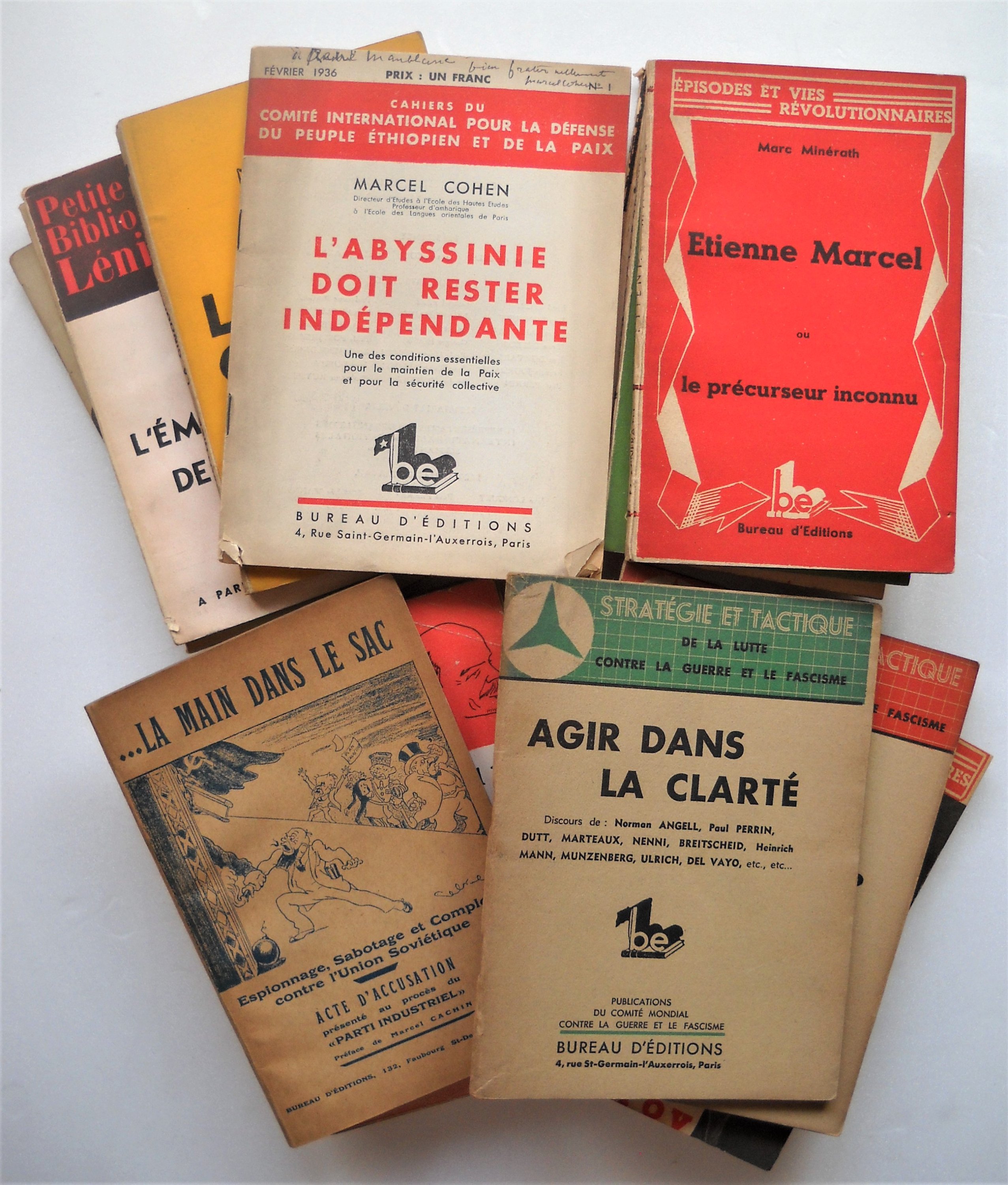 Collection « Classiques français du Socialisme »: Jean JAURÈS, Défense de la Paix, 1937, 77 pages ; Les causes économiques de la Révolution française, 1937, 104 pages ; Le Rayonnement de la Révolution française, 1939, 94 pages. Jules GUESDE, La doctrine socialiste double réponse à MM. de Mun et Paul Deschanel, 1938, 77 pages. Paul LAFARGUE, Le droit à la paresse Réfutation du droit au travail de 1848, 1935, 59 pages. Bureau dEditions, catalogue 1936 John REED, Dix jours qui ébranlèrent le monde, 213 pages, Ex. S.P. Marcel COHEN, LAbyssinie doit rester indépendante, Cahiers du comité international pour la défense du peuple éthiopien et de la paix, 1936, 31 pages. Marcel PRENANT, La Société anglaise au temps de Darwin, épreuve dimprimeur.