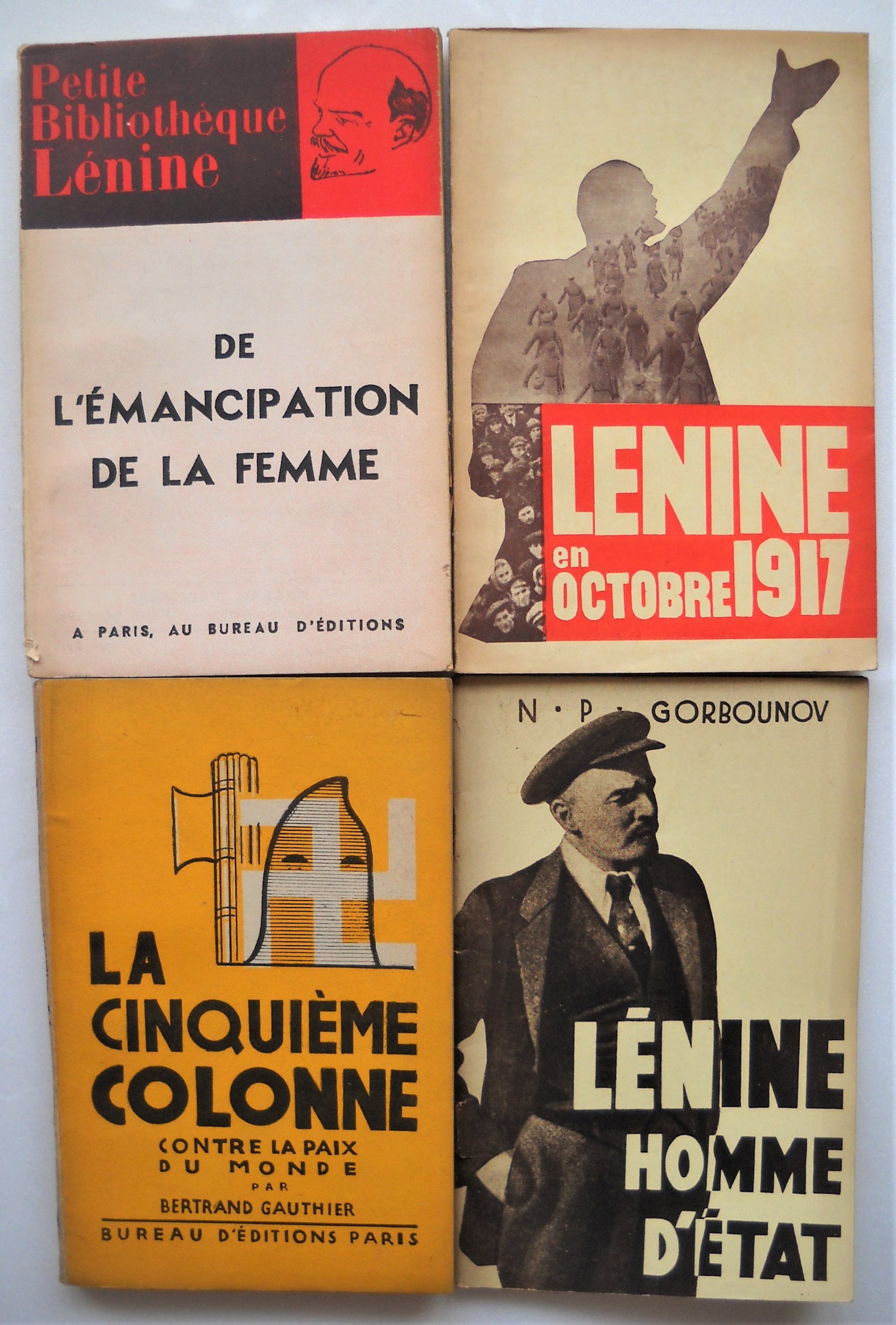 Collection « Pour mieux connaître Lénine »: N.P. GORBOUNOV, Lénine homme détat Souvenirs du secrétaire du Conseil des commissaires du peuple, 1934, 36 pages Lénine en octobre 1917, 1934, 79 pages. J. STALINE, V.I. LENINE, 1934, 29 pages. Jean BRUHAT, Le châtiment des espions et des traîtres sous la Révolution française, 1937, 64 pages.