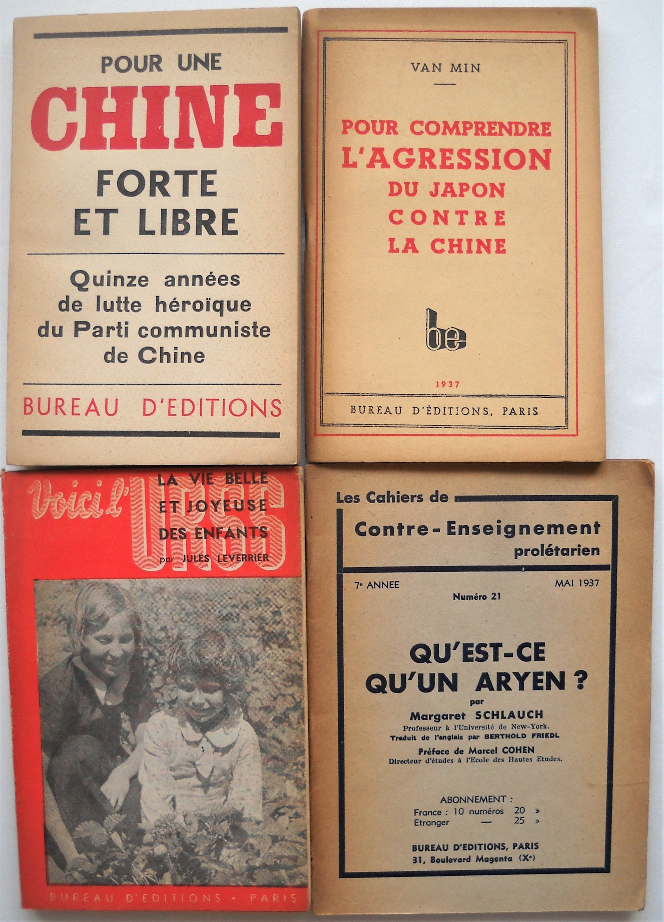 Les communistes luttent pour la paix, 1936, 111 pages, Ex. S.P. Renaud de JOUVENEL, La situation internationale, 1937, 71 pages. Ex. S.P. J. STALINE: Sur la voie du communisme Rapport présenté au XVIIIe congrès du parti communiste (bolchévik) de lU.R.S.S. le 10 mars 1939, 1939, 59 pages, Ex. S.P. ; Le marxisme et lhistoire, 1938, 31 pages. Ex. S.P. Georges DIMITROV: Lunité de la classe ouvrière dans la lutte contre le fascisme VIIe congrès mondial de lInternationale communiste, 1935, 78 pages. ; Vingt années de pouvoir soviétique, 1937, 32 pages, Ex. S.P. ; Une année de lutte héroïque du peuple espagnol, 1937, 16 pages. Ex. S.P. ; Au seuil de 1937, 1937, 32 pages. Ex. S.P. ; Deux années de lutte héroïque du peuple espagnol, 1938, 31 pages. Ex. S.P. ; LU.R.S.S. et le prolétariat international, 1939, 24 pages, Ex. S.P. Bertrand GAUTHIER: La cinquième colonne contre la paix du monde, 1938, 111 pages, Ex. S.P. ; Au pilori: Poincaré, Briand, Loucheur et leurs généraux!, 1931, 36 pages. ; Pour une Chine forte et libre Quinze années de lutte héroïque du Parti communiste de Chine, 1936, 111 pages. Ex. S.P. Jules LEVERRIER, Voici lU.R.S.S., la vie belle et joyeuse des enfants, 1938, 69 pages. VAN MIN, Pour comprendre lagression du Japon contre la Chine, 1937, 61 pages, Ex. S.P. J. STALINE et V. MOLOTOV, Le socialisme et la science, 1938, 37 pages, Ex. S.P. Margaret SCHLAUCH, Quest-ce quun arien?, Les cahiers de contre-enseignement prolétarien, 1937, 39 pages, Ex. S.P. Maxime LITVINOV, LU.R.S.S. et la paix, 1939, 200 pages ; Le fascisme démasqué devant la S.D.N. le 21 septembre 1937, 1937, 22 pages, Ex. S.P. V. MOLOTOV, Le troisième plan quinquennal, discours prononcé au XVIIIe congrès du parti communiste de lU.R.S.S. le 14 mars 1939, 1939, 83 pages. N. KRYLENKO,