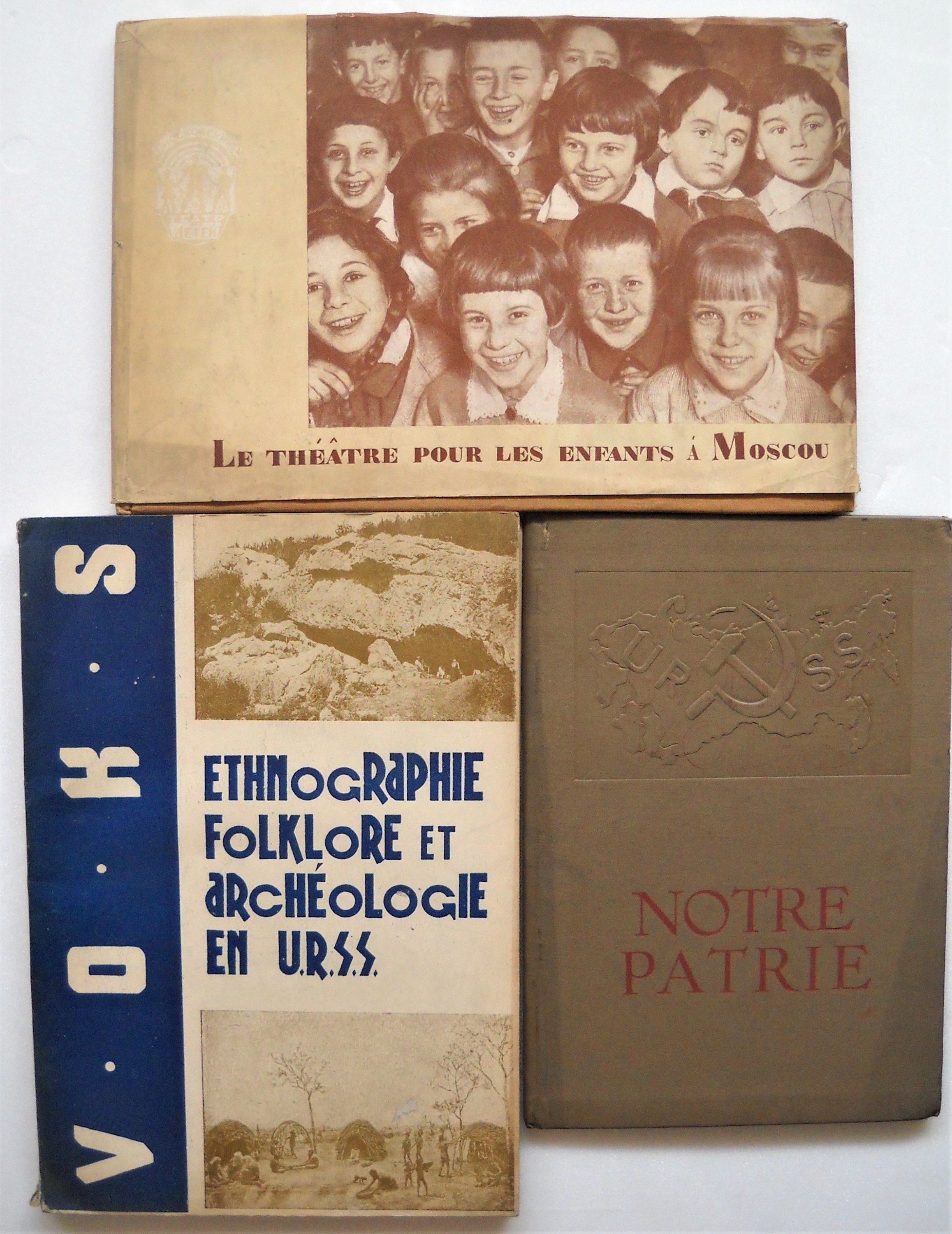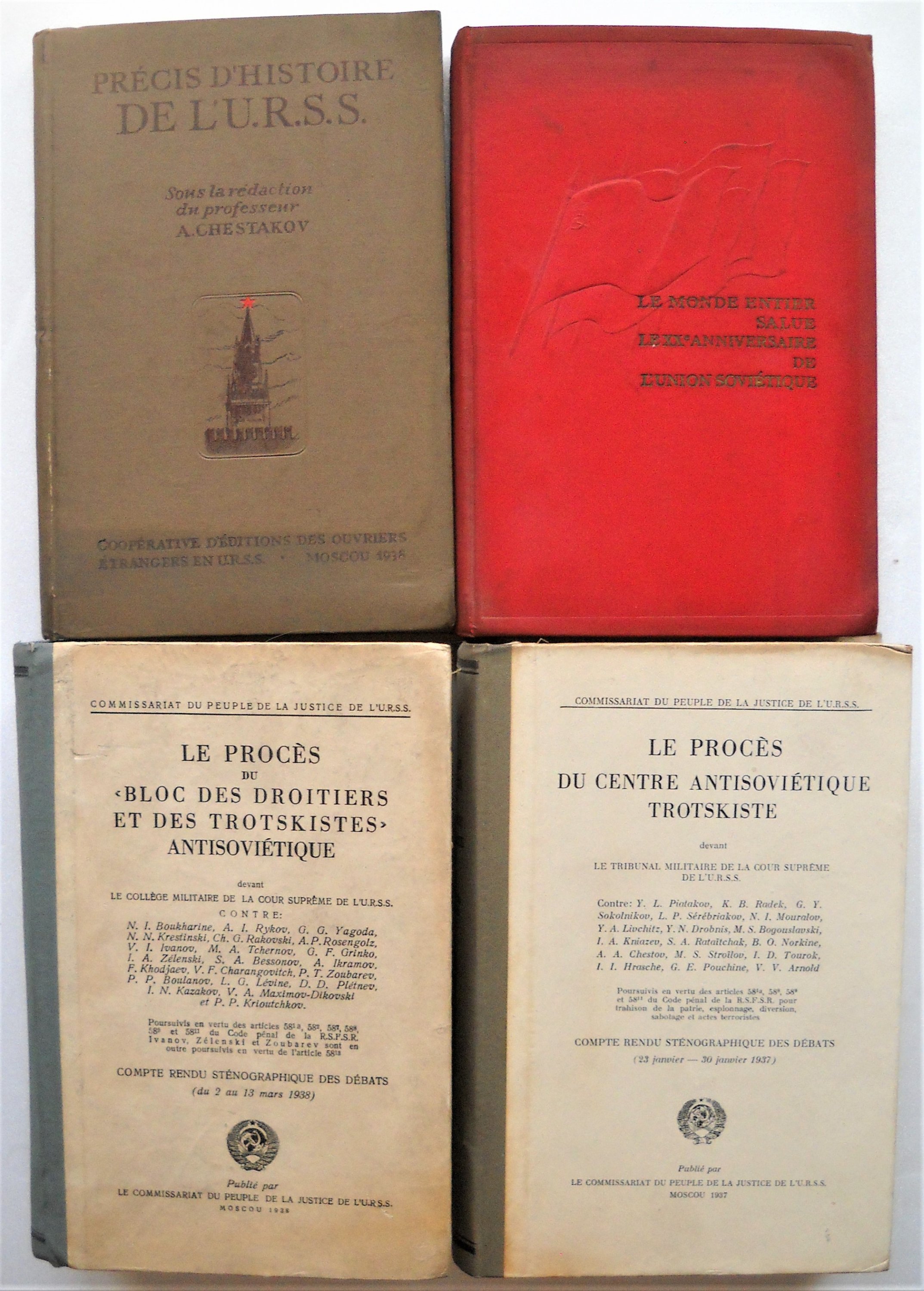 Pavel MARKOV, Théâtre académique dart de Moscou, Léningrad, 1937, rel. in-8, 145 pages. Le procès du centre antisoviétique trotskiste, Le commissariat du peuple de la justice de lURSS, Moscou, 1937, rel. in-8, 604 pages, Ex. S.P. Le procès du bloc des droitiers et des trotskistes antisoviétiques, Le commissariat du peuple de la justice de lURSS, Moscou, 1938, rel. in-8, 850 pages, Ex. S.P. Le monde entier salue le XXe anniversaire de lUnion Soviétique, Coopérative déditions des ouvriers étrangers en U.R.S.S., Moscou, 1938, rel. in-8, 295 pages. Précis de lhistoire de lU.R.S.S., Coopérative dédition des ouvriers étrangers en URSS, Moscou, 1938, rel. in-8, 247 pages. Histoire du parti communiste bolchévik de lU.R.S.S., éditions en langues étrangères, Moscou, 1939, rel. in-8, 347 pages P. POSPELOV et N. BARANSKI, Notre Patrie, Moscou, Coopérative dédition des ouvriers étrangers en U.R.S.S., rel. in-8, 76 pages. Le théâtre pour les enfants à Moscou, Barcelone, format à litalienne, 95 pages, Ex. S.P.