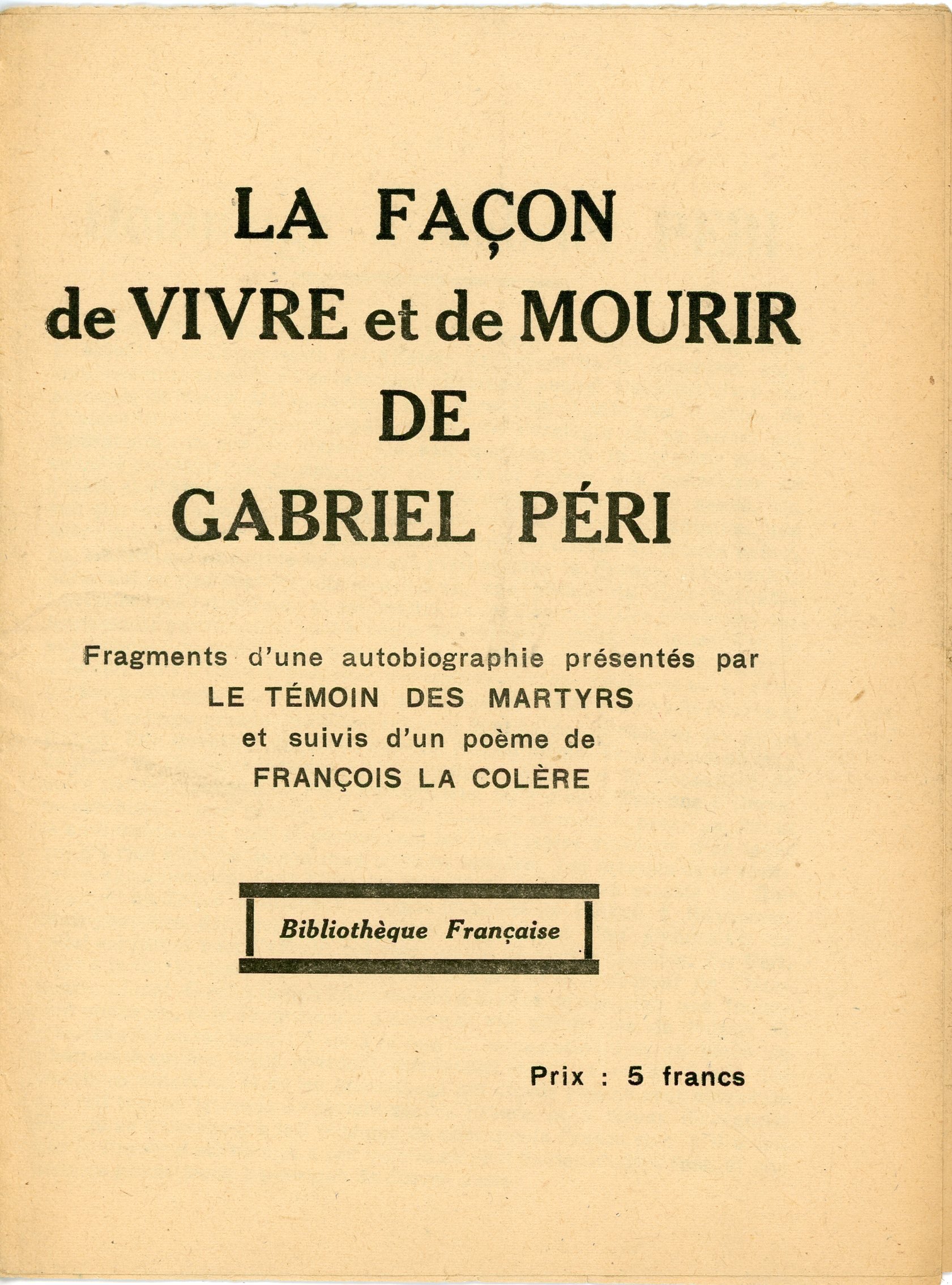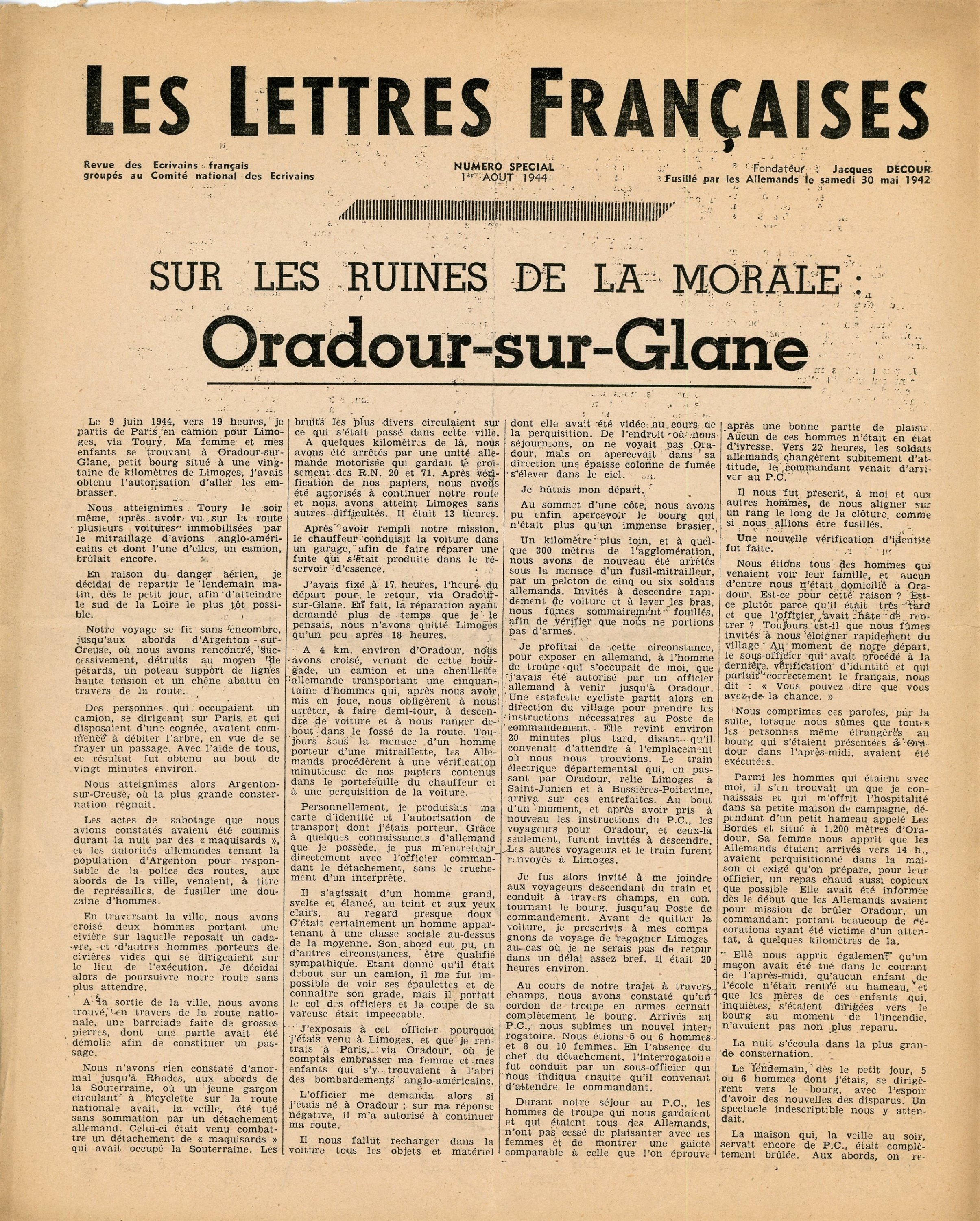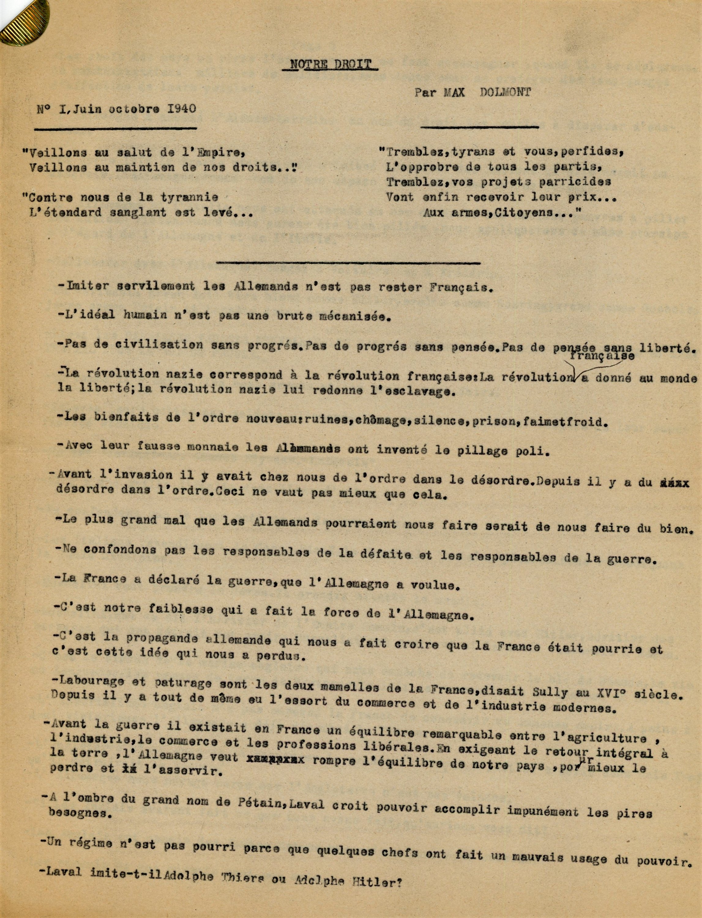 12 ex. Notre Droit par Max Dolmont (pseudonyme dEdmond Lablénie), n°1 juin oct. 1940 au n°5 et n°7 au n°12 (1940-1941), n°1 de la série de la Libération juillet 1944 ; anti-pétainiste, Edmond Lablénie pensait quil fallait faire vivre une résistance intérieure. Dans le lycée Janson-de-Sailly où il enseignait, il lança avec son épouse et un groupe de lycéens, Notre droit, publication clandestine sadressant à la jeunesse et se présentant sous la forme dun recueil de maximes antiallemandes et anti-vichystes. Distribué dans les lycées parisiens, son premier numéro contribua à la mobilisation pour la manifestation des lycéens du 11 novembre 1940 à lÉtoile, à laquelle il participa, accompagnant un cortège important délèves de son lycée. Douze numéros parurent entre octobre 1940 et octobre 1941 et une reparution eut lieu en juillet 1944 ; 5 ex. Défense de la France, n°7, 8, 10 et 11, janv.-fév. 1942, et n°42 du 15 déc. 1943 ; journal clandestin créé en juillet 1941 par un groupe détudiants parisiens pour dénoncer loccupation de la France, et qui deviendra à la libération France-Soir ; 4 ex. Le Médecin Français, 1er juillet 1942, mai et juin 1944 ; Résistance, le nouveau journal de Paris, n°18, 13 octobre 1943 ; 6 ex. Les Lettres Françaises, front national des écrivains, n°1 sept. 1942, n°11 nov. 1943, n°16 mai 1944, n°17 juin (accdts), n°18 juillet, et 1er août 1944 rare numéro spécial « Sur les ruines de la morale: Oradour-sur-Glane » ; publication littéraire clandestine créée en septembre 1942 par Jacques Decour et Jean Paulhan, faisant partie du mouvement de résistance Front national ; Deux voix françaises, Charles Péguy, Gabriel Péri, Les Éditions de Minuit, 30 juin 1944, rare premier tirage sous forme de tract, 4 pages ; La France Continue la Lutte. Textes et documents, 1940-1943, br. in-8, 125 pages, Edition de la France Libre ; Cahiers du Témoignage chrétien Alsace et Lorraine, terres françaises, oct.-déc. 1943, plaquette in-8, 64 pages ; n°1 doct. 1943 du Front National, organe de liaison du comité directeur du Front national pour la libération de la France avec ses comités départementaux, locaux, d'entreprise, + 3 ex. Front national journal central du Front national de lutte pour la libération et l'indépendance de la France, n°3, 5 et 6, mars-juin 1944 ; La façon de vivre et de mourir de Gabriel Péri. Fragments dune autobiographie présentés par Le Témoin des Martyrs et suivis dun poème de François La colère, La Bibliothèque Française, c. 1943, 12 pages ; 2 ex. Le Patriote, organe du Front National de Lutte pour la Libération de la France, avril et mai 1944 ; n°2 Bibliographie de la France, journal général de la librairie française clandestine, avril 1944 ; 2 ex. La Défense, journal mensuel du Secours Populaire de France, n°53, juin 1944 ; Le Palais Libre organe du front national des juristes, n°11, juillet 1944 ; 3 ex. La Nouvelle République, Patriam Recuperare, 9 et 19 juillet, 8 août 1944.