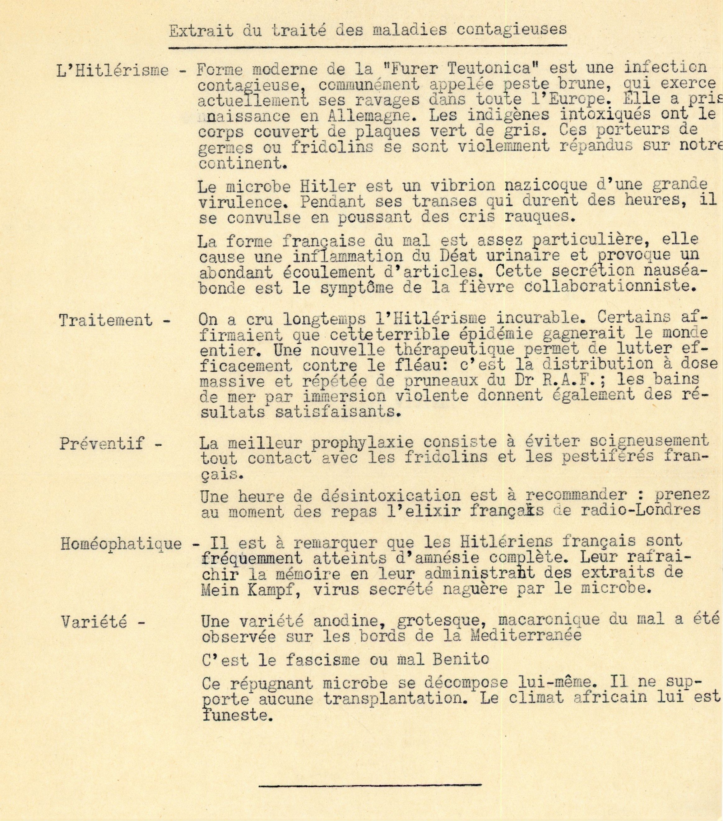 - 2 copies tapuscrites des lettres ouvertes, 14 juillet et 14 novembre 1940, adressées par Paul RIVET, créateur du musée de lHomme, au maréchal Pétain: « Monsieur le Maréchal, le pays n'est pas avec vous, la France n'est plus avec vous » avec mot manuscrit « A Georges Contenot qui restera toujours pour moi le « frère » de pensée de juillet 1940 » et signé « Dr Rivet » ; [lélixir radio-Londres] Extrait du traité des maladies contagieuses, 1 page tapuscrit in-4 qui dénonce le nazisme et le fascisme ; Vous ne laurez pas eu