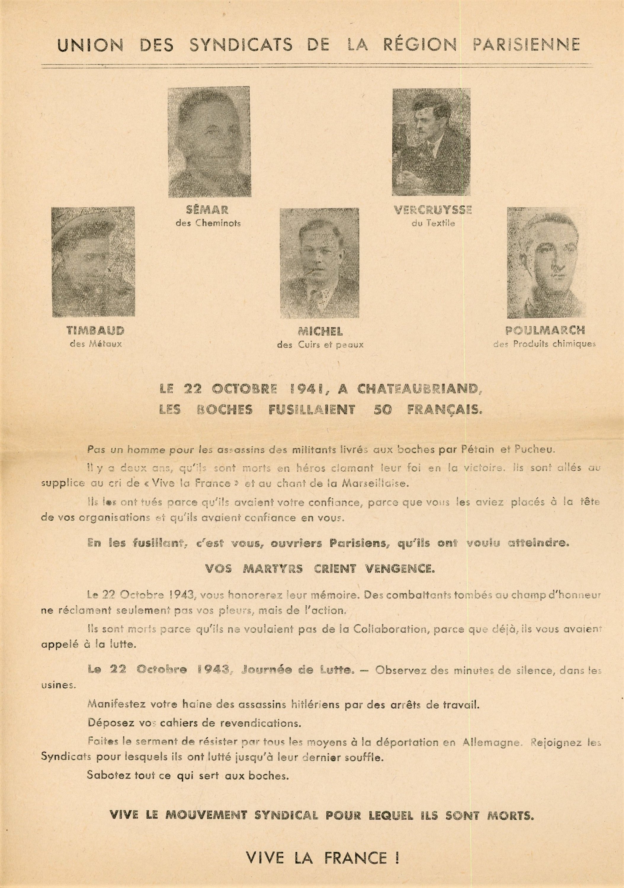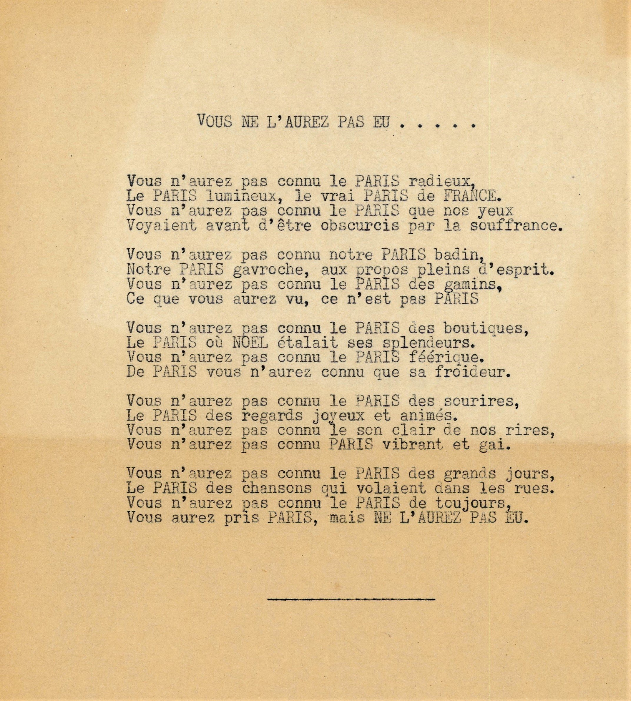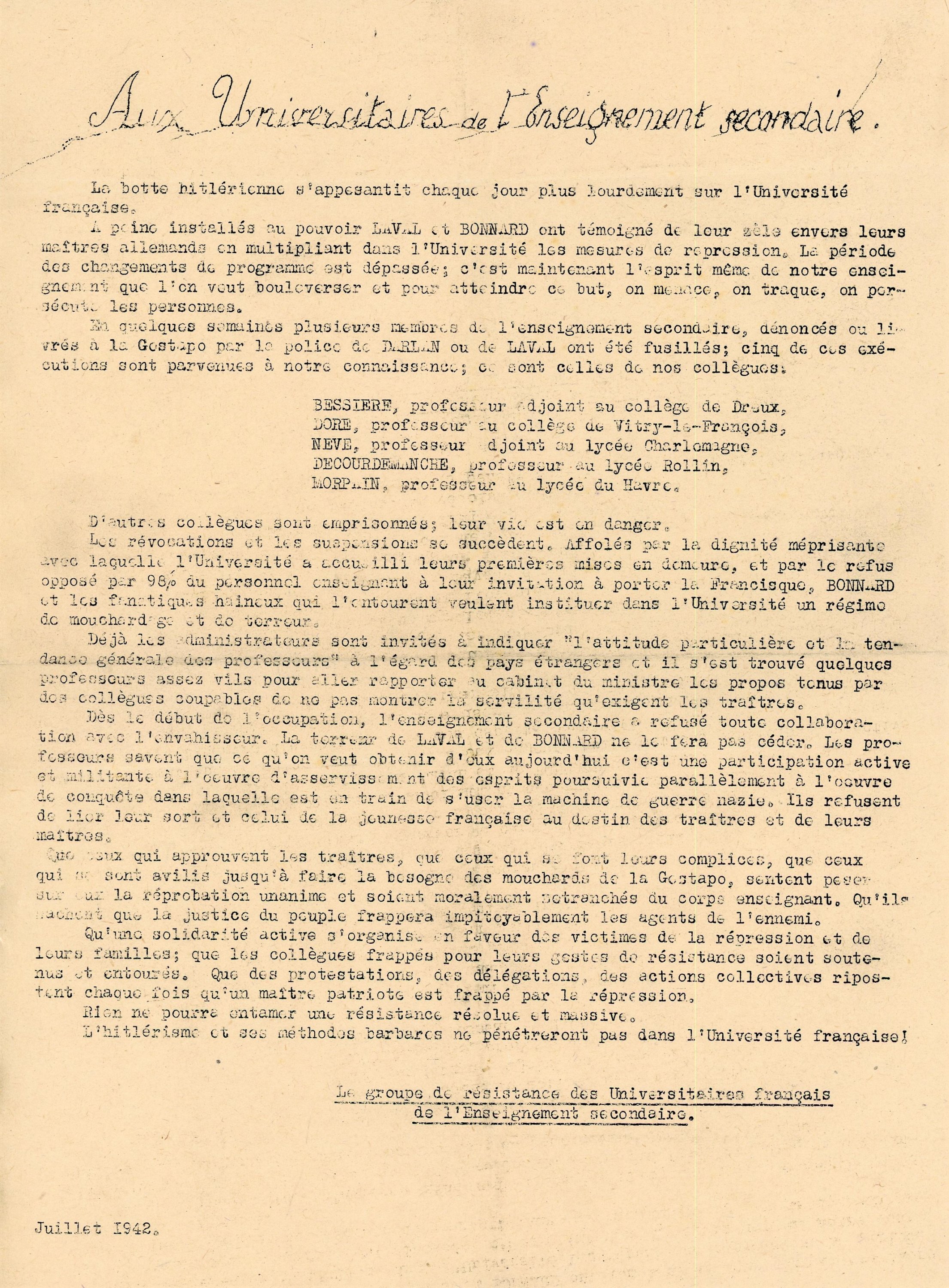 , poème évoquant la résistance des parisiens, 1 page tapuscrit in-4 ; Conseil national de la résistance, statut des comités départementaux de la Libération, s.d., 6 pages in-4 ; Lettre ouverte à Monsieur Georges Claude, Front national de lutte pour lindépendance et la liberté de la France, juillet 1942, 1 page ½ ronéotypée ; Aux universitaires de lEnseignement secondaire, juillet 1942, 1 page in-4 ronéotée ; Copie tapuscrite de la lettre du 5 novembre 1943 dAnatole de Monzie adressée au maréchal Pétain ; Peine perdue, Monsieur Bonnard!, 1er octobre 1942, 4 pages ronéo ; Les brutes sinistres de la Gestapo ont assassiné deux grands intellectuels français, Georges Politzer et Jacques Solomon, août 1942, 5 pages ronéo ; Il y a des juges à Alger, Le Témoin des Martyrs, 22 octobre 1943 ; Pour lunité totale de toutes les forces françaises et la participation active de la France à la guerre antihitlérienne aux côtés des alliés, déclaration du Parti communiste français, s.d., 3 pages ronéo ; 2 ex. Pas un homme! Pas un gramme de métal! Pas un centime aux traitres de Vichy et aux boches! ; La dernière carte dHitler: lanticommunisme, [mars 1944] ; Déclaration collective faite au procès des 17 et 31 mars 1944 devant le tribunal dEtat, avant le verdict, tapuscrit, 1 page ½: « (