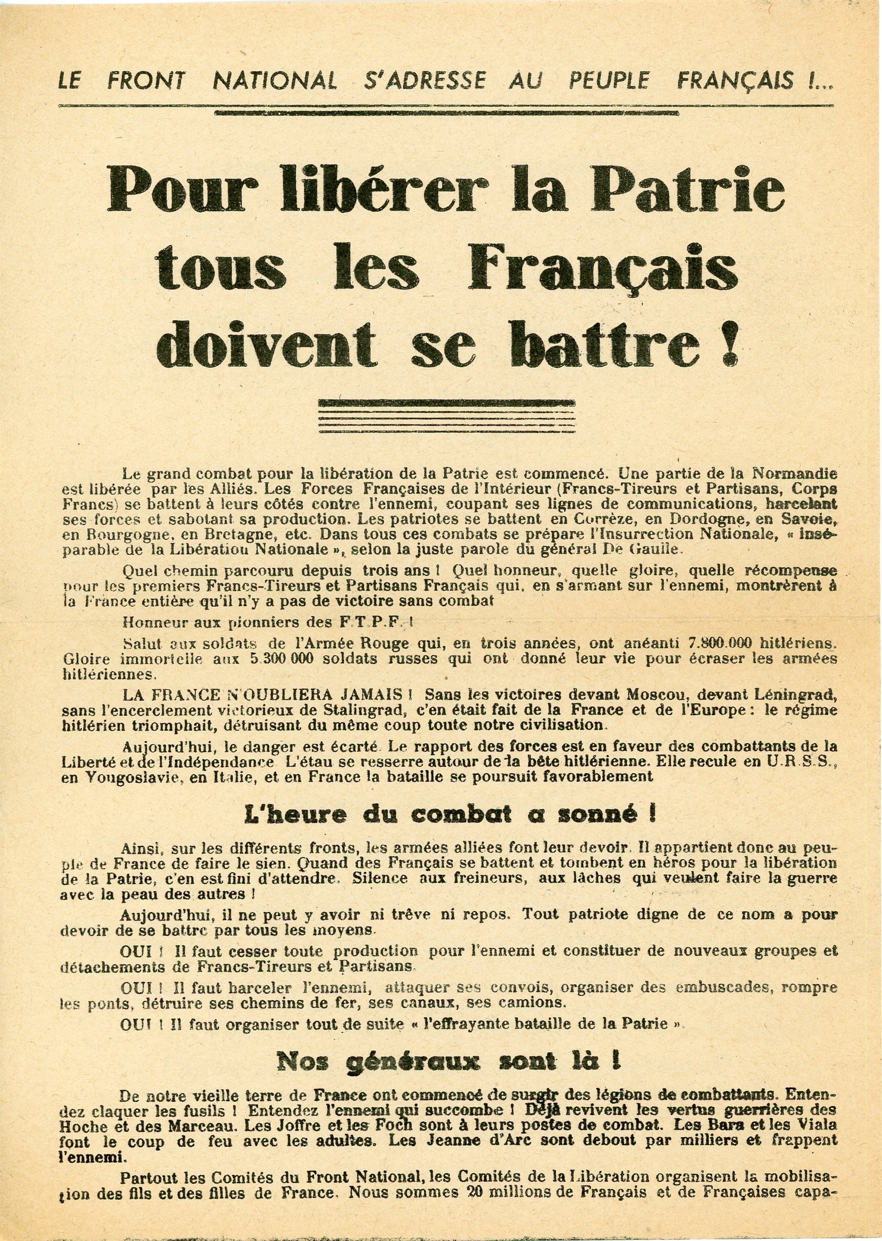 », comité directeur du Front national, [avril 1944], br. in-12 ; Solidarité de la résistance, union des groupements de solidarité patriotique et de la résistance française, [1944] ; Le 22 octobre 1941, à Chateaubriand les boches fusillaient 50 français Le 22 octobre 1943, journée de lutte, union des syndicats de la région parisienne ; Rapport tapuscrit Etat sanitaire des détenues politiques à la Roquette depuis un mois environ, 10 février 1944, 4 pages in-4 ; Communiqué du comité de libération nationale de la Dordogne ; 2 communiqués nationaux hebdomadaires des F.T.P.F. dont Comment se battent les francs-tireurs et partisans français: un combat de 14 heures à un contre vingt, puis à un contre quarante, Front national, mars 1944 ; 3 tracts des Forces Françaises Intérieures ; Henriot est mort, vive la France!, [juin 1944], Front national de lutte pour la Libération et lIndépendance de la France ; Lheure est venue de combattre, 16 juin 1944, union des étudiants patriotes ; 3 ex. Pour libérer la Patrie tous les Français doivent se battre!, Front national de lutte pour la Libération et lIndépendance de la France, juillet 1944 ; Après le débarquement des troupes alliées sur notre sol national, les devoirs qui simposent au peuple de France, comité central du parti communiste, [juin 1944], 7 pages in-4 ; Nous ne partirons pas!, syndicats des enseignants reconstitués clandestinement,[1944 ] ; Vive luniversité française!, front national universitaire ; Fédération générale des fonctionnaires aux membres de lenseignement public aux membres de lEnseignement public, juin 1944 ; Esquisse dune politique française de lenseignement, 30 septembre 1943, tapuscrit de 45 pages in-4 ; texte clandestin présenté par Georges COGNIOT au nom du parti communiste aux groupements de la Résistance ; Manifeste du parti communiste, Karl Marx et Friedrich Engels, février 1941.