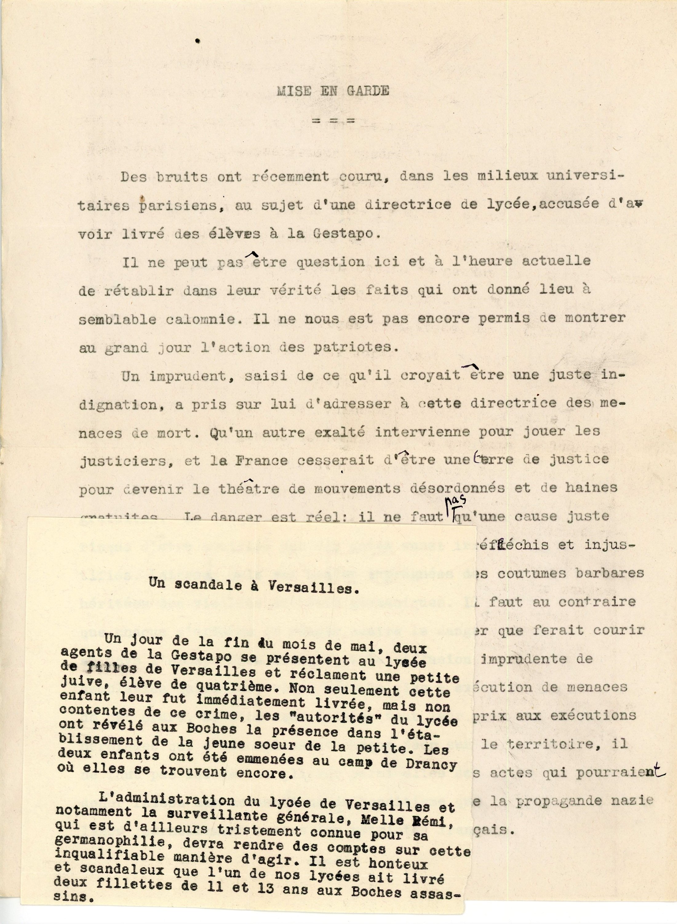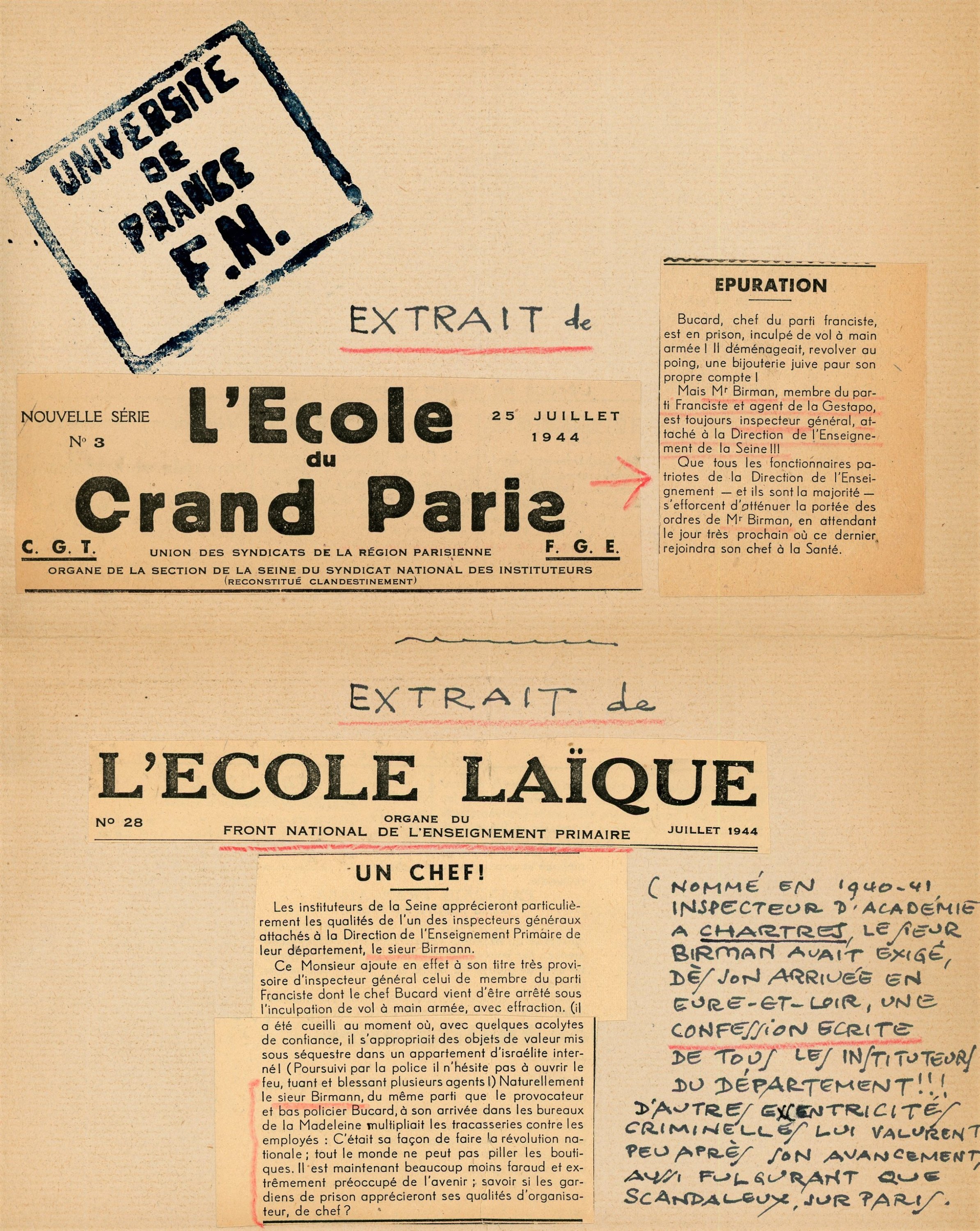 - Annotations manuscrites de R.M. sur des bouts de papier listant les professeurs et inspecteurs suspectés de collaboration, des sanctions prises, etc ;