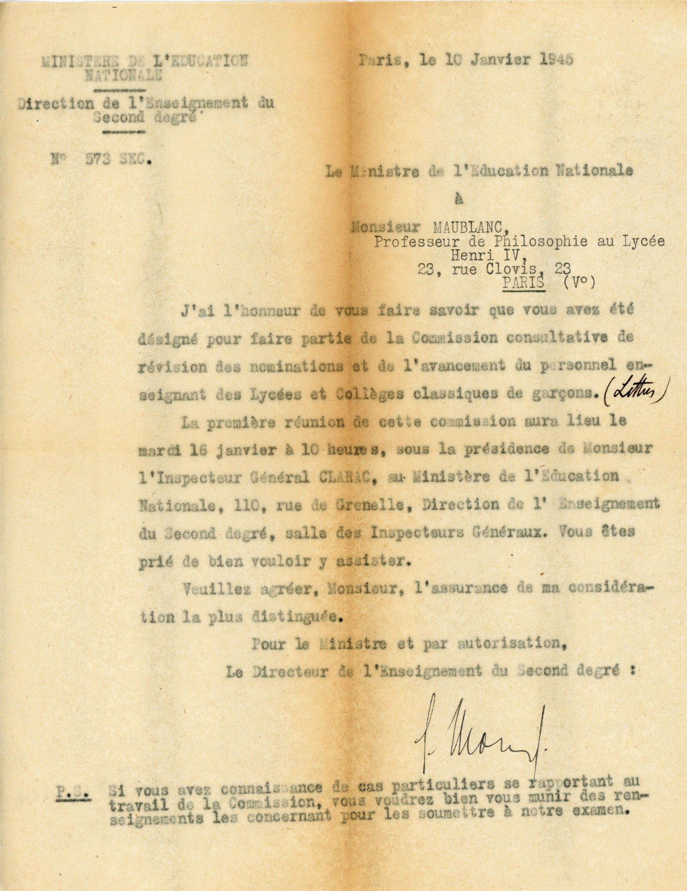 - L.S., 10 janvier 1945, Gustave MONOD (1885-1968), directeur de lenseignement du Second degré et au nom du ministre de lEducation nationale, nomme René Maublanc comme membre de la commission consultative de révision des nominations et de lavancement du personnel enseignant des lycées et collèges classiques de garçons, section Lettres ;