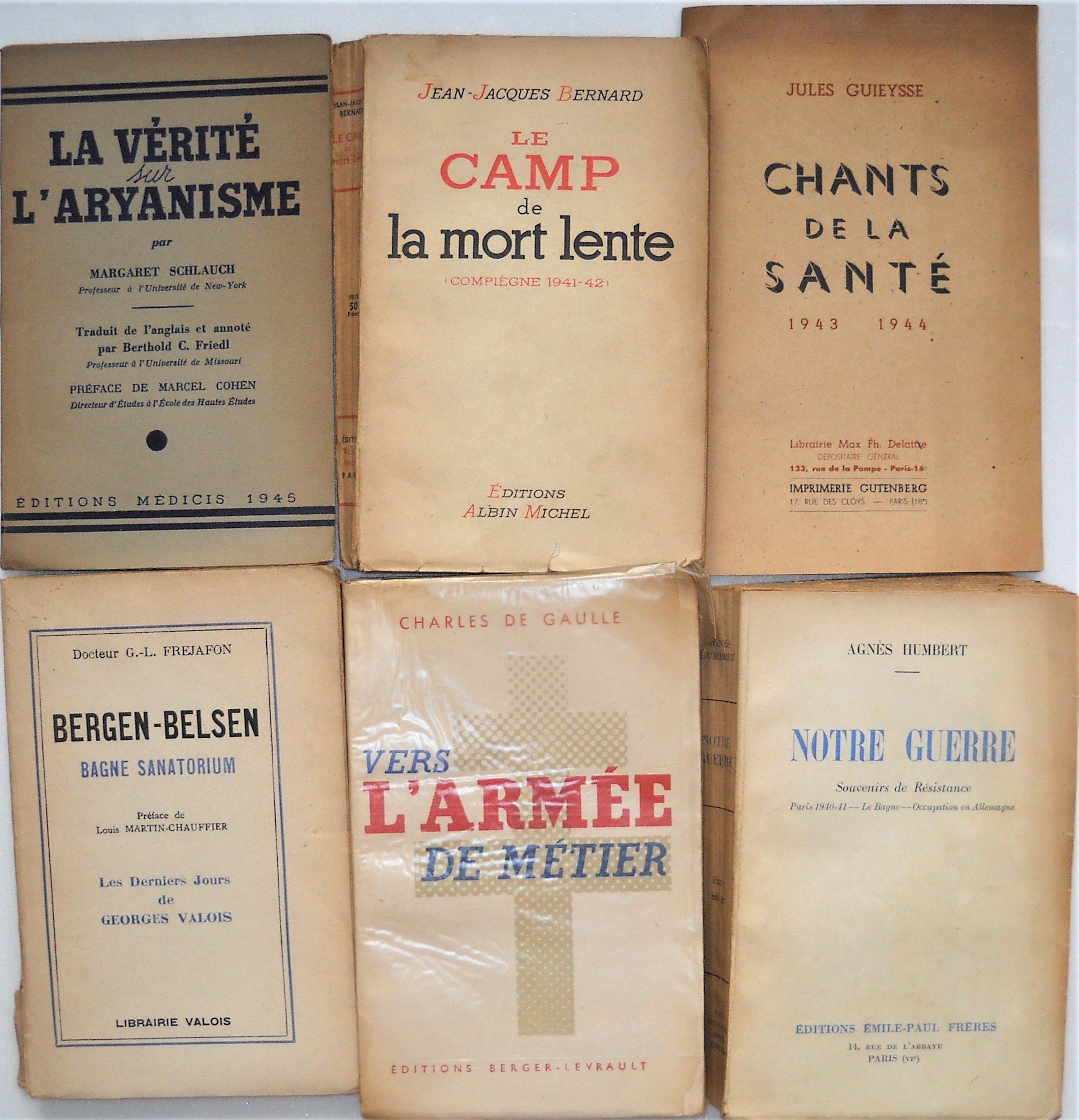 Charles de GAULLE: La France et son armée, Librairie Plon, 1938, br. in-12, 275 pages (en létat) ; Vers larmée de métier, Editions berger-Levrault, 1944, br. in-12, 230 pages ; Adolf HITLER, Extraits de Mein Kampf accompagnés de commentaires, Les Belles Editions, Paris, br. in-12, 157 pages ; POLLUX, Criminels de guerre! Derrières les coulisses