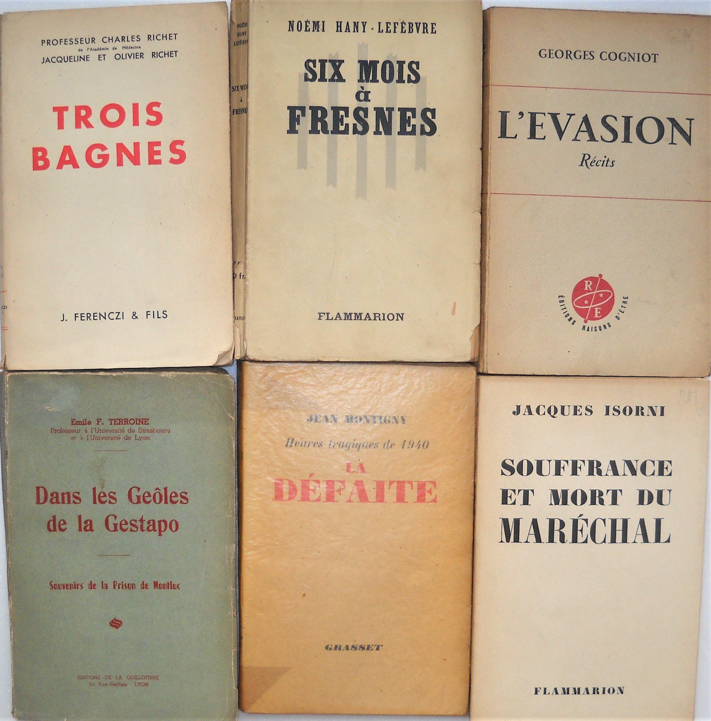Souvenirs de cinq années à Londres, La Jeune Parque, 1945, br. in-12, 313 pages ; Jacques ISORNI: Le procès de Robert Brasillach, Flammarion, 1946, in-8 br., 217 pages, Ex. S.P. Envoi autographe signé. ; Souffrance et mort du maréchal, Flammarion, 1951, in-8 br., 334 pages, Ex. S.P. Envoi autographe signé ; Noémi HANY-LEFEBVRE, Six mois à Fresnes, Flammarion, 1946, br. in-12, 251 pages. Exemplaire Service Presse. Envoi autographe signé ; Alfred GERNOUX, Chateaubriant et ses martyrs, Editions du Fleuve, Nantes, 1946, br. in-12, 310 pages (en létat) ; Agnès HUMBERT, Notre guerre Souvenirs de résistance, Editions Emile-Paul Frères, Paris, 1946, broché in-12, 412 pages. Envoi autographe signé et daté ; Lucien SCHELER (préface), Lettres de fusillés, Editions France dAbord, 1946, br. in-8, 191 pages. (2 exemplaires) ; Roger REGIS, La résistance par lhumour. Les édit. de Paris, 1947, in-8 couv. souple, 31 pages. Envoi autographe signé ; Georges COGNIOT, Lévasion Récits, Editions Raisons dEtre, 1947, broché in-12, 239 pages. Envoi autographe signé ; Jean CASSOU, Le pillage par les Allemands des uvres dart et des bibliothèques appartenant à des Juifs en France, Editions du Centre, Paris, 1947, br. in-8, 267 pages ; G.-L. FREJAFON, Bergen-Belsen, bagne sanatorium, Librairie Valois, 1947, br. in-12, 89 pages ; Esther FELDMAN, Mon Fils, Valentin Feldman, 1909-1942, Paris, chez lauteur, 1948, br. in-12, 75 pages. Ex. n°300. Envoi signé et daté « A monsieur Maublanc / en souvenir de tous les héros et de toutes les victimes de la guerre 1939-1945 ». [Un recueil de poèmes, en forme d'hommage à l'écrivain, enseignant, agrégé de philosophie, membre des Francs-Tireurs et Partisans français, Groupe du Musée de l'Homme, fusillé au Mont-Valérien le 27 juillet 1942.] ; Collection « Mémorial Exemples »: Guy Moquet ; Raymond Losserand ; Arthur Dallidet ; La grève héroïque des mineurs en 1941 ; 1949, 4 plaquettes in-8. [Elaborées et imprimées par le comité central communiste français en décembre 1949 à 5000 exemplaires, les quatre premières plaquettes devaient inaugurées une série de brochures populaires sur les héros communistes de la Résistance. Or, 8 jours après, le Bureau politique ordonne la mise au pilon de lensemble du tirage et darrêter la publication de ces brochures.]