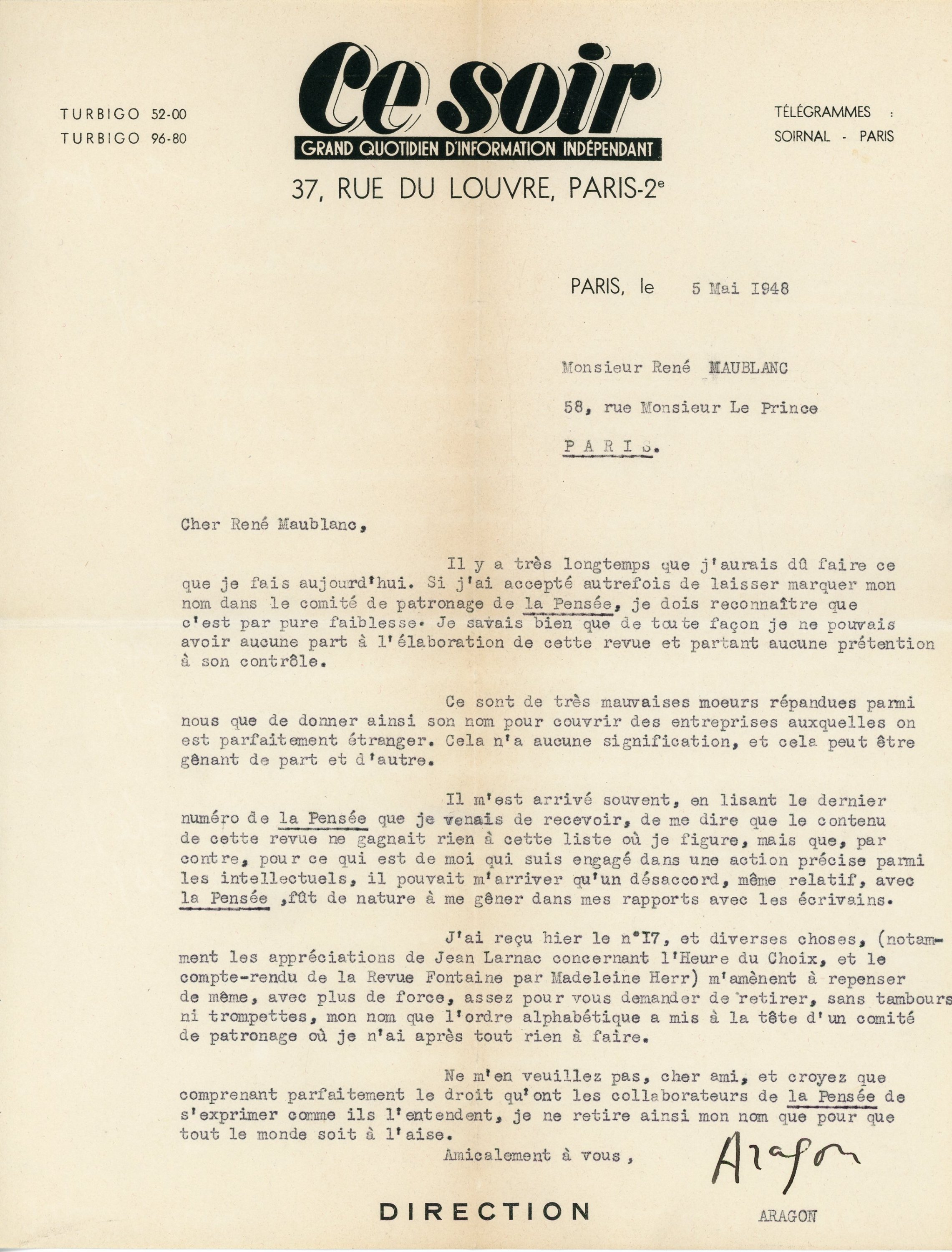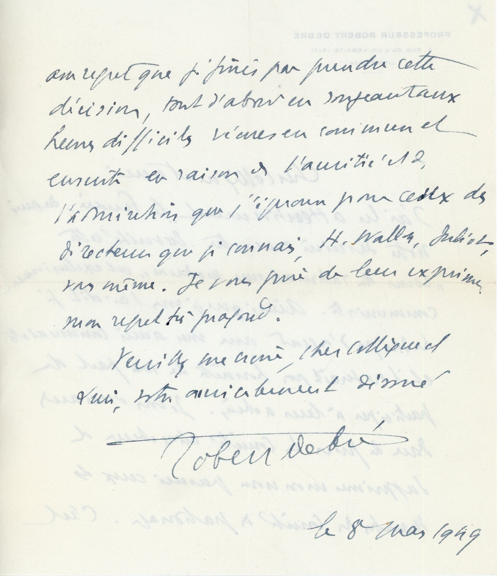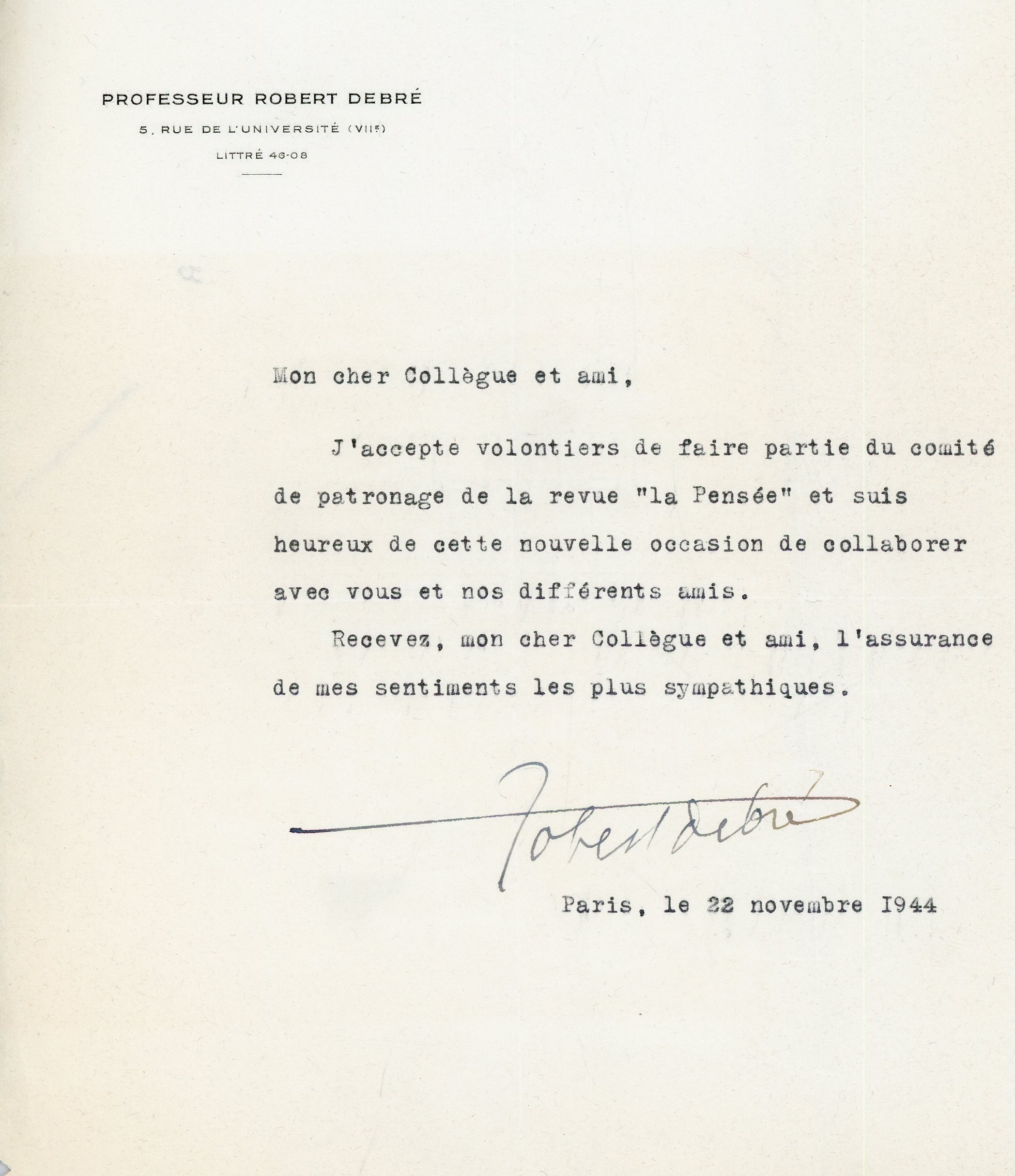 Littéraires: Pierre ABRAHAM écrivain et journaliste, (15 p.) ; Pierre ALBOUY professeur à la faculté de lettres à Paris (13 p.) ; Prosper ALFARIC professeur d’histoire des religions (16 p.) ; René ARCOS écrivain et poète (6 p.) ; Pierre ANGRAND historien et critique littéraire, résistant (21 p.) ; Claude AVELINE écrivain, poète et résistant (7 p.) ; Jean BABY agrégé d’histoire (11 p.) ; Gilbert BADIA journaliste et historien (8 p.) ; Marcelle BARJONET agrégée de philosophie et résistante (18 p.) ; Albert BAYET agrégé de lettres et sociologue (3 p.) ; Julien BENDA philosophe et écrivain (3 p.) ; Samuel BERNSTEIN historien (2 p.) ; Guy BESSE philosophe, directeur des Editions Sociales et résistant (37 p.) ; André BONNARD helléniste à l’université de Lausanne, écrivain vaudois (23 p.) ; Robert BOUDRY écrivain (4 p.) ; Georges BOURGIN historien (8 p.) ; Robert BRÉCY historien (9 p.) ; Jean BRUHAT agrégé d’histoire (18 p.) ; Madeleine BRUNELLE agrégée de lettres (11 p.) ; Claude CAHEN historien et orientaliste (14 p.) ; Maurice CAVEING philosophe (9 p.) ; Jean CAZALBOUE écrivain et journaliste (2 p.) ; Félicien CHALLAYE philosophe ; Marcel COHEN (professeur en langues orientales et résistant (55 p.) ; Auguste CORNU agrégé d’allemand (38 p.) ; Marcel CORNU agrégé de lettres et résistant (56 p.) ; Pierre DARMANGEAT hispaniste (7 p.) ; Jean DAUTRY historien et résistant (53 p. ) ; Jean DELORME bibliste (5 p.) ; Roland DESNÉ philosophe et écrivain (12 p.) ; Jean DRESCH géographe (13 p.) ; Raoul DUBOIS instituteur (8 p.) ; Robert FRANCÈS philosophe (7 p.) ; Georges FRIEDMANN sociologue (3 p.) ; Pol GAILLARD auteur de théâtre et scénariste (40 p.) ; Roger GARAUDY philosophe (4 p.) ; Jacques GAUCHERON poète, philosophe et résistant (19 p.) ; Pierre GEORGE géographe et syndicaliste (18 p.) ; Jules GUIEYSSE instituteur et (4 p.) ; Serge-Simon HELD écrivain (3 p.) ; Marie LAHY-HOLLEBECQUE pédagogue et essayiste (3 p.) ; Irving Louis HOROWITZZ sociologue américain (2 p.) ; Jean KANAPA philosophe, responsable de la revue marxiste « La Nouvelle Critique » (34 p.) ; Paul JAMALTI poète ; Renaud de JOUVENEL écrivain et polémiste (27 p.) ; Bernard KAYSER, sociologue et géographe ; Jean LARNAC, romancier et critique littéraire (36 p.) dont longue L.A.S. du 23 juillet 1946 rendant hommage à Henri MOUGIN, philosophe décédé le 11 juillet 1946 ; Henri LEFEBVRE sociologue et résistant (23 p.) ; Ossip Davidovitch LOURIÉ écrivain russe (2 p.) ; Gérard LYON-CAEN, juriste (12 p.) ; Philippe MALRIEU professeur de philosophie et résistant (14 p.) ; Pierre Bernard MARQUET professeur de lettres et journaliste (11 p.) ; Jean MASSIN musicologue (3 p.) ; Paul MEIER professeur de lycée (38 p.) ; Ignace MEYERSON psychologue (2 p.) ; Gérard MILHAUD philosophe (6 p.) ; Henri MITTERAND écrivain ; Sylvain MOLINIER professeur d’histoire au lycée Henri IV (24 p.) ; Edouard MONOD-HERZEN philosophe et collectionneur d’art (8 p.) ; Stefan MORAWSKI philosophe polonais (4 p.) ; Pierre MORHANGE philosophe et poète (6 p.) ; Claude MOSSÉ historienne (7 p.) ; Georges MOUNIN linguiste (51 p.) ; Léon MOUSSINAC écrivain et journaliste (6 p.) ; Gilbert MURY sociologue (24 p.) ; Charles PARAIN historien (126 p.) ; André PARREAUX professeur d’anglais (18 p.) ; Jean PÉRUS professeur agrégé de lettres à Clermont-Ferrand et résistant (13 p.) ; Denis RICHET historien (2 p.) ; Maxime RODINSON bibliothécaire et anticolonialiste (38 p.) ; Charles de ROUVRE écrivain (6 p.) ; Georges RUDÉ historien marxiste britannique (2 p.) ; Fernande SECLET-RIOU professeur, syndicaliste, pédagogue, membre du comité de la rédaction de La Pensée (16 p.) ; Lucien SÈVE philosophe marxiste (4 p.) ; Georges SNYDERS philosophe (7 p.) ; Albert SOBOUL historien et résistant (58 p.) ; Marc SORIANO agrégé de philosophie, romancier et psychanalyste, résistant (64 p.) ; Jean SURET-CANALE géographe, syndicaliste et résistant (33 p.) ; Emile TERSEN historien et résistant (16 p.) ; Jean TRICART géographe (2 p.) ; Jean VARLOOT agrégé en littérature et chercheur au CNRS, résistant (19 p.) ; Jean-Pierre VERNANT historien et anthropologue (11 p.) ; Charles VILDRAC poète ; Louis de VILLEFOSSE journaliste et écrivain (3 p.) ; Henri WEBER historien et syndicaliste et (16 p.).
