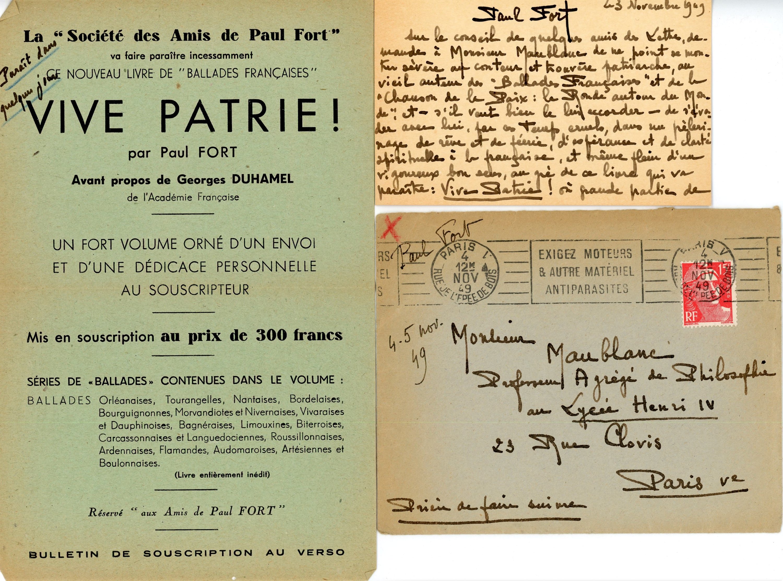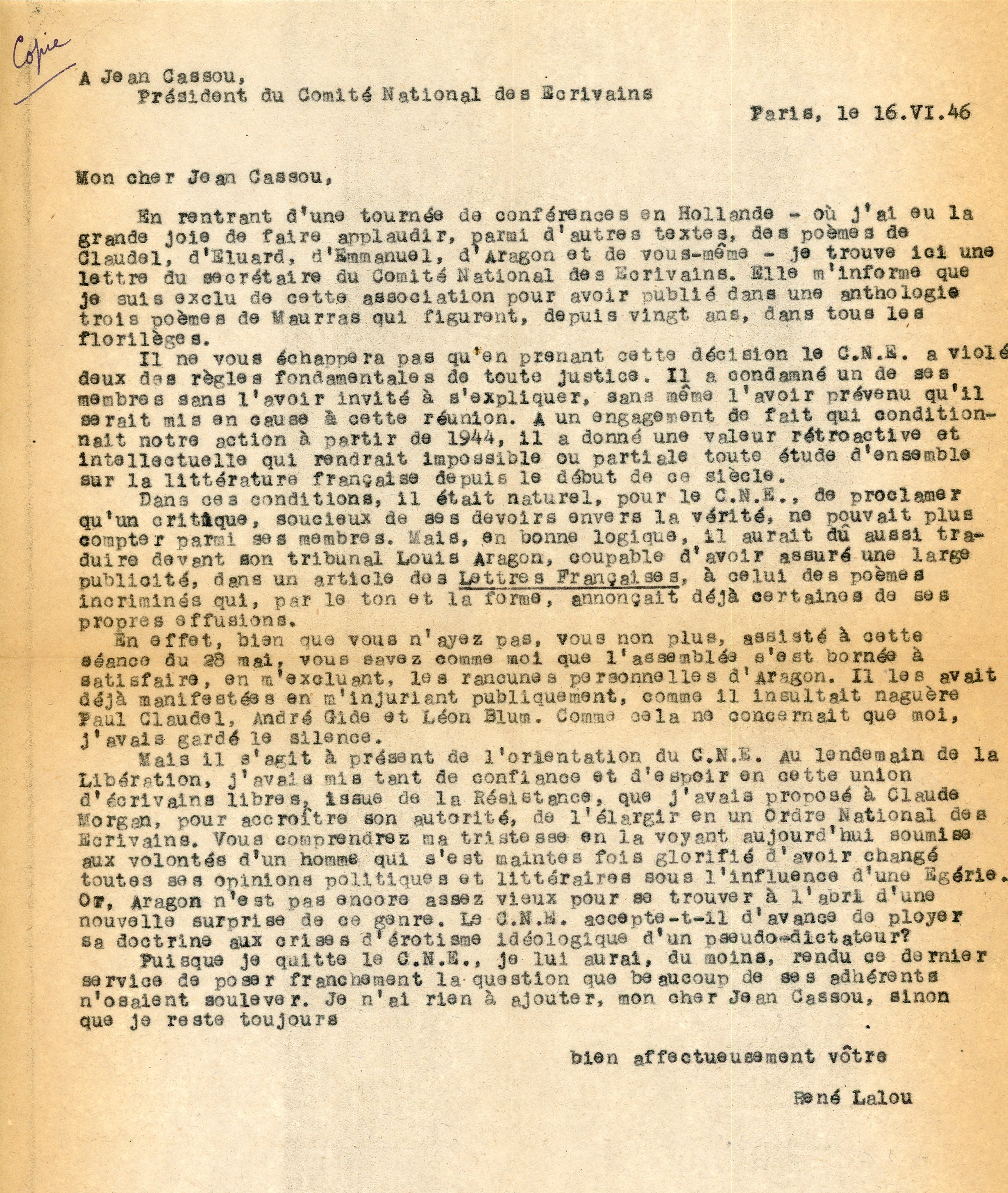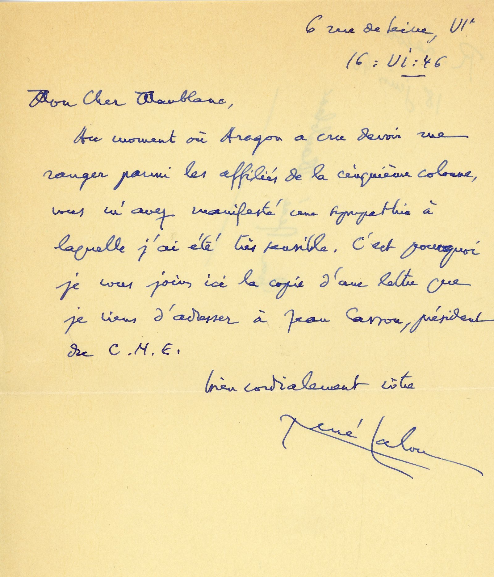 - Env. 110 L.A.S., P.A.S. et L.S., 1938-1959, journalistes, écrivains, historiens, poètes: Prosper ALFARIC, poète, 2 poèmes inédits tapuscrits: « Elfes en liesse » et « Le roi des elfes » ; Jean ARNAUD-DURAND, poète ; Robert ARON, directeur des services universitaires aux Editions Albin Michel ; Claude BELLANGER, fondateur du Parisien Libéré (2 p.) ; Vladimir BRETT, écrivain tchèque ; Emile BURÉ, directeur du journal LOrdre ; Robert BOUDRY ; Philip BUTLER ; Suzanne de CALLIAS ; Albert CAZES ; Albert CHAMBON, résistant et diplomate, correspondance écrite de ses différents postes diplomatiques dont longue lettre de 1946 décrivant ses premières impressions de la découverte des Etats-Unis (8 p.) + env. 30 p. de la mère dAlbert Chambon, 1938-1939, au sujet de laide financière apportée par René Maublanc ; Paul CROUZET ; Pierre DAIX ; Paul DELANOUE (2 p.) ; Roland DESNÉ ; Paul FORT, poète ; Oscar FRIEDLANDER ; Sumako FUKAO, poétesse japonaise ; Ramon GUTHRIE (7 p.) ; René HILSUM, éditeur dAndré Breton ; Pierre KAST ; Nathan KATZ, poète alsacien ; Edmond KINDS (2 p.) ; René LALOU, dont copie tapuscrite de la lettre adressée à Jean CASSOU, président du Comité National des Ecrivains, au sujet de son exclusion du comité et des attaques menées contre Louis ARAGON ; Henri LAVILLE ; Rudolf LEONHARD, écrivain et communiste allemand dont argumentaire pour la création dune association française pour la démocratie en Allemagne et texte de sa conférence (juillet 1946) sur la culpabilité et la responsabilité de lAllemagne (4 p.) ; Umberto MEOLI ; Odette de MOURGUES (2 p.) ; Mario PACOR, journaliste italien (3 p.) ; Caio PRADO, historien brésilien ; Charles-Edmond PERRIN (2 p.) ; Jean PIOT, journaliste à lAurore ; Claude RANCHAL, auteur de « Le Cul du Pré » (3 p.) ; Norman RUDICH ; Paul de STOECKLIN ; Ben STOLTZFUS ; Dante Della TERZA ;