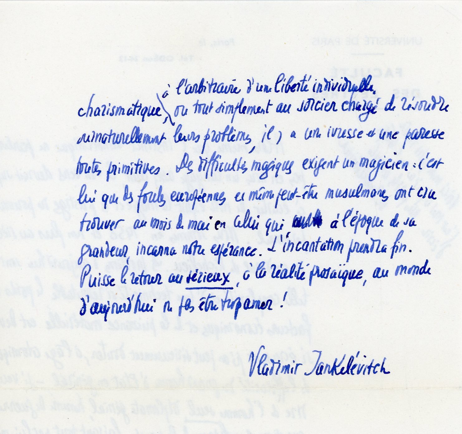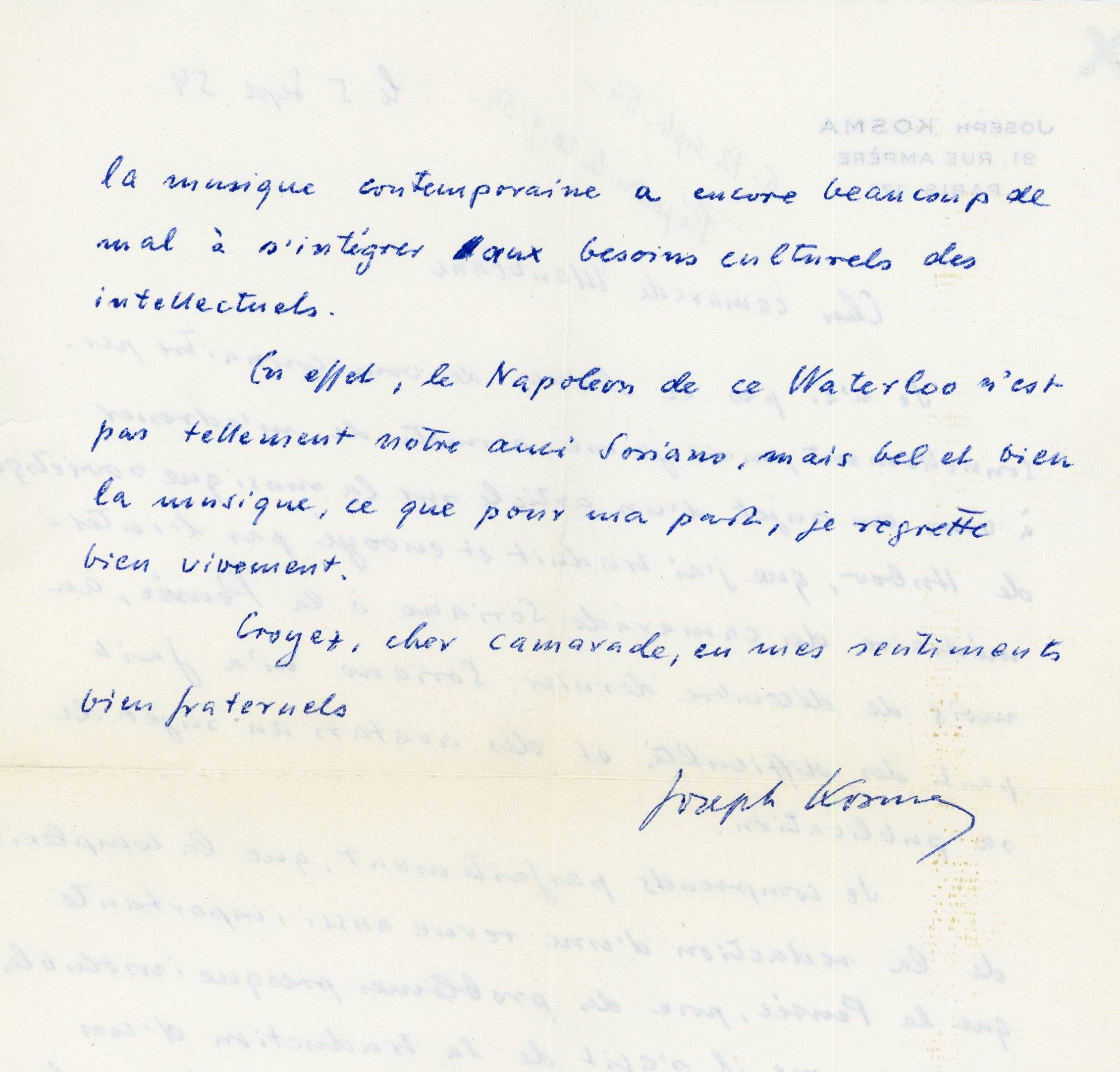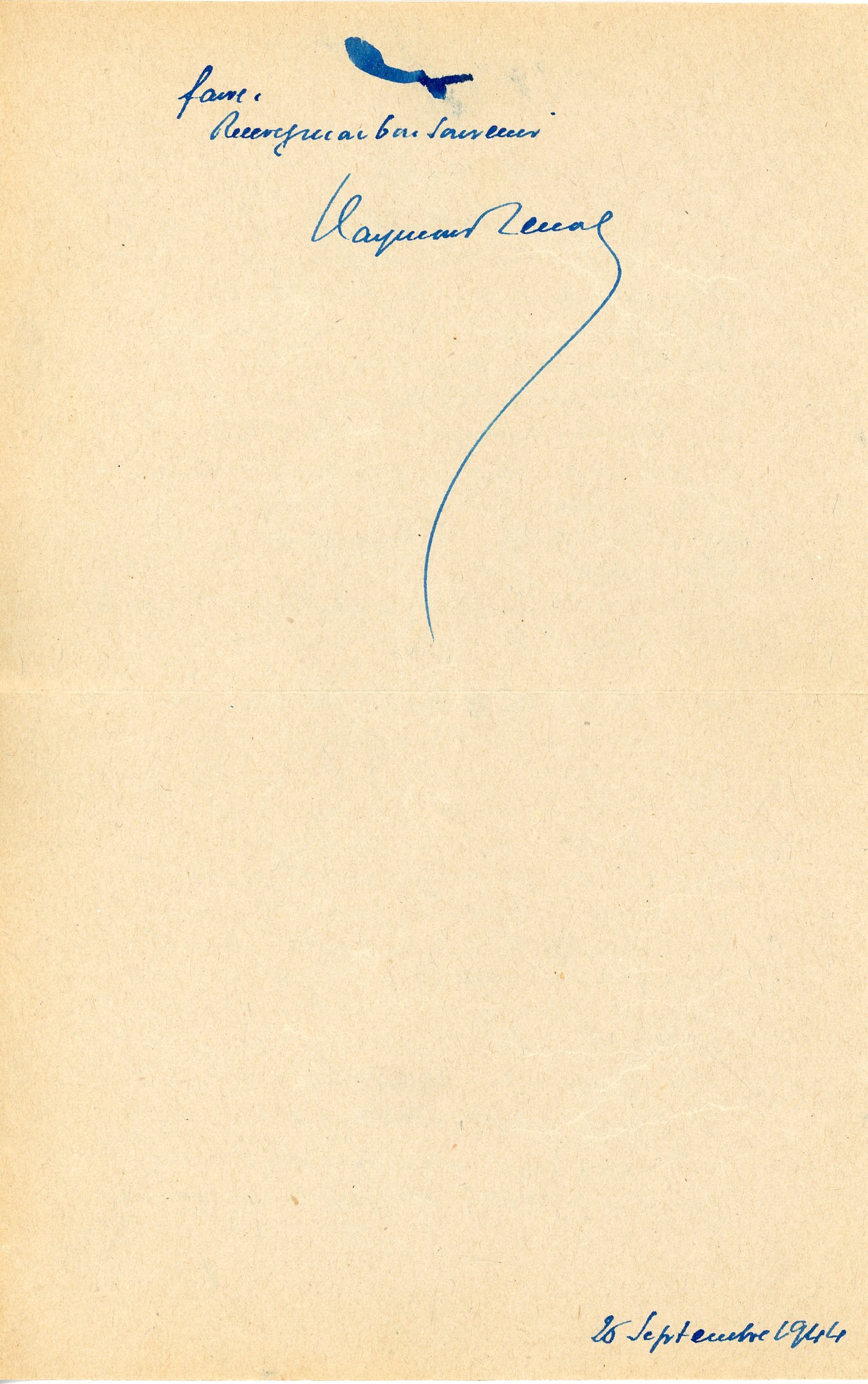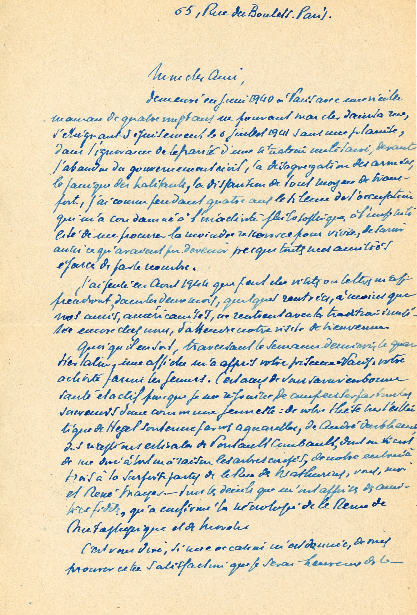- Env. 110 L.A.S., P.A.S. et L.S., 1938-1959, journalistes, écrivains, historiens, poètes: Prosper ALFARIC, poète, 2 poèmes inédits tapuscrits: « Elfes en liesse » et « Le roi des elfes » ; Jean ARNAUD-DURAND, poète ; Robert ARON, directeur des services universitaires aux Editions Albin Michel ; Claude BELLANGER, fondateur du Parisien Libéré (2 p.) ; Vladimir BRETT, écrivain tchèque ; Emile BURÉ, directeur du journal LOrdre ; Robert BOUDRY ; Philip BUTLER ; Suzanne de CALLIAS ; Albert CAZES ; Albert CHAMBON, résistant et diplomate, correspondance écrite de ses différents postes diplomatiques dont longue lettre de 1946 décrivant ses premières impressions de la découverte des Etats-Unis (8 p.) + env. 30 p. de la mère dAlbert Chambon, 1938-1939, au sujet de laide financière apportée par René Maublanc ; Paul CROUZET ; Pierre DAIX ; Paul DELANOUE (2 p.) ; Roland DESNÉ ; Paul FORT, poète ; Oscar FRIEDLANDER ; Sumako FUKAO, poétesse japonaise ; Ramon GUTHRIE (7 p.) ; René HILSUM, éditeur dAndré Breton ; Pierre KAST ; Nathan KATZ, poète alsacien ; Edmond KINDS (2 p.) ; René LALOU, dont copie tapuscrite de la lettre adressée à Jean CASSOU, président du Comité National des Ecrivains, au sujet de son exclusion du comité et des attaques menées contre Louis ARAGON ; Henri LAVILLE ; Rudolf LEONHARD, écrivain et communiste allemand dont argumentaire pour la création dune association française pour la démocratie en Allemagne et texte de sa conférence (juillet 1946) sur la culpabilité et la responsabilité de lAllemagne (4 p.) ; Umberto MEOLI ; Odette de MOURGUES (2 p.) ; Mario PACOR, journaliste italien (3 p.) ; Caio PRADO, historien brésilien ; Charles-Edmond PERRIN (2 p.) ; Jean PIOT, journaliste à lAurore ; Claude RANCHAL, auteur de « Le Cul du Pré » (3 p.) ; Norman RUDICH ; Paul de STOECKLIN ; Ben STOLTZFUS ; Dante Della TERZA ;