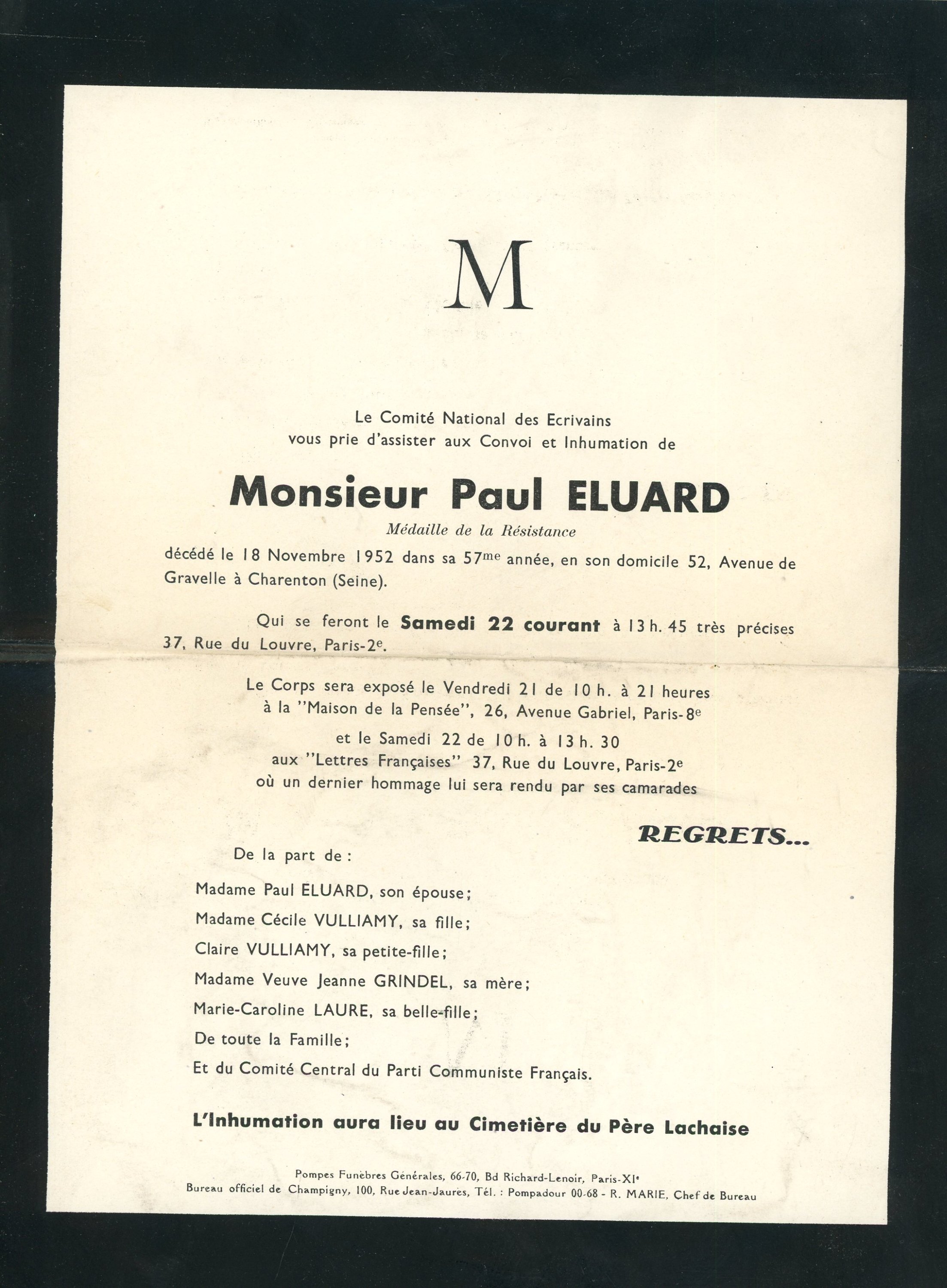 Réunion de + de 380 faireparts de décès, mariage et naissance, et + de 450 cartes de visite reçus par René Maublanc et son épouse, dont: Léon ROSENTHAL, Marc PATIN, Paul LANGEVIN, Paul ELUARD, Francis JOURDAIN, Albert DOYEN, André CHENNEVIERE, Jean-Richard BLOCH, Prosper ALFARIC, Marcel CACHIN, Marcel WILLARD, Irène JOLIOT-CURIE, Paul BOUTHONNIER, Georges GRAMMONT, le prince SEVASTOS, Roger LEGRIS, Albert CAZES, Lucien LEVY-BRUHL, Claude-André PUGET, Jean BUHOT, Jean SARMENT, Charles SEIGNOBOS, Théodore BECK, etc.