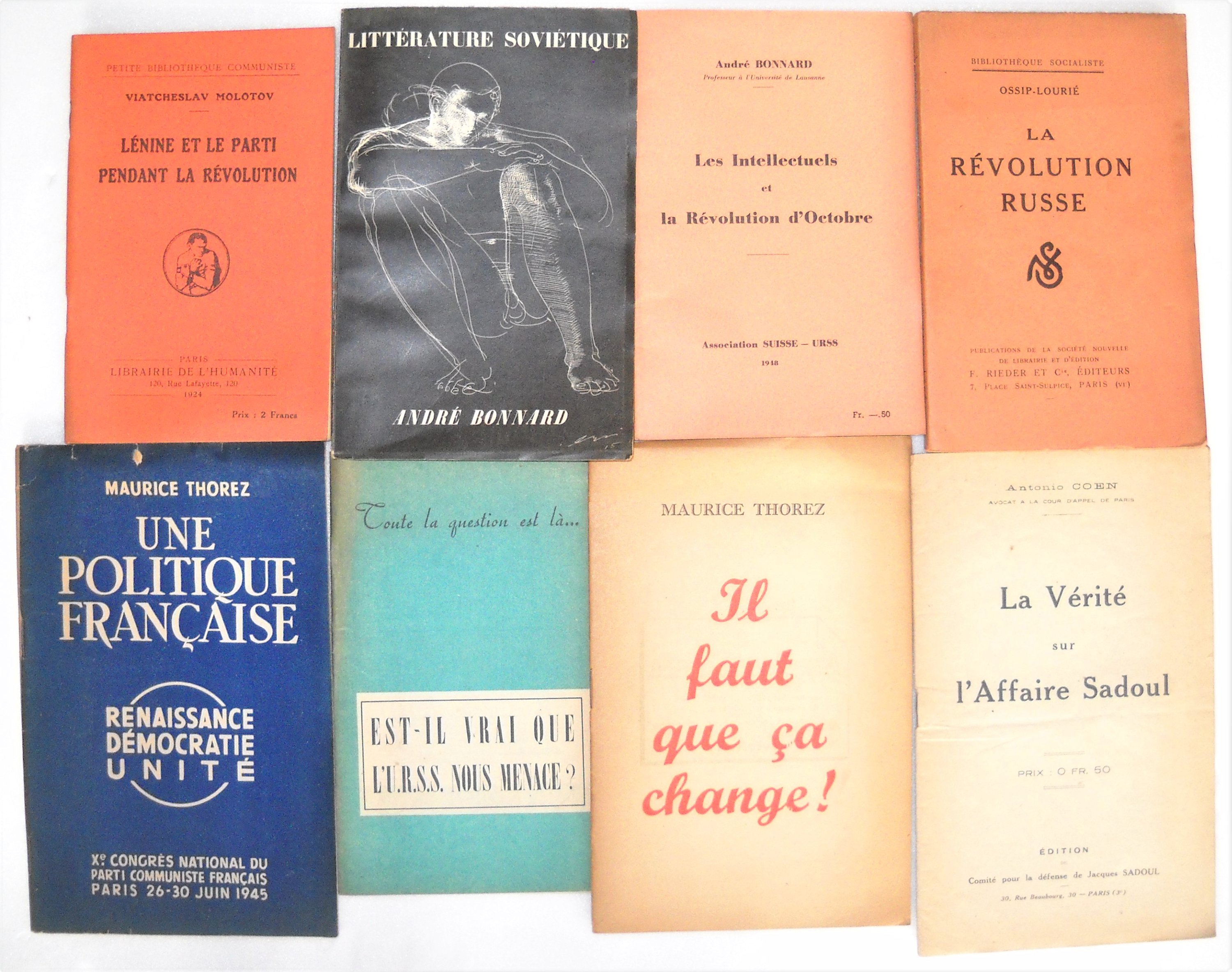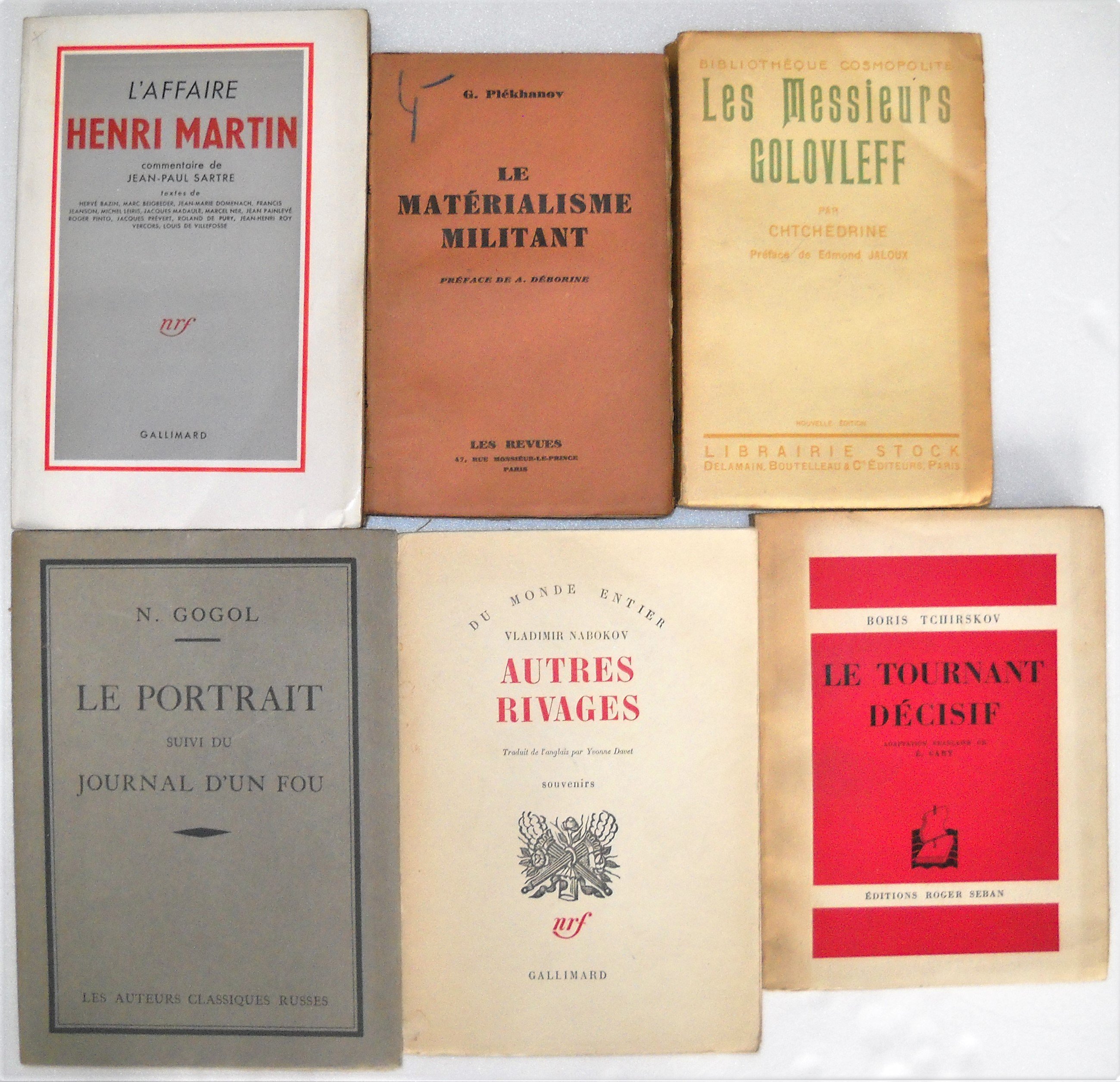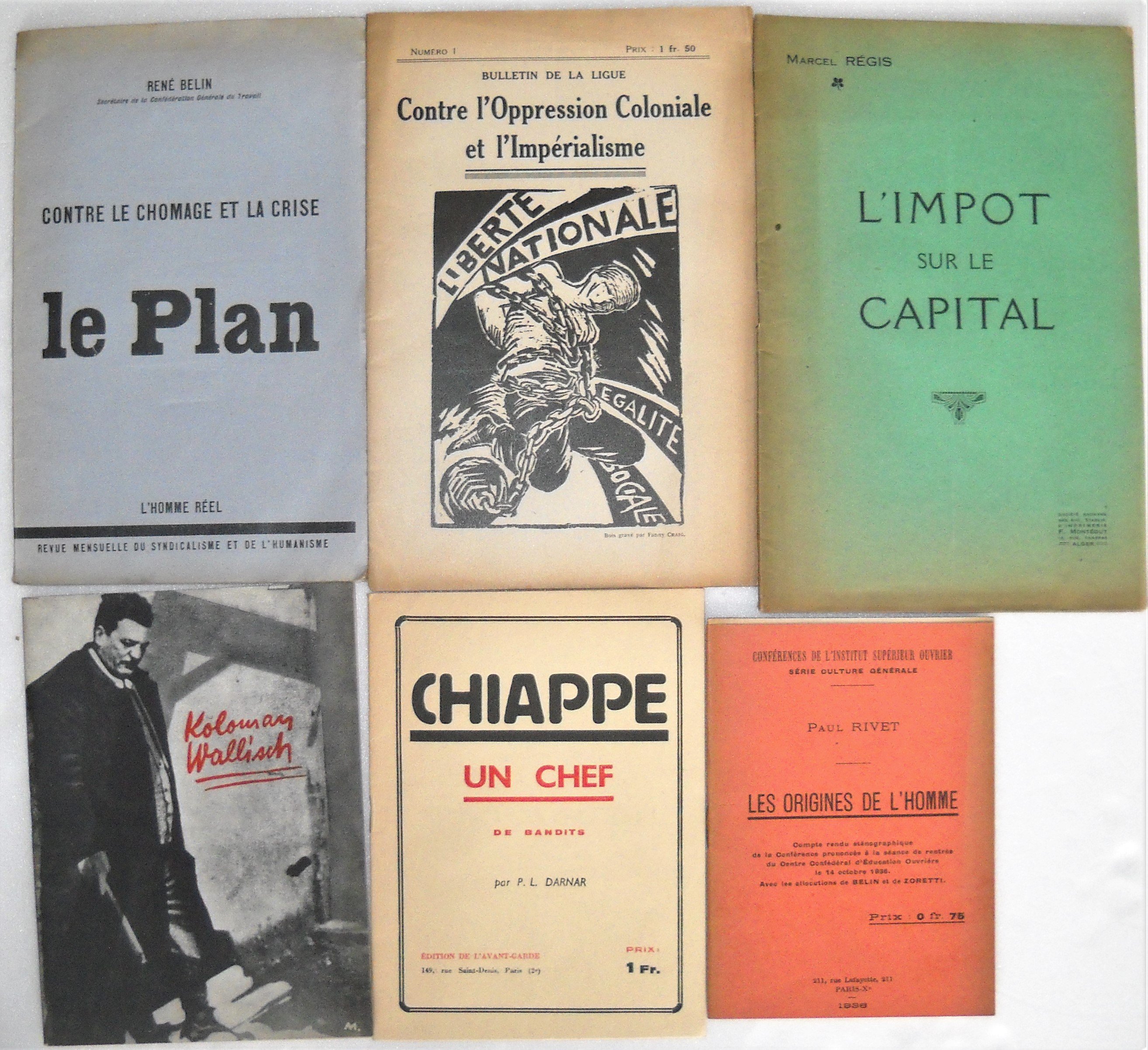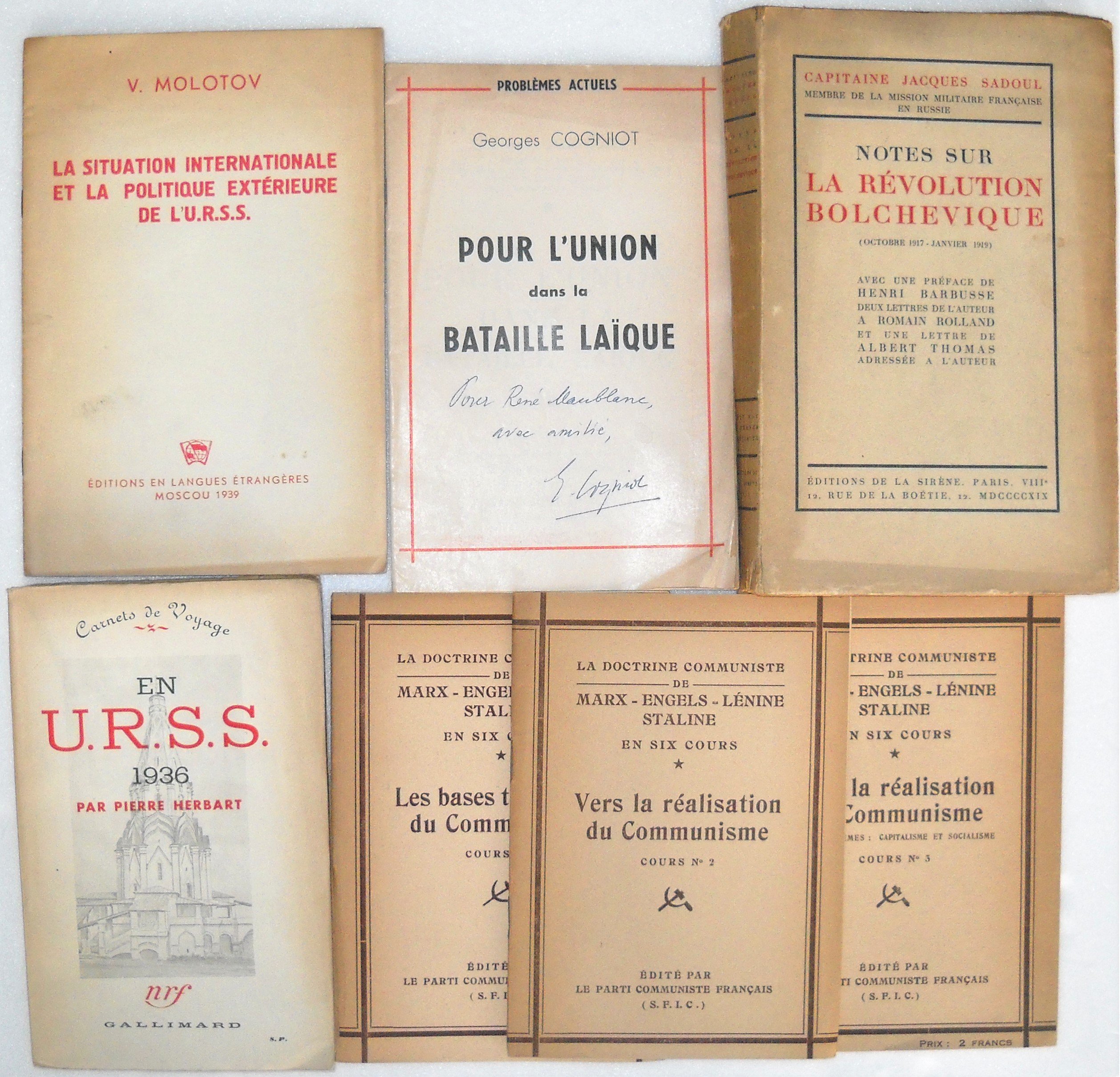 Capitaine Jacques SADOUL, Notes sur la révolution bolchévique (octobre 1917 – janvier 1919), préface d’Henri Barbusse, Editions de la Sirène, Paris, 1919 ; broché in-8, 465 pages. – Antonio COEN, La vérité sur l’affaire Sadoul, Edition du comité pour la défense de Jacques Sadoul, c. 1919, plaquette in-8, 31 pages. – Koloman Wallisch, Défense éditions, Paris, c. 1920, plaquette in-12, 32 pages. – OSSIP-LOURIÉ, La révolution russe, bibliothèque socialiste, F. Rieder & Cie, 1921, broché in-12, 121 pages. – CHTCHEDRINE, Les messieurs Golovleff, Librairie Stock, 1922, in-8 br., 400 pages. – Marcel RÉGIS, L’impôt sur le capital, Alger, 1921, plaquette in-4, 25 pages – n°1 et numéro spécial du « Bulletin de la Ligue contre l’oppression coloniale et l’impérialisme », 1927 – Le programme de l’Internationale communiste, supplément gratuit de l’L’Humanité du 20 décembre 1928 – Nicolas GOGOL: L’inspecteur général, Librairie Hatier, collection étrangère, 1927, in-12 br., 80 pages ; Le Portrait suivi du Journal d’un fou, Collection « Les auteurs classiques russes », Editions de la Pléiade, 1929, in-8 broché, 225 pages, ex. hors commerce. – G. PLEKHANOV, Le matérialisme militant, Les Revues, Paris, 1930, br. in-12, 226 pages. – A. RAFFALOVITCH, L’abominable vénalité de la presse d’après les documents des archives russes (1897-1917), Librairie du travail, Paris, 1931, br. in-8, 450 pages. – L’U.R.S.S. à la conférence du désarmement, Textes et documents, Paris, 1932, broché in-8, 219 pages. – Joseph DUBOIS, U.R.S.S. une nouvelle humanité, Librairie Valois, 1932, broché in-12, 310 pages. – Félicien CHALLAYE, Les origines de la Guerre Mondiale – Les responsabilités russes et françaises, chez l’auteur, Paris, [1933], plaquette in-8, 31 pages. Envoi autographe signé. – Pour l’unité d’action! – Lettre ouverte à l’Internationale communiste, « Les communistes de St Denis et les événements du 6 au 12 février », préface de Jacques DORIOT, 1934, plaquette in-12, 31 pages (double exemplaire) + lettre tapuscrite du 5 mai 1934, 1 page in-4 – n°4 du 25 novembre 1935 « L’éducateur prolétarien », revue pédagogique bimensuelle, Editions de l’imprimerie de l’Ecole, Vence – n°19 du 19 janvier 1935 « Reportages des grandes conférences de Paris ». – René BELIN, Contre le chômage et la crise, la Plan, dans la revue mensuelle du syndicalisme « L’Homme Réel », juin 1935