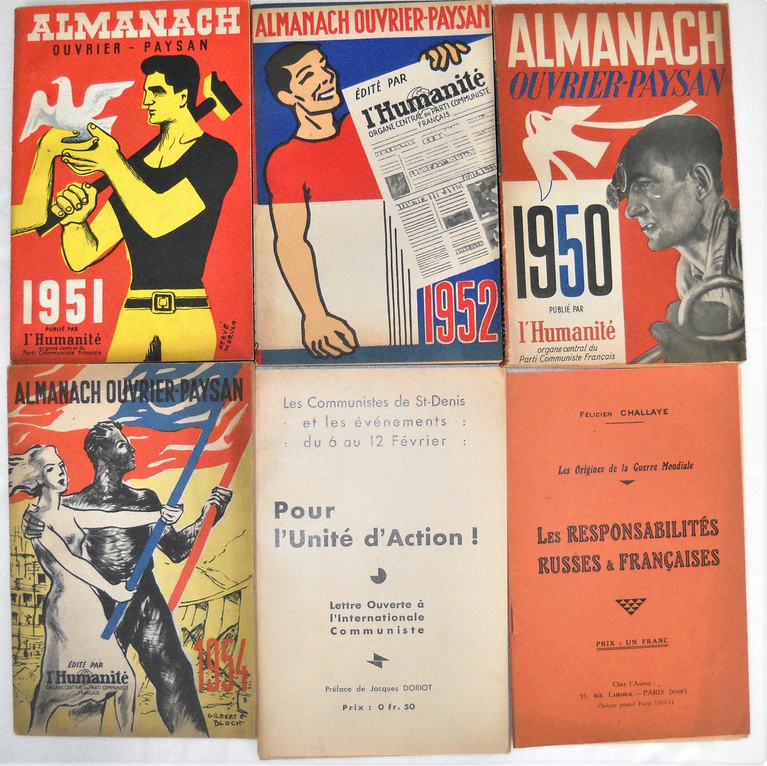 Réponse au congrès de la cause qui avait pour thème: le communisme contre la chrétienté, la chrétienté contre le communisme, 1936, plaquette in-8, 32 pages. – Thomas-R. AMLIE, Les Etats-Unis sur le chemin de l’abondance, collection Ligue du droit au travail, Editions Fustier, Paris, 1936, br. in-12, 64 pages – Le droit National-Socialiste – Conférence internationale tenue à Paris les 30 novembre et 1er décembre 1935, Librairie des sciences politiques et sociales, Marcel Rivière, 1936, br. in-12, 244 pages. Envoi autographe signé de Marcel WILLARD. – Paul RIVET, Les origines de l’homme, Paris, 1936, plaquette in-16, 32 pages. – Pierre-Laurent DARNAR, Chiappe un chef de bandits, Edition de l’Avant-Garde, 1936, plaquette in-12, 30 pages. – Unité pour l’aide et la défense, n°1 et 2, janvier et février 1936, Editions Universelles, Paris – Pierre HERBART, En U.R.S.S. 1936, Carnets de voyage, N.R.F., Gallimard, 1937, 173 pages. Ex. S.P. – La crise internationale de septembre 1938, l’enchainement des faits, n°1 de décembre 1938 « Cahiers d’informations françaises » - Viatcheslav MOLOTOV: Lénine et le parti pendant la révolution, Petite bibliothèque communiste, Paris, Librairie de l’Humanité, 1924, plaquette in-12, 72 pages. ; La situation internationale et la politique extérieure de l’U.R.S.S., Editions en langues étrangères, Moscou, 1939, plaquette in-8, 15 pages. – La doctrine communiste de Marx, Engels, Lénine, Staline en six cours – Les bases théoriques du Communisme, cours n°1, édité par le parti communiste français, s. d., plaquette in-12, 28 pages. ; Vers la réalisation du Communisme, cours n°2, édité par le parti communiste français, décembre 1940, plaquette in-12, 33 pages. ; Vers la réalisation du Communisme, cours n°3, édité par le parti communiste français, décembre 1940, plaquette in-12, 46 pages. – « Cahiers du Bolchévisme », 3e trimestre 1940 – Jacques DUCLOS, Vive l’unité de la classe ouvrière de France, Xe congrès national du parti communiste français, juin 1945, Editions du parti communiste, 1945, plaquette in-8, 40 pages. – Jean BRUHAT, Lénine, fondateur de l’U.R.S.S., sa vie et son œuvre, éditions France-URSS, Comité du 14e, Paris, 1945, plaquette in-8, 32 pages. Envoi autographe signé et daté. – Jean FREVILLE, Lénine, Editions des Trois collines, 1947, rel. in-12, 163 pages.