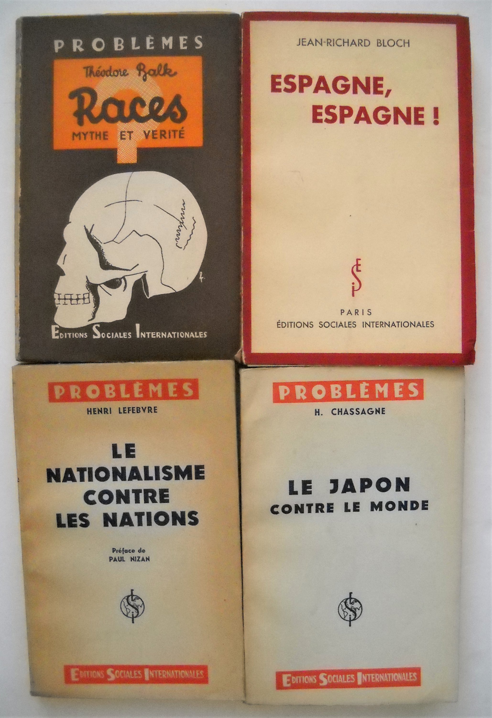 Collection « Problèmes »: Georges FRIEDMANN, Problèmes du machinisme en U.R.S.S. et dans les pays capitalistes, 1934, 135 pages. Envoi autographe signé. Lucien HENRY, Les origines de la religion, 1935, 300 pages. Théodore BALK, Races, mythe et vérité, 1935, 224 pages. Agnès HUMBERT, Louis David, peintre et conventionnel, 1936, 175 pages. Ex. S.P. Envoi autographe signé et daté. Pierre DEROCLES, Saint-Just, ses idées politiques et sociales, 1937, 173 pages. Ex. S.P. Envoi autographe signé. Jules LEVERRIER, La naissance de larmée nationale, 1789-1794, 1939, 196 pages. Ex. S.P. Charles HAINCHELIN (H. CHASSAGNE, dit), Coblence 1789-1792, des Français au service de létranger, 1939, 228 pages. Exemplaire Service Presse. ; Le Japon contre le monde, 1939, 271 pages. Ex. S.P. Envoi autographe signé. Henri LEFEBVRE, Le nationalisme contre les nations, 1937, 242 pages. Ex. S.P. Envoi autographe signé.