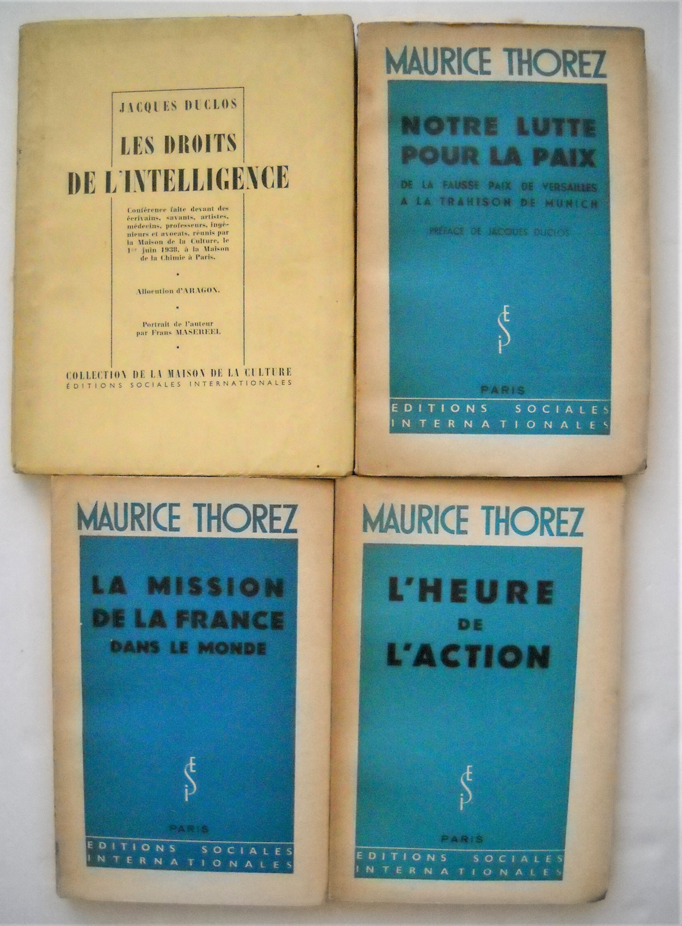 de Babeuf à Dimitrov, 1938, 344 pages. Ex. S.P. Envoi autographe signé. Jacques DUCLOS, Les droits de lintelligence, conférence faite à la maison de la Chimie à Paris le 1er juin1938, Coll. de la Maison de la culture, 1938, 90 pages. Elsa TRIOLET, Maiakovski, poète russe, souvenirs, 1939, 136 pages. Ex. S.P. Albert SOBOUL, 1789, lAn I de la liberté, 1939, 302 pages. Ex. S.P. Envoi autographe signé. Maurice THOREZ: La mission de la France dans le monde, 1938, 152 pages. Ex. S.P. ; Lheure de laction, 1938, 93 pages. Ex. S.P. ; Notre lutte pour la paix, 1938, 199 pages. Dolores IBARRURI (La Pasionaria), Pour la victoire, articles et discours 1936-1938, 1939, 250 pages. [Collectif] A la lumière du marxisme (essais), 1935, 312 pages. Ex. S.P. ; A la lumière du marxisme, Tome II Karl Marx et la pensée moderne, 1937, 240 pages. Ex. S.P. Alexandre ZEVAES, Histoire de la Révolution russe, tome 1, 1937, rel. in-8, 256 pages. Ex. S.P.