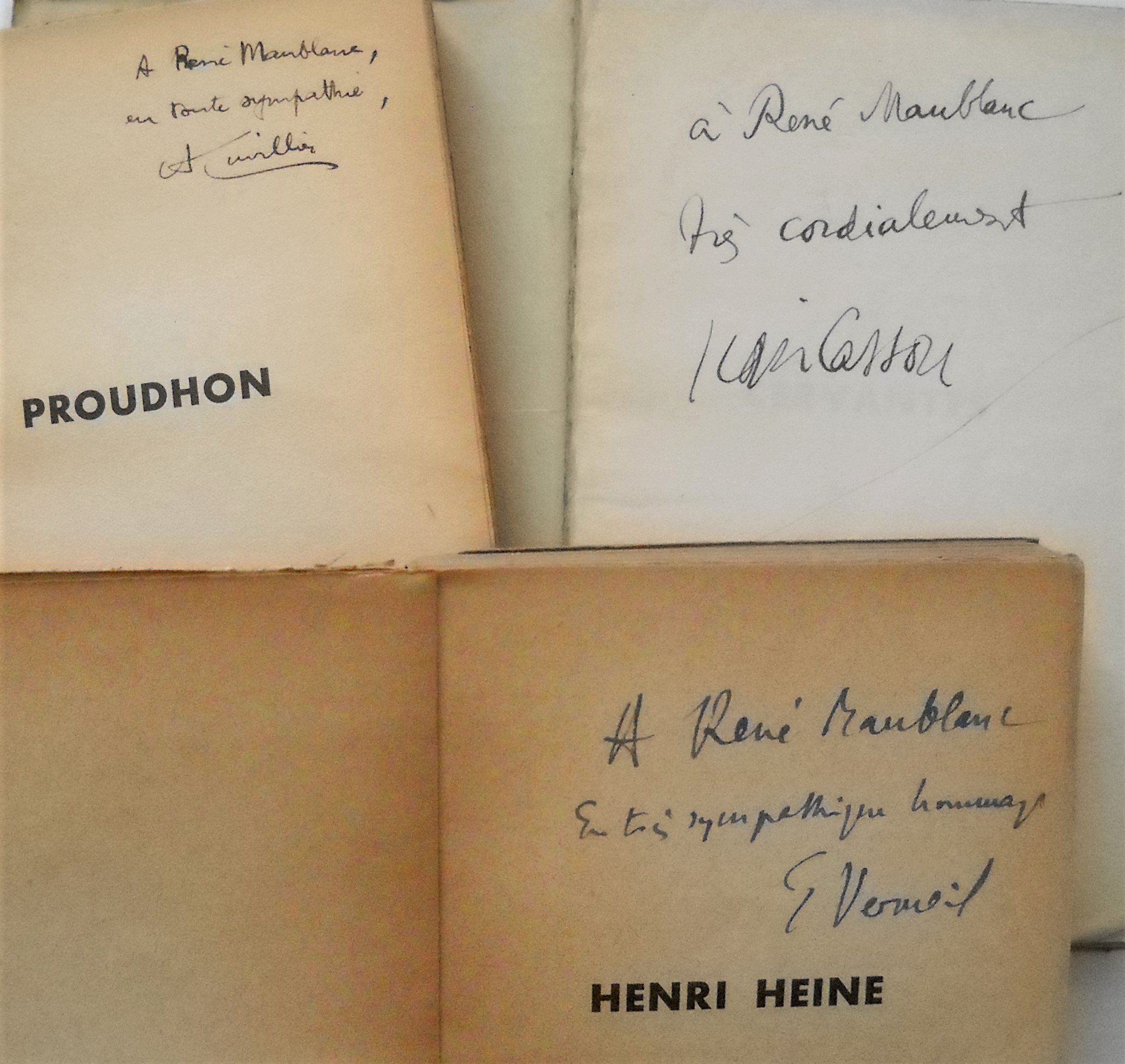 Collection « Socialisme et culture »: Jean CASSOU, Cervantès, 1936, broché in-12, 244 pages. Envoi autographe signé. (en létat) Armand CUVILLIER, Proudhon, 1937, 278 pages. Ex. S.P. Envoi autographe signé. Edmond VERMEIL, Henri Heine, ses vues sur lAllemagne et les révolutions européennes, 1939, 281 pages. Ex. S.P. Envoi autographe signé. Henri LEFEBVRE, Nietzche, 1939, 310 pages, Ex. S. P. Envoi autographe signé.